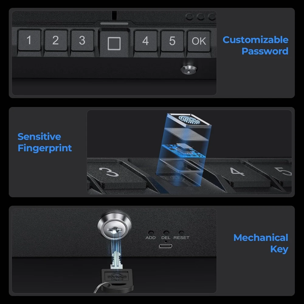 Biometric Gun Safe for Handgun - Fingerprint Pistol Safe with Internal Light,Three Unlock Methods,Gun Lock Box for Home,Bedside, Nightstand, and Car Use Fingerprint Gun Safe: Quick-access gun safe is absolutely important for a family. No matter to protect your handguns from your children or just to keep your items unaccessible while unsupervised. It's responsible to store them securely in this handgun safe and right where you need them. Biometrics keeps your contents secure with immediate accessibility. ONNAIS gun safe box helps you access the handgun safe quickly when you need it most and bring you more time when in danger Advanced Biometric Technology: ONNAIS gun safes for pistols are equipped with biometric fingerprint technology which is a proven method that is accurate and more secure than a traditional keypad lock and ensures single-handed access to your firearm device. A high-resolution fingerprint scanner allows access to your contents quickly. The fingerprint lock can store up to 30 user fingerprints for access by multiple users Tough and Large Capacity: Our handgun safe has solid steel construction and anti-corrosion for increased durability and ultimate protection. This gun safe lid is also pry-resistant and is powered by 4 AA batteries. Also, there is enough space to hold two standard size regular frame pistols or many small items. The interior is padded with soft foam to prevent scratches Portable and Three-Way Access: With portable design, you can keep this gun safe in a drawer, cabinet, luggage, or nooks and also place it at home, car, nightstand, or some other spot that's easy for you to use as a bedside handgun safe. ONNAIS biometric gun safe for pistols offers convenient 3-way access. Apart from the biometric option, you have keypad locks and 2 backup override keys which will make sure you can always access your guns Protect Your ONNAIS: We are committed to satisfying our customers with quality products and great customer service. If you have any concerns, please feel free to contact us directly. We're dedicated to giving you a satisfactory solution. Exterior Dimensions : 11.49" x 9.17" x 3.07", Interior Dimensions 10.63" x 6.69" x 2.91" Product Description Buy the Best Security Quick-Access Biometric Gun Safe Portable Design and Large Storage Capacity for 2 Pistols Premium Biometric Fingerprint Tech Access to the safe in less than 1.0s via high-resolution fingerprint scanner. Electronic Password Keypad Only one set of administrator password ( 5-10 digits ) can be set. Convenient and safe enough. Two Spare Flexible Keys Ensure access even in the event of a dead battery or electronic failure. 1 Premium Biometric Tech 2 Electronic Keypad 3 Spare Flexible Keys Keeping Your Safe in Your Life Place it in the room Quickly unlock in case of emergency to keep you safe. Store it in the drawer Provide fast and timely protection when you need it. Hang it on the wall Save storage space and get your weapons promptly. Take it to the car Protect you and your family during the journey . ———————————————————— When adding or deleting fingerprints need notice: When adding more fingerprints Be sure to add your digital password and administrator fingerprint successfully before adding more fingerprints . We suggest you try to add the edge of the fingers. You will hear 2 long beeps on the 6th time if adding successfully. When deleting fingerprint The indicator continues flashing red after you delete the fingerprint. Only one fingerprint can be deleted by clicking the delete button once. ———————————————————— Steps to set and cancel the mute mode: Please press the "OK" button 3 times in succession to mute the device . Please press the "OK" button 3 times in succession to restore the sound . PS: When the battery is low, 10 beeps will be emitted after unlocking to warn that the current safe is in a low battery state , and the battery needs to be replaced in time. ———————————————————— Please use the correct way to close the lid: Close the lid by pressing the "PUSH" position on the front of the lid PS: Please make sure to turn the key 90° counterclockwise and pull out the key before closing the lid Style Biometric Gun Safe Standard Package Weight 2.87 Kilograms Chamber Width 11 Inches Control Type Key Control Product Dimensions 9.17"D x 11.49"W x 3.07"H Material Alloy Steel Item Package Dimensions L x W x H 14.09 x 11.25 x 4.92 inches Included Components Gun safe box, Security cable, Mechanical key, Manual, 2 mounting screws Chamber Height 3 Inches Alarm anti-theft Water Resistance Level Not Water Resistant Item Weight 4.4 Pounds Lock Type Biometric, Electronic Combination Lock, Key Special Feature Biometric Fingerprint Part Number OGS008 Item Dimensions LxWxH 11.57 x 9.21 x 3.11 inches Mounting Type Floor Mount Color Black Chamber Depth 9 Inches Style Name Biometric Gun Safe Standard Shipping Fast shipping is very important for us. Our standard US shipping service is FREE. Your order will be shipped within 2-3 business days upon full payment received. Your order will be delivered within 2-3 business days after the handling time. We only ship to the confirmed PayPal address. We reserve the right to cancel any order for any reason at any time. We are not responsible for undeliverable addresses. Returns and payment We offer a 30 days return policy from checkout winning date. We allow only PayPal as payment method FeedBack Your feedback very important to us, after you get your package and you are satisfied with our service please leave us positive feedback If you have any problem with your order / any questions please before leave any type of feedback For any questions, using eBay contact system Please visit our eBay store to check out other items for sale! Thank you for shopping at our store.