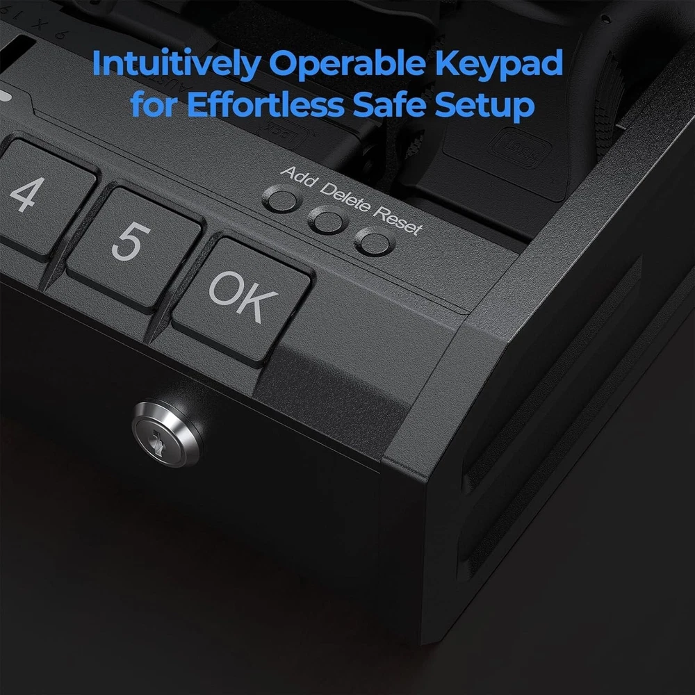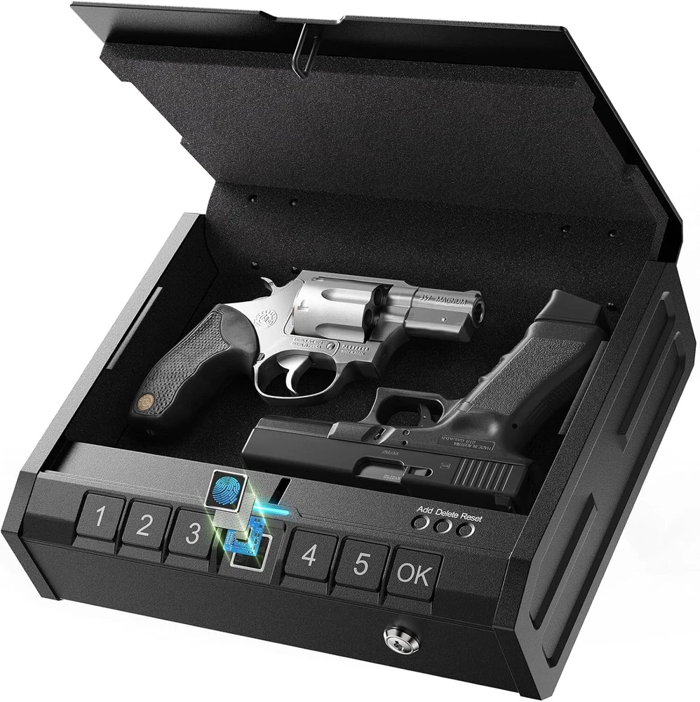 Biometric Gun Safe for Handgun - Fingerprint Pistol Safe with Internal Light,Three Unlock Methods,Gun Lock Box for Home,Bedside, Nightstand, and Car Use Convenient Fingerprint Access: With fingerprint access, gun safe allows for quick and secure entry with a simple touch. The biometric system ensures only authorized users can unlock it, providing fast, reliable access in critical moments while maintaining high security Battery Powered Convenience: Powered by batteries, this gun safe for handgun eliminates the need for external power sources, ensuring smooth functionality. With a long-lasting battery life, your firearms remain accessible at all times, without concerns about charging or power outages Dual Access System: This gun case combines electronic keypad entry with a reliable mechanical key lock, offering both speed and security. If the electronic system fails or batteries die, the mechanical key ensures you can still access your firearms quickly and safely Security Cable for Added Protection: The included security cable allows you to securely anchor the pistol safe to any fixed object, preventing unauthorized removal. This extra layer of protection ensures your firearms stay securely in place, providing peace of mind against theft Alloy Steel Construction: Made from tough alloy steel, this handgun safe is built to resist tampering and forced entry. The durable material ensures long-lasting protection, safeguarding your firearms from both physical threats and harsh environmental conditions