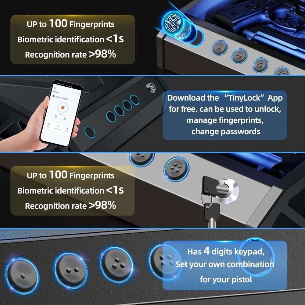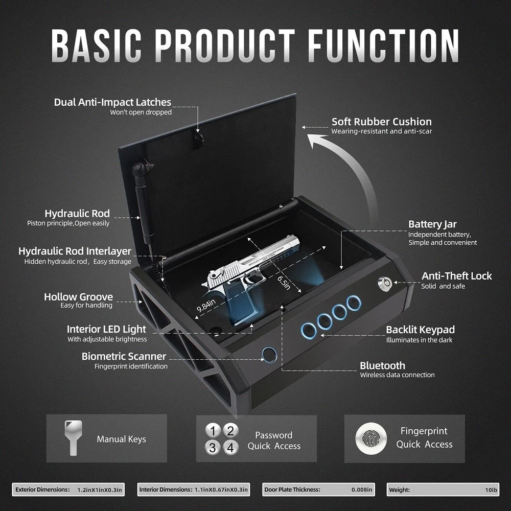 Brand new condition in original packaging, never installed, never used in any way! Please see photos of the actual item for sale right after the manufacturer's stock pictures for more details. You'll get exactly the item and accessories that are shown on the photos, nothing more and nothing less. Shipping is super fast and safe from the US, California - all products are bubble wrapped, lined with lots of packaging material, and securely boxed. I promptly pack and ship with great care to guarantee the fastest and the safest delivery of the product to you. Returns are not accepted, please make sure to read the detailed description carefully, inspect actual photos of the product, ask all questions and clarify concerns you might have before placing your order. Thank you for looking and happy shopping :). Cheers! Gun Safe for 2 Pistols - Biometric Black Gun Safe 4 Ways Quick Access with Fingerprint/APP/Key/Digital Keypad Lock Safe Access Handgun - Suit for Car Cloakroom Living Room Nightstand Bedside Brand MSR X6 Product Dimensions 9.84"D x 12.2"W x 3.15"H Lock Type Electronic Color black Capacity 11 Pounds Material Metal Special Feature Fireproof Mounting Type Freestanding, Tabletop Control Type key control,app control,fingerprint control Included Components Keys About this item FINGERPRINT BIOMETRIC IDENTIFICATION - Get in quick(0.1 seconds) when it matters most using the fingerprint, a safe box features a gas strut to instantly and quietly open the safe door. FOUR WAYS TO UNLOCK - This pistol safe can be connected to the Bluetooth APP to unlock, fingerprint biometric unlock, password unlock, key unlock, not only safe but also more convenient, can better protect your goods. TOUGH & RUGGED - The safe box will provide long-lasting strength and use for years to come. It also features a prevents corrosion, black finish for a durable, professional appearance, making it easy to incorporate into any interior space. Safe Box is constructed with solid steel and a pry-resistant door for and precise fittings that are virtually impossible to pry open with hand tools. T security; reliable high-strength locking mechanism. PORTABLE DESIGN - For added convenience,the safe is compact and lightweight for use whether to conceal in the car,or the bedside table,drawer and other places,It also can store valuables such as jewelry,which is convenient to carry.When on the night the biometric safe is opened,there will be light inside the gun safe,and you can clearly see the contents of the gun safe. HIGH QUALITY SERVICE - Reliable 24-hour response service. If you have any concerns or advice, please feel free to contact us directly. We’ll offer a friendly customer service. Product Description Gun Safe MSR X6 specializes in manufacturing expertly designed and precision-engineered smart safes. Our mission has been unwavering. We must design and build the highest quality product. We put in huge efforts to build our products, and we put in an equal amount of effort to serve our customers. We listen to them carefully. Our promise aim is to protect you, your families, and your most cherished possessions. Fingerprint Unlock MSR X6 most advanced locking system allows you to access your gun with the swipe of a finger. Digital Unlock Set your own combination for backup access to your pistol. Keys Unlock Gun safes come with 2 spare keys to make sure they access at any time. You can find the key in the key cover. APP Control You can download the app for free. The application can be used to unlock, manage fingerprints, change passwords. It allows you to view unlocking records on APP, so you can view who has opened the safe and how. Product Information Brand MSR X6 Product Dimensions 9.84"D x 12.2"W x 3.15"H Lock Type Electronic Color black Capacity 11 Pounds Material Metal Special Feature Fireproof Mounting Type Freestanding, Tabletop Control Type key control,app control,fingerprint control Included Components Keys Alarm anti theft Water Resistance Level Waterproof UPC 733810070566 Manufacturer VOLIBeL Item Weight 11.58 pounds Style Compact Special Features Fireproof Usage Home,car Batteries Included? No Batteries Required? Yes ASIN B09FF8HSX7 Date First Available September 3, 2021 What’s in the box Gun Safe Mounting Hardware Manual *** Important Disclaimer *** I'm doing my best to describe the product listed for sale as detailed as possible for your convenience. Please read carefully the product’s description provided by the manufacturer. The stock images that are shown before the actual product photos belong to the manufacturer of the product. I'm not a distributor, or a reseller, and not affiliated with the manufacturer of this product. The stock images and the description are based on materials provided by its original manufacturer and for information purposes only. I do not test the product to confirm its features and specifications listed by the manufacturer and I cannot provide you with product support or warranty service. If there are any discrepancies in the manufacturer’s description or stock photos of the product, I cannot be held responsible for it and will not be able to accept returns for this reason. I repeat, please read the description carefully, do your own research, inspect the actual photos of the product offered for sale, and ask any additional questions before placing an order. I will be happy to assist with any inquiries. Thank you for understanding. _gsrx_vers_1653 (GS 9.7.5 (1653))