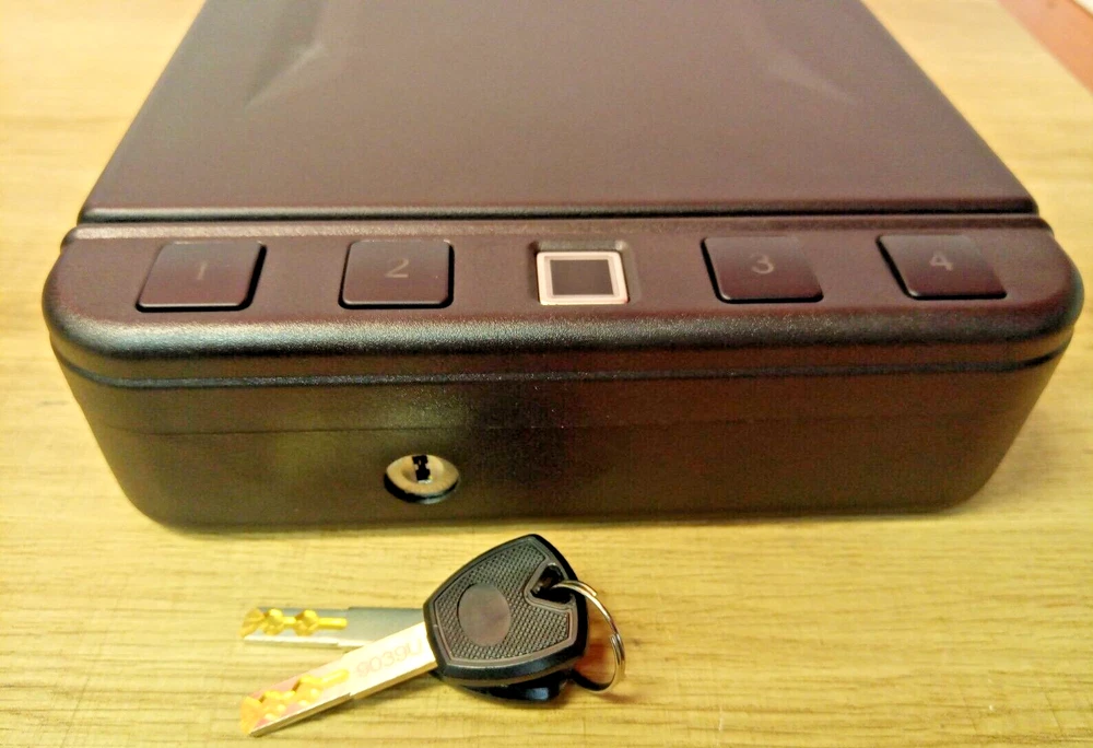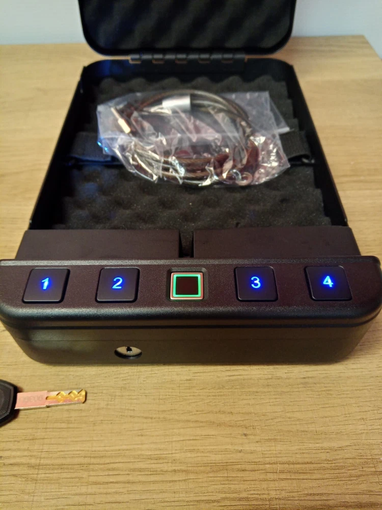 LANGGER V Gun Safe for Pistol, Quick Access Handgun Safe Firearm Lock Box, Gun Case for Home/Car/Travel 【QUICK ACCESS Biometric Gun Safe for Pistol】 QUICK ACCESS to your gun safe and valuables, firearm(s) from the automatic opening door. Get in quick when it matters most using the rapid backlit keypad, spare key or biometric fingerprint scanner. 【TOUGH AND RUGGED steel construction】 This handgun safe is made of reinforced solid steel wall construction. Durable powder coating finish preventing corrosion avoid being destroyed and ensure long-term protection of your belongings for years to come. Our pistol safe keeps you and your family away from firearms and protecting your belongings all the time. 【INSTANT Biometric / PIN Code and Key ACCESS】For extra-fast 0.5 second access, a simple touch (of a pre-determined fingerprint) is all it takes. This gun safe can hold up to 20 individual fingerprints, and its touch lifetime is more than 1,000,000 times. INSTANT ACCESS to your valuables, firearms from the automatic opening door. Get in quick when it matters most using the fingerpirnt. 【Backlit Keypad, LED light and SILENT MODE】 In low light situations so you can locate your pistol safe with the backlit keypad quickly. You can also set the silent mode. It is important function when you have introducer at night or you want to use the safe without distubing others. 【PORTABLE CAPACITY & Security Cable】Exterior Dimensions : 11.8" x 7.5" x 2.3", Interior Dimensions 8.8" x 7.3" x 2.2". Weight : 5.5 pounds. Deluxe quick-access firearm safe for 1 handgun and some magnizines. Pre-drilled holes and hardware included for mounting.This safe has a portable size and weight,very suitable for your car,and carry it when you travel.