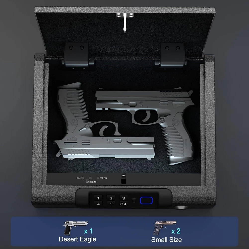 Gun Safe,Biometric Gun Safe for Pistols 3-Ways unlock Safe Fingerprint Digital PIN Key Unlock with Voice, Gun lock box for Cloakroom living room Bedroom Nightstand and Car Product Dimensions 8.6"D x 10"W x 2.75"H Lock Type Electronic, Key Color Black Material Alloy Steel, Carbon Steel, Metal Special Feature Portable Mounting Type Freestanding, Tabletop Control Type Key Control Included Components Keys Item Weight 6.46 Pounds About this item PORTABLE SIZE AND SPACE:The space of this gun safe can store 2 standard size pistols. It also can store valuables such as jewelry. The light and small size can also let you put it in the car, or the bedside table, drawer and other places, which is convenient to carry. BIOMETRIC ACCESS: The pistol safe is a biometric access/PIN access portable metal . gun safes for pistols is ideal for Pistols, cash and other valuable items. Top of the line biometric chips and Bluetooth capability brings high security and access control system together and makes it safe and user friendly. HIGH-QUALITY MATERIALS AND PRACTICAL INNER: The shell of the biometric gun safe for handgun is made of hard carbon steel, built-in strong spring steel, the coating is made of metal paint, thick and does not fall off. When on the night the biometric safe is opened, there will be light inside the gun safe , and you can clearly see the contents of the gun safe. USB CHARGE WITH LOW BATTERY REMIDER: The safe for pistol has a battery, can use USB cable to charge, and You can also use it as a power supply when it is out of battery,This handgun safe always keep danger away from your children.
