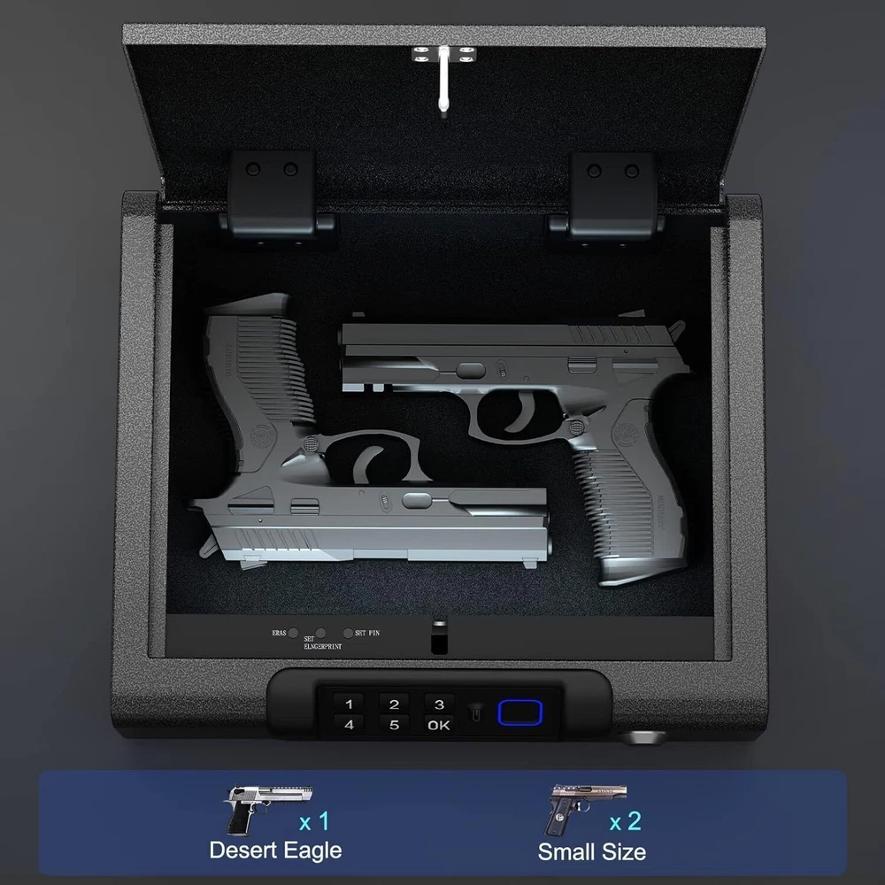 Gun Safe,Biometric Gun Safe for Pistols 3-Ways unlock Safe Fingerprint Digital PIN Key Unlock with Voice, Gun lock box for Cloakroom living room Bedroom Nightstand Product Dimensions 8.6"D x 10"W x 2.75"H Lock Type Electronic, Key Color Black Material Alloy Steel, Carbon Steel, Metal Special Feature Portable Mounting Type Freestanding, Tabletop Control Type Key Control Included Components Keys Item Weight 6.5 Pounds About this item PORTABLE SIZE AND SPACE:The space of this gun safe can store 2 standard size pistols. It also can store valuables such as jewelry. The light and small size can also let you put it in the car, or the bedside table, drawer and other places, which is convenient to carry. BIOMETRIC ACCESS: The pistol safe is a biometric access/PIN access portable metal . gun safes for pistols is ideal for Pistols, cash and other valuable items. Top of the line biometric chips and Bluetooth capability brings high security and access control system together and makes it safe and user friendly. HIGH-QUALITY MATERIALS AND PRACTICAL INNER: The shell of the biometric gun safe for handgun is made of hard carbon steel, built-in strong spring steel, the coating is made of metal paint, thick and does not fall off. When on the night the biometric safe is opened, there will be light inside the gun safe , and you can clearly see the contents of the gun safe. USB CHARGE WITH LOW BATTERY REMIDER: The safe for pistol has a battery, can use USB cable to charge, and You can also use it as a power supply when it is out of battery,This handgun safe always keep danger away from your children.