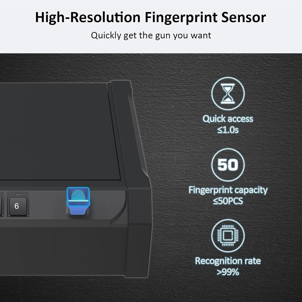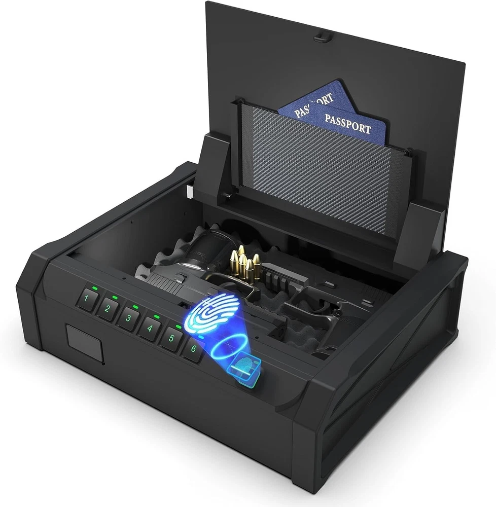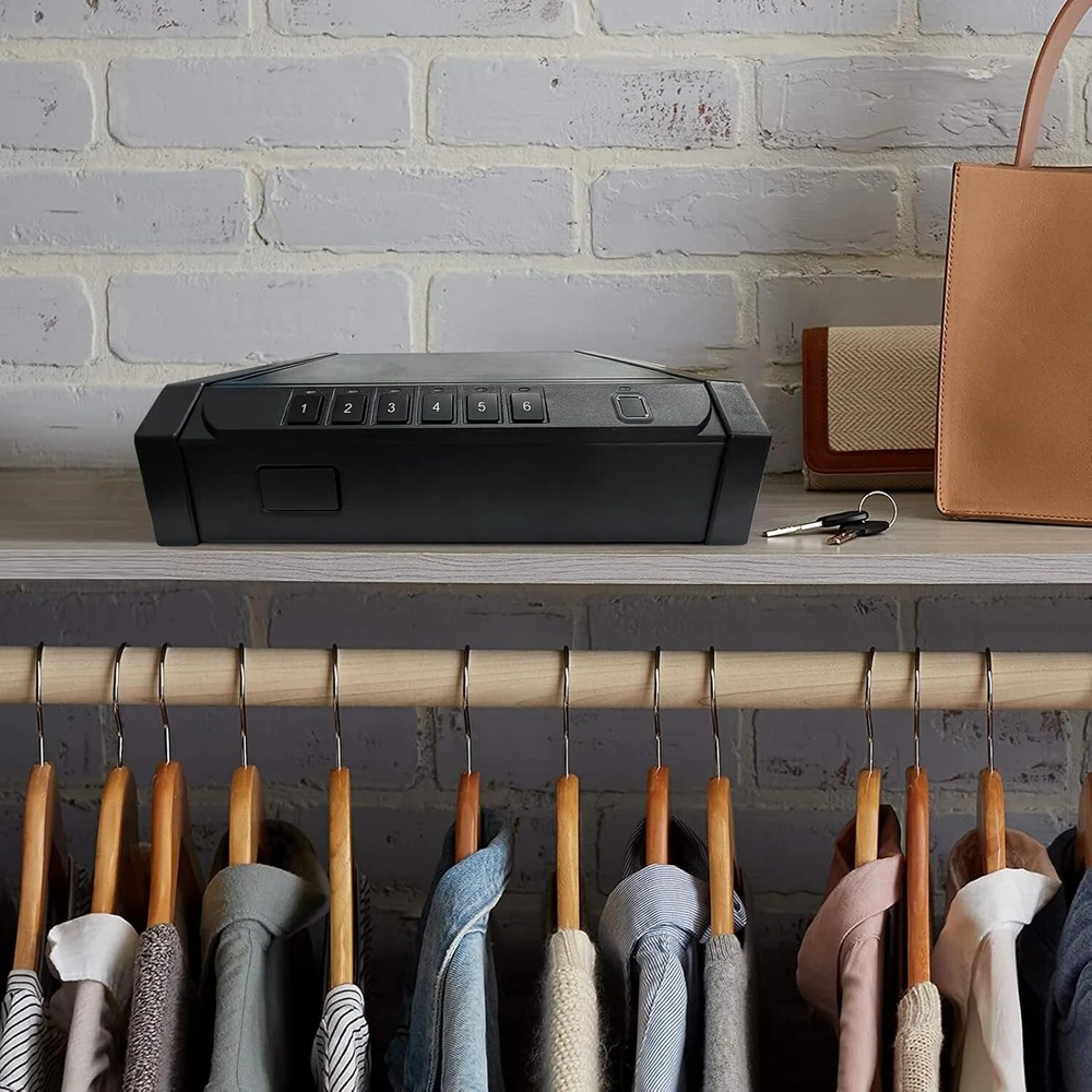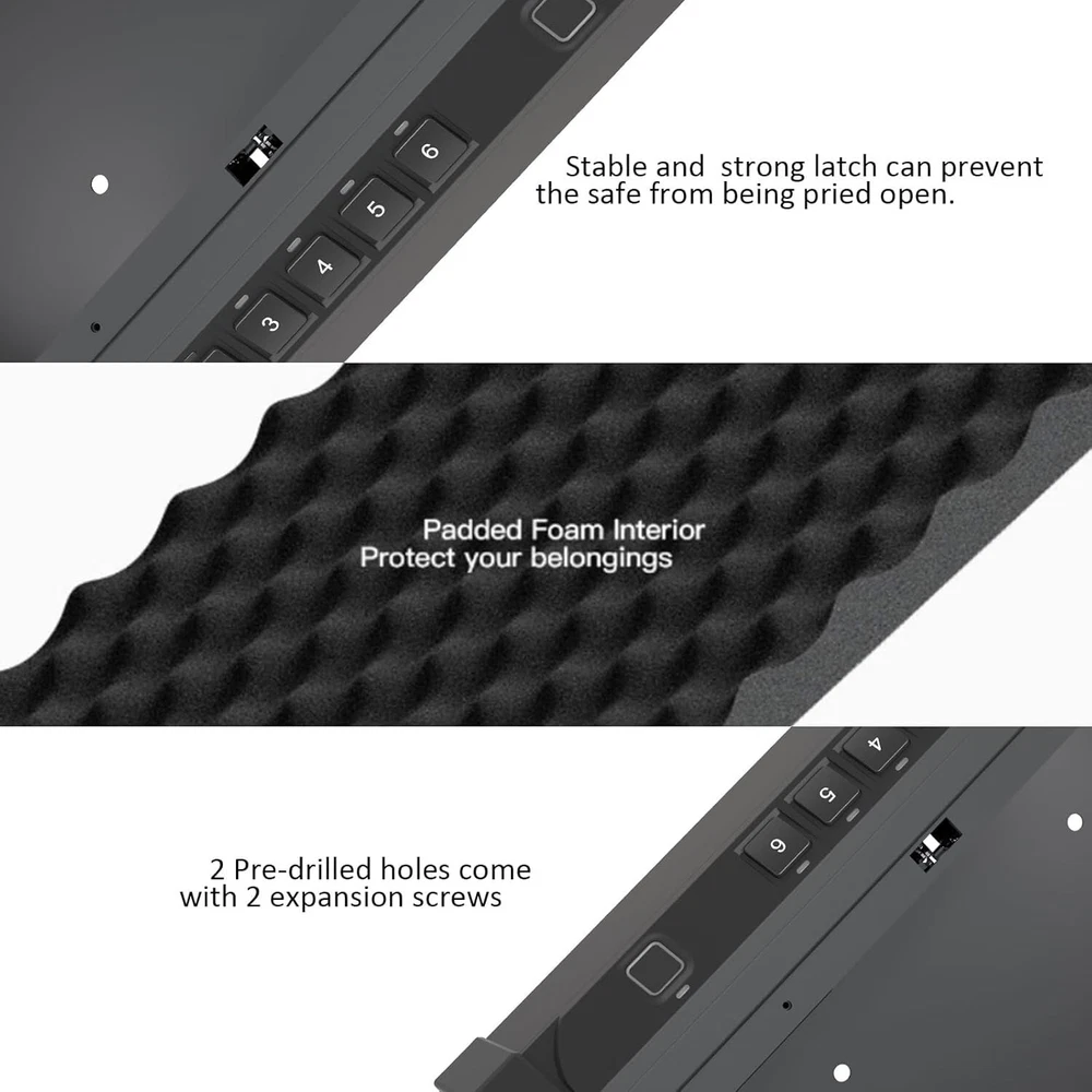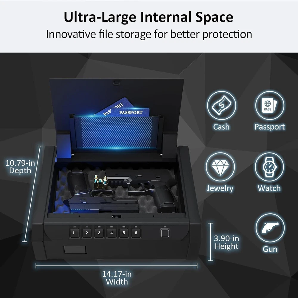 Biometric Gun Safe for Pistols, Handgun, Fingerprint Access, Key Pad .Exterior Dimensions:(W)14.2in*(D)10.8in*(H)3.5in. Innovative file storage bags provide additional space. 【3mm thickened steel plate】This gun safe box is made of premium strong material steel and corrosion-restant .Prevent thieves or kids from breaking in efficiently.built-in high density sponge better protect your gun. 【3 Ways Quick Access Mode】:This gun safe box adopt upgraded smart biometric fingerprint scanner with immediate access mode, and digital keypad lock or manual lock keys for access 【Wall/Floor Installable】 2 pre-drilled holes for Install in The Most Suitable Place According to The Requirements .Come with 2 expansion screws. 【Considerate Details】 High quality and solid structural materials ,pre-drilled holes,keyhole cover,LED lights,high elasticity foam,silent mode. Free Shipping 100% Satisfaction Customer Service, and provide return policy within 30days.We always keep product quality and customer service in our mind. Please let us know if you have any question Thank you
