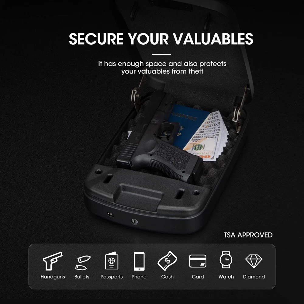 VERSATILE & QUICK ACCESS DESIGN -The gun safes for pistols equipped with Stainless steel spring and AI biometric fingerprint technology, which ensures single-handed quick access to your firearm devices in an emergency condition. With its LED light feature, the pistol lock box is very suitable for use at night. The bottom of the gun case has pre-drilled holes that can be fixed with screws to the drawer or wall to provide higher security. AI IDENTITY AUTHENTICATION - The fingerprint sensor of biometric gun safe for handgun is upgraded with the advanced AI tech and self-learning ability enabling accurate identification that's 30% higher than the ordinary fingerprint sensors of a regular handgun case in the market. EMERGENCY POWER USB PORT - This car gun safe comes with an integrated emergency USB port on the side of the keyhole for connecting power to unlock the case quickly during emergency out-of-power conditions and when the back-up key is missing. REINFORCED ANTI-PRY FEATURE & ALARM - This small gun safe for handguns is made of a precision-formed 16-gauge rugged steel enclosure. It comes with a security cable that can be secured to any fixed object at home or in a vehicle. The alarm system provides for ultimate security, and if an invalid fingerprint is entered five consecutive times, the gun lock box will be locked and the alarm for 100 seconds. PORTABLE & CAN BE BROUGHT ANYWHERE - The exterior dimension of this portable gun lock box is 11.8”*7.9”*2.3” for a handgun up to 8.5” in overall length. More than a portable gun vault, this car gun safe for handgun can be safely hidden in a drawer or in your car's glove compartment. It's perfect for keeping firearms or items like jewelry and other valuables safe in the car. The memory foam inside keeps all items protected from scratches.