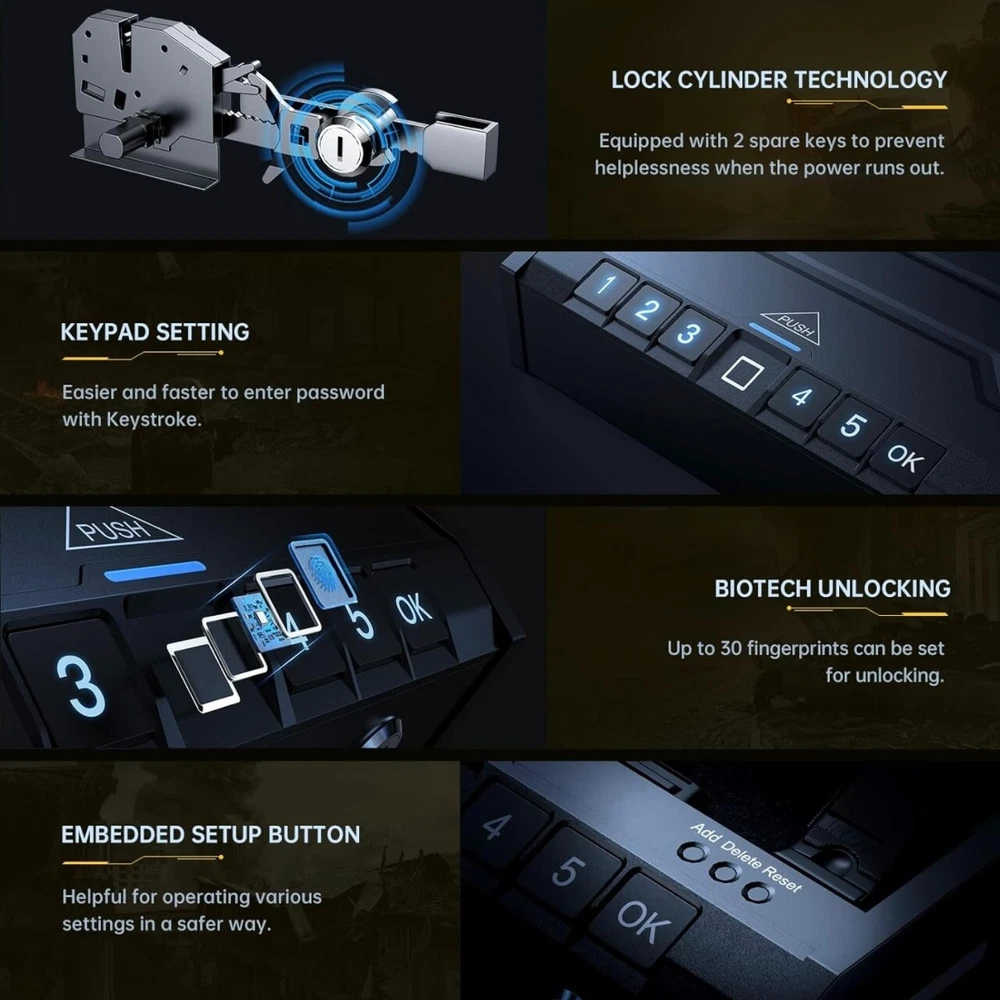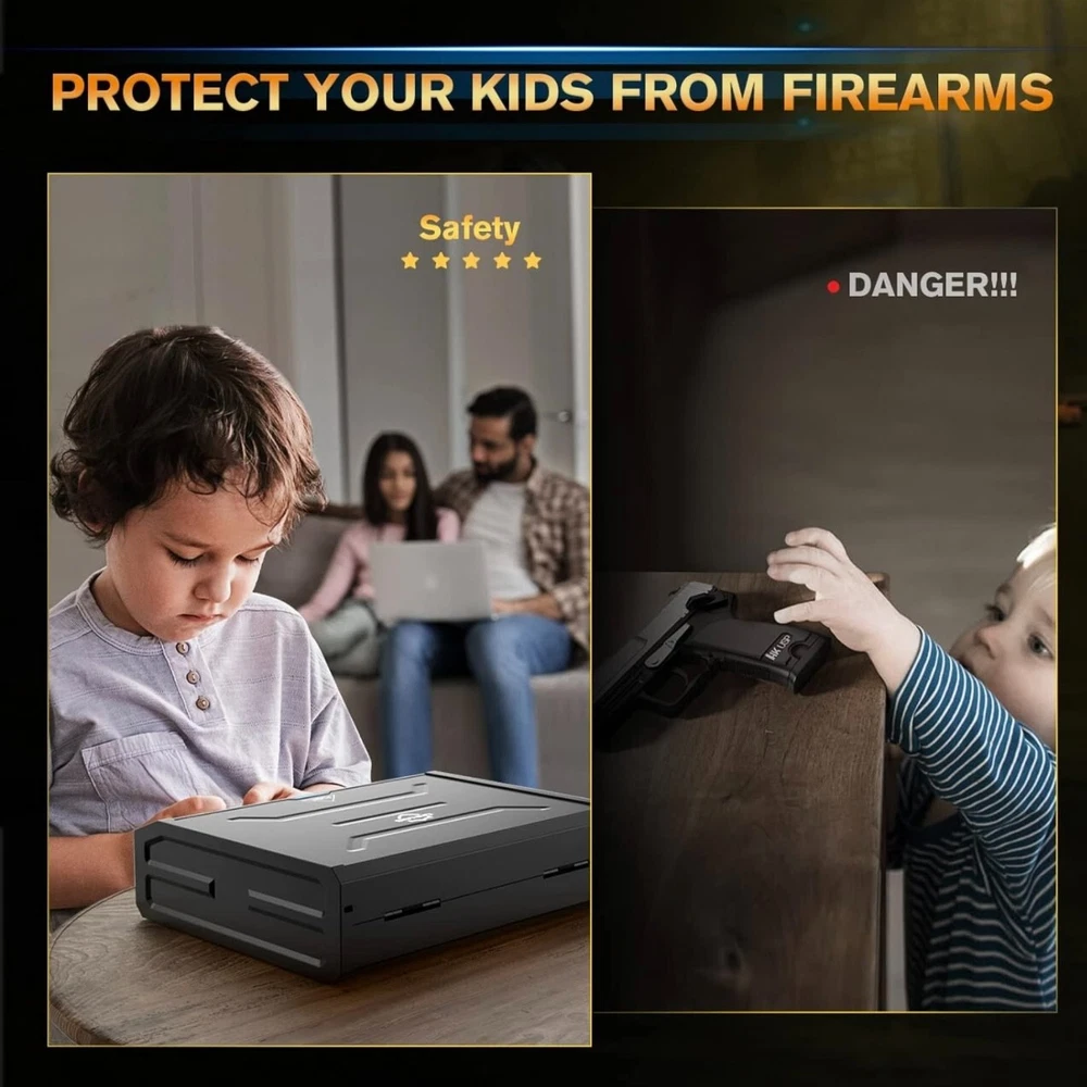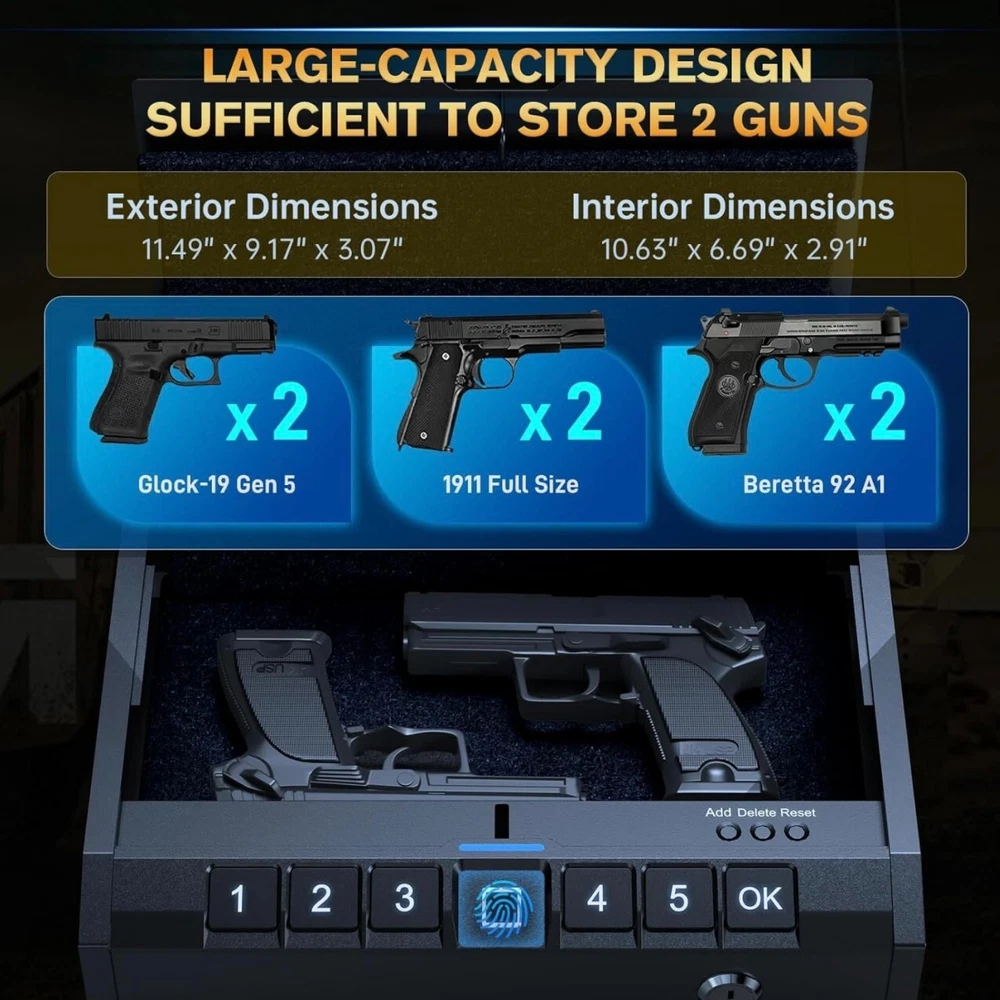 Keep your guns safe and secure with this biometric gun safe. With a biometric lock and keypad, you can be sure that your pistols are always protected from unauthorized access. The safe is made of steel and is designed to be portable, making it perfect for use in your car or when traveling.The safe can hold up to two guns and has a capacity of three keys. It comes in a sleek black color and is suitable for use with pistols. Features include a fingerprint secure opening and a lock for added security. This safe is a must-have for any gun owner who wants to keep their firearms secure and easily accessible.