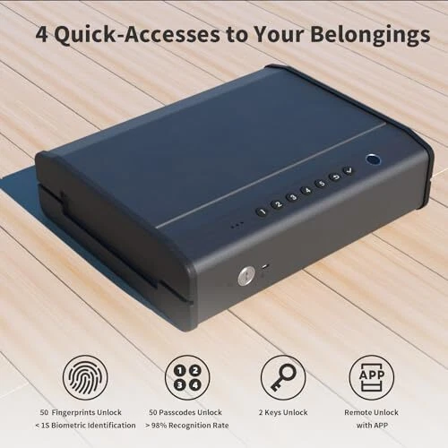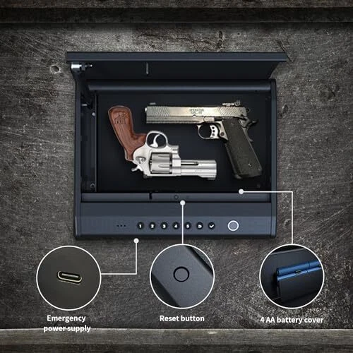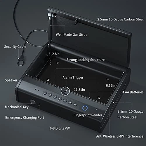 🔑【Reliable Fingerprint Technology】 Each gun safe adapts top semiconductor fingerprint technology, which allows you to access within 0.5s. With the failure rate of the recorded fingerprint unlocking less than 0.9%, you can quickly access the gun safes box in an emergency. 🔑【Really Sturdy Handgun Safe】 Have your fingerprint gun safes passed the shooting test? Ours have! The pistol cannot shoot it through! The cover is made of 2.5mm-thick 10-gauge carbon steel, and the side is 3.5mm, the smart safe is about 17.6lb. It is so tough and rugged that it's hard to break it! 🔑【Can Hold 4 Pistols Smart Safe】 Exterior dimension:13.48”x10.88”x3.58”, interior dimension: 11.81"x6.59"x2.8”, great gun storage size for nightstand. With greater height, there's enough space in the heavy-duty firearm case box to store 4 pistols, some magnizines, passport, cash, IC card, and etc. 🔑【4Ways Quick Access with Multi-Functional WiFi Biometric Lock】 Fingerprint/APP/6-8 digits Password/Mechanical key. You can hold 50 fingerprints and 50 groups of passwords; Emergency usb-c charging port (not included usb-c cable) can save you from dead batteries; Mute mode and backlit keypad are ideal for bedside firearm gun lock box. (2.4Ghz WiFi only) 🔑【Well-Made Details of the Pistol Safe】The strong and durable gas strut supports 30,000 times of opening and closing; Firm locking structure never allow it to open uncontrollably; The heavy duty security cable can't be pulled off by cars; The anti-pry bar will alarm when someone intrudes illegally. 🔑【Anti-Theft & Low Battery & Trial and Error Alarm & Coercion Alarm】If someone tries to access into gun case with violent (prying or smashing), alarm will be awakened. When the battery power of the gun case is lower than 4.8V, the safe will remind "Low battery, please replace it', please replace with 4 new LR6 batteries in time. Trial and error alarm will lock the system for 3 minutes after 5-times error passcode/fingerprint. It can keep children away for the guns. Coercion Alarm---when unlocking with a passcode or fingerprint dedicated to coercion alarm, the person who is set as the recipient of the message will receive a notifcation. 🔑【Emergency Charging】Never worry about the batteries running out and affecting your firearm safe. Gun safe charging TYPE-C cable can be used in emergencies. Reminder: Do not keep long-term charging, it will affect the service life of the safe. (USB-A to TYPE-C Cable is not included). 🔑【Attentive After-sales Service】biometric gun safe for pistols packed with thickened packaging box, and the interior is lined with shock-proof padding and to protective cap foam to prevent scratches or damage to firearms and belongings. provides 1-year warranty service and free returns within 30 days of purchase for all gun safes series. Contact us with any questions, we'll be glad to help you. Your 5-stars satisfaction is our first prority.