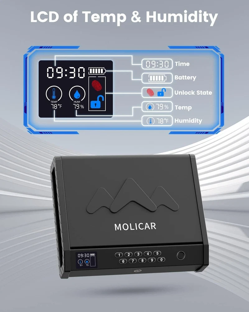 Product Dimensions 12.79"D x 10.35"W x 3.19"H Lock Type Biometric Color Black Capacity 8.8 Pounds Material Alloy Steel Special Feature LCD of temperature,humidity,battery life,unlock state,time, emergency USB-C Port, Mute Mode, 3 ways of access:fingerprint,password,keys, Internal LED light LCD of temperature,humidity,battery life,unlock state,time, emergency… See more Mounting Type Floor Mount Control Type Fingerprint;Password;Key Included Components USB power supply cable, Setup tool & 4 AA battery, A gun safe,some accessories, 2 Long & 2 Short mounting screws, 2 Mechanical Keys USB power supply cable, Setup tool & 4 AA battery, A gun safe,some accessories, 2 Long & 2 Short mou… See more See less About this item LCD of Temp Humidity Battery: You can read the temp and humidity levels within the gun safe for better protection of handguns and magazines, Also you will get the battery life, unlock status, and time with the digital readout. Note: The display will be on for 10 seconds, but not always. Emergency USB-C Port: The pistol safe with a built-in USB-C port for exterior power input in case the battery is out of power and the backup key missing.No more such worries! 3 Ways Access: The handgun safe is easy to set up, utilizes a set tool pin, and you simply engage options by putting a pin tool in each mounted hole. you can set fingerprints (up to 100), codes(up to 10) or 2 backup keys.The fingerprint access allows for reaching your firearms within 1s. Robust and Security: The fingerprint gun safe is made of 2mm thickened steel lid and a pry-resistant door for strength, with a reliable high-strength locking mechanism and precise fittings. The biometric gun safe Comes with a 40.16" cable and 2 screws for mounting. Mute mode and LED lights on 10s for quick access to guns in the dark when in an emergency. Keep Kids Safe: In a family with kids, keeping the guns away from kids' reach out of curiosity while having quick access to it in emergency is a paradox, which is perfectly solved by the biometric safe. 2 Guns Capacity: The biometric safe for nightstand can securely hold 2 standard handguns and extra ammo, Exterior Dimensions: 12.6" x 9.84" x 3.15", Interior Dimensions: 11.3" x 7.2" x 3", Weight 8.8lbs. Product Dimensions 12.79"D x 10.35"W x 3.19"H Lock Type Biometric Color Black Capacity 8.8 Pounds Material Alloy Steel Special Feature LCD of temperature,humidity,battery life,unlock state,time, emergency USB-C Port, Mute Mode, 3 ways of access:fingerprint,password,keys, Internal LED light Mounting Type Floor Mount Control Type Fingerprint;Password;Key Included Components USB power supply cable, Setup tool & 4 AA battery, A gun safe,some accessories, 2 Long & 2 Short mounting screws, 2 Mechanical Keys Item Weight 8.8 Pounds Water Resistance Level Not Water Resistant Chamber Depth 11.41 Inches Chamber Height 7.87 Inches Chamber Width 2.95 Inches Part Number 443B-Upgarde Item Weight 8.8 pounds Country of Origin Hong Kong Style Biometric gun safe Shape Rectangular Number Of Pieces 1 Special Features LCD of temperature,humidity,battery life,unlock state,time, emergency USB-C Port, Mute Mode, 3 ways of access:fingerprint,password,keys, Internal LED light Batteries Included? Yes Batteries Required? No