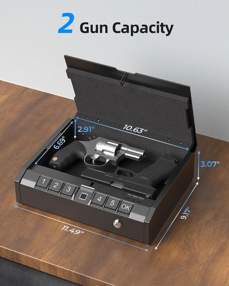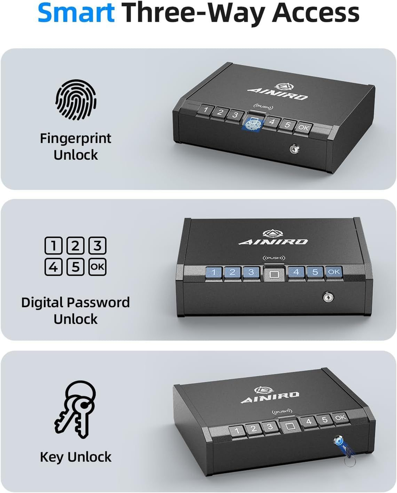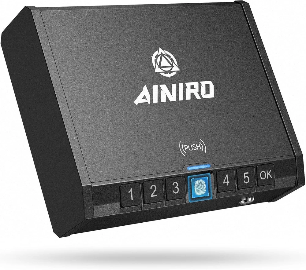 Gun Safe for Pistols - Biometric Handgun, Darknight Black Description Features: [Smart Three-Way Access]Our mission is to keep your gun in a safe and make sure that only you can get your hands on it with an AINIRO handgun safe for the nightstand. We offer versatile 3 ways to enter the biometric gun safe, keypad PIN code as well and 2 backup override keys which will make sure you can always quickly access your pistols. [Enhanced Protection with Carbon Steel] AINIRO gun safe for pistols is constructed using high carbon steel, providing exceptional durability and ultimate protection against thousands of potential attacks. Additionally, the well-built premium metal lock cylinder further enhances the security of your firearms. By storing your guns in our gun lock box, you can rest assured that even in the unfortunate event of a break-in while you're away from home, your handguns will remain securely protected from burglars. [Portable & Large Capacity] AINIRO Car gun safe can be used for travel, SUVs, and Trucks. Also at home, drawer,in-wall, bedside or under the bed, cabinet, luggage, or other nooks. As a big gun safes for handguns is enough to hold two standard-size regular-frame pistols or your EDCs and gun accessories. Padded with soft foam to prevent scratches. In addition. Product Details: Brand: AINIRO Product Dimensions: 9.21"D x 11.57"W x 3.11"H Lock Type: Combination, Fingerprint, Keys Color: Darknight Black Capacity: 0.12 Cubic Feet Material: Carbon Steel Special Feature: Portable, Alarm System, Combination Lock, Anti-Theft, Silent Mode Mounting Type: Wall Mount, Floor Mount Control Type: Key Control Included Components: AINIRO Gun Safe, Mounting screws, Backup keys, Heavy Steel Cable Item Weight: 2.27 Kilograms Alarm: Audible Water Resistance Level: Not Water Resistant Chamber Depth: 2.91 Inches Chamber Height: 10.63 Inches Chamber Width: 6.69 Inches Item Package Dimensions L x W x H: 13.78 x 13.07 x 4.8 inches Package Weight: 2.95 Kilograms Item Dimensions LxWxH: 9.21 x 11.57 x 3.11 inches Brand Name: AINIRO Model Name: Darknight Black Number of Items: 1 Manufacturer: AINIRO Part Number: HX-008A Style: Fingerprint Gun Safe Brand: AINIRO Product Dimensions: 9.21"D x 11.57"W x 3.11"H Lock Type: Combination, Fingerprint, Keys Color: Darknight Black Capacity: 0.12 Cubic Feet Material: Carbon Steel Special Feature: Portable, Alarm System, Combination Lock, Anti-Theft, Silent Mode Mounting Type: Wall Mount, Floor Mount Control Type: Key Control Included Components: AINIRO Gun Safe, Mounting screws, Backup keys, Heavy Steel Cable Handling We will ship all orders within 3 business day of payment. Delivery We Do Not Ship Outside of the Continental US. Return Policy All items qualify for returns within 30 days of receipt. Buyer is responsible for return shipping on any item that is not damaged. Feedback We take our reputation seriously, we buy and sell online, so we understand the value of trust. If you are unsatisfied with your order, please contact us and we will work with you to resolve it to your satisfaction.