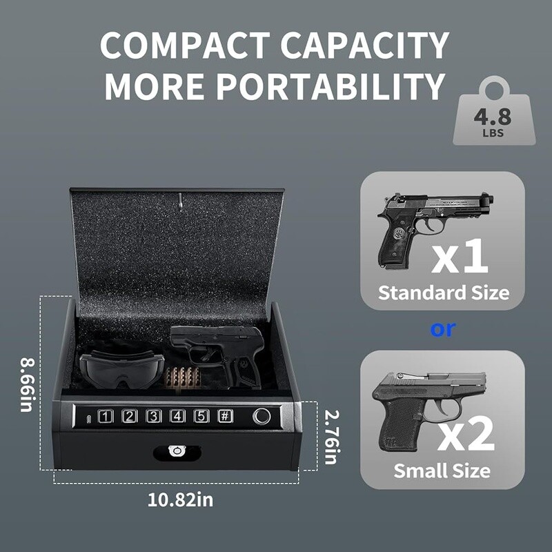 You may also like Square Appetizer Plates Set of 8 Dishwasher Microwave Oven Safe Porcelain New 24.75 USD Free shipping Brushless Cordless Drill Set 16.8V 410in-lb 23 1 Torque Keyless Chuck LED Light 64.99 USD Free shipping Reversible Down Alternative Comforter Set King 3-Piece Microfiber Fade Resistant 31.24 USD Free shipping Strawberry Sparkling Water Zero Calorie Sugar Free Non GMO BPA Free Cans 24 Pack 24.77 USD Free shipping Starfish Handmade Distressed Wood Decorative Box Set 2 Coastal Keepsake Storage 30.64 USD Free shipping Non Slip Velvet Hangers 100 Pack Space Saving Clothes Organizer 360° Hook New 37.48 USD Free shipping Plush Pixel Polypropylene Indoor Accent Rug Non-slip Latex Backing Living Room 30.94 USD Free shipping Disposable Paper Plates 10 Inch Strong Leak Resistant 100 Count Microwave Safe 17.02 USD Free shipping Canister Garment Steamer 96 Min Run Time Adjustable Settings Removable Tank New 103.99 USD Free shipping Extra Tall Walk-Thru Safety Gate Toddlers Pets Doorway Stairway Install New 87.68 USD Free shipping Expandable Rolling Luggage Set 4-Piece Durable Travel Bag W/ Smooth Wheels New 85.11 USD Free shipping Smoothie Blender 48oz Jar 650W 12 Speed Functions BPA-Free Quiet Blending New 28.7 USD Free shipping About this item 【Advanced Biometric Technology】The hand gun safe box features state-of-the-art biometric fingerprint technology for enhanced security and fast access to your firearm. Offering quicker and more reliable access than traditional keypad locks, the high-resolution fingerprint scanner allows single-handed entry. Capable of storing up to 32 user fingerprints, it ensures seamless access for multiple users, with precise and accurate recognition every time. 【3 Quick Access Options】The biometric hand gun safe for handgun offers three fast and convenient access methods: instant fingerprint recognition, a 5-digit backlit keypad, and two backup keys. Access your firearms in seconds with the automatic opening door. The fingerprint feature allows quick access within seconds, ensuring you're always prepared. Additionally, the Silent Mode lets you mute the beeping sound for discreet and silent entry when needed. 【Durable and Secure】Built with a reinforced thick steel lid and a pry-resistant door, this biometric hand gun safe case is engineered to resist break-in attempts. Its robust high-strength locking system and precise construction keep your firearms secure. For added convenience, the fingerprint handgun safe for nightstand includes a steel wire rope and two screws for simple mounting, along with a backlit keypad and LED lights to ensure easy access to your firearms even in low light during emergencies. 【Child Safety First】Balancing firearm accessibility and safety can be challenging for families with kids, but the hidden biometric finger print hand gun safe for pistols offers a solution. With its fingerprint access, the gun lock boxes for pistols keep firearms securely locked yet readily accessible during emergencies, preventing children from gaining access. 【Guns Capacity】This biometric hand gun safe box can flexibly store 1 standard handgun with extra ammo, or 2 compact handguns along with other essentials. Its compact design (Dimensions: 10. 82" x 8. 66" x 2. 76", Weight: 4. 8 lbs) allows for easy storage in your car, nightstand, or drawer. The interior of the gun storage is padded with soft foam to prevent scratches, ensuring your firearms stay pristine. Its lightweight build and space-efficient design make it portable and secure. 【Low Battery Alarm】When the battery of the hand gun safe box (caja fuerte para armas de fuego) is low, the red light on the fingerprint button flashes 4 times, so that you can replace the battery in time (adapted battery: AA*4 battery, not included in the package) 【Emergency USB Power Port】 The gun cases for handguns features a built-in USB power port, ensuring continuous power even if the battery dies or the backup key is lost. This eliminates concerns about firearm access during emergencies. It can connect to an adapter, power bank, or car charger, ensuring constant security and accessibility for your firearms. This feature of the gun safe (caja fuerte para pistola) does not charge the battery and is only used as a temporary power source when depleted. Product Dimensions: 8. 66"D x 10. 82"W x 2. 73"H Lock Type: Electronic Color: Black Capacity: 0. 15 Cubic Feet Material: Alloy Steel Special Feature: Portable Mounting Type: Freestanding Control Type: Biometric/Password/Keys Included Components: Screws Kit, Gun Safe, Security Cable, Keys*2, USB Cable Black Cable Railing Post T304 Stainless Steel Surface Mount Indoor Outdoor New 98.79 USD Free shipping 2 Pack 3 Step Hand Rails Wrought Iron Outdoor Indoor Stairs Railing Kit Safety 128.69 USD Free shipping 20 Pack Plant Support Stakes Heavy Duty Garden Support Ring Peony Tomato Rose US 50.69 USD Free shipping Durable 4ft Garden Stakes Plants Tomato Supports Pack of 50 Sturdy Sticks New 58.49 USD Free shipping 30 Pack Heavy Duty 12 Inch Rebar Stakes J Hook Ground Anchors Tent & Garden New 46.79 USD Free shipping Bamboo Plant Stakes 40 Pack 5ft Garden Support Twine Ties Tomato Climbing Plants 48.07 USD Free shipping 287 Pcs Garden Stakes W/ 90 Sets Fiberglass Plant Supports Tomatoes Vegetables 46.79 USD Free shipping 57 Inch Durable Plastic Coated Steel Garden Stakes Climbing Plants 25 Pack New 46.77 USD Free shipping 36 Inch Plant Support Stakes 50 PCS Steel Climbing Plants Tomatoes Beans New 55.89 USD Free shipping Automatic Chicken Waterer Float Control 3 Gallon Poultry Drinking System W/ Hose 72.79 USD Free shipping Automatic Chicken Watering System PVC Pipe Fittings Poultry Water Cups Set New 45.9 USD Free shipping 150W Chicken Waterer De-Icer Thermostatic Drinkers Winter Hydration Teflon New 61.81 USD Free shipping