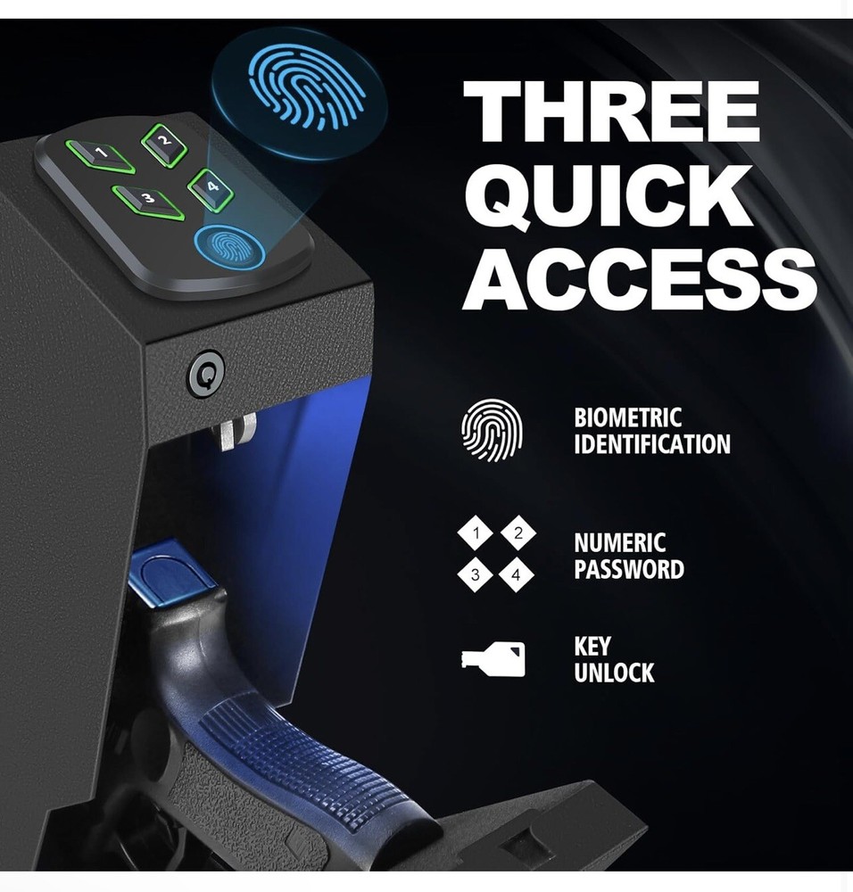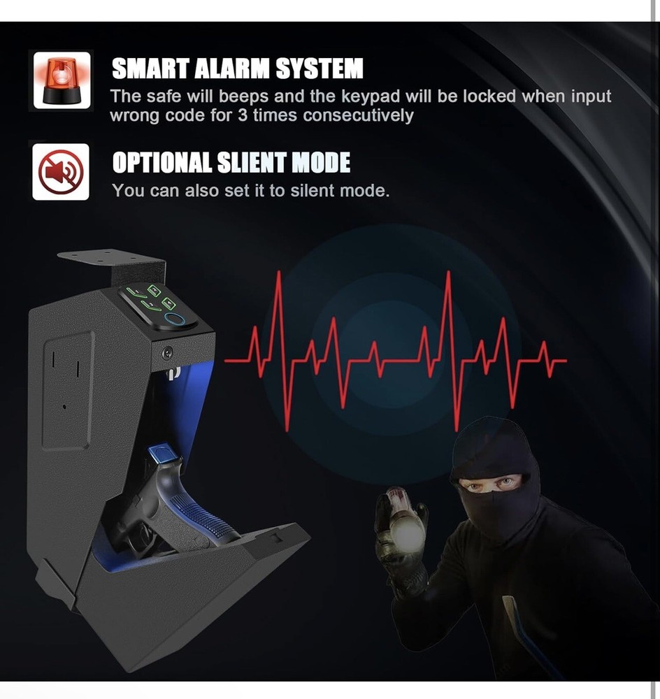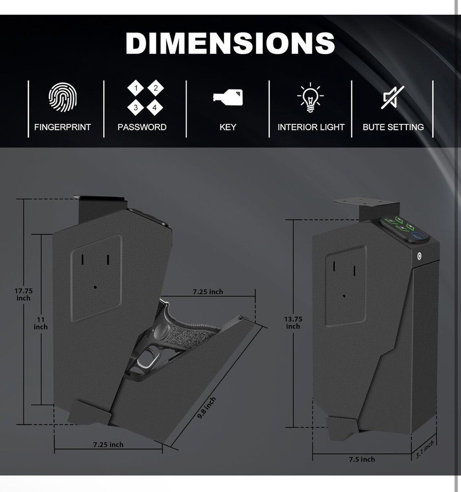 Upgraded Hidden Mounted Gun Safe Key Features: - Installs in multiple locations: under desk, nightstand, bookshelf, wall, bedside, or in a vehicle - Holds handguns up to 9.4" long - Slim vertical design for discreet storage - Includes mounting plate for customizable installation Security Features: - Made from 16-gauge carbon steel with durable finish for corrosion resistance - Weighs 7.9 pounds for added security - Anti-theft protection with strong anti-impact latch - Pry-resistant design for added security Quick Access Features: - High-resolution biometric sensor stores up to 30 unique fingerprints - Fast entry with match speed of <0.2 seconds - Manual keys and PIN code options also available Convenient Features: - Interior LED light for visibility in dark spaces - Power display shows battery level to prevent unexpected power loss - Super-dense foam interior prevents movement and damage - Wrong access beep alerts you to incorrect entries (can be silenced) Additional Benefits: - Instant home defense with quick access to your firearm - Discreet and compact design for concealed storage - Customizable installation for your specific needs