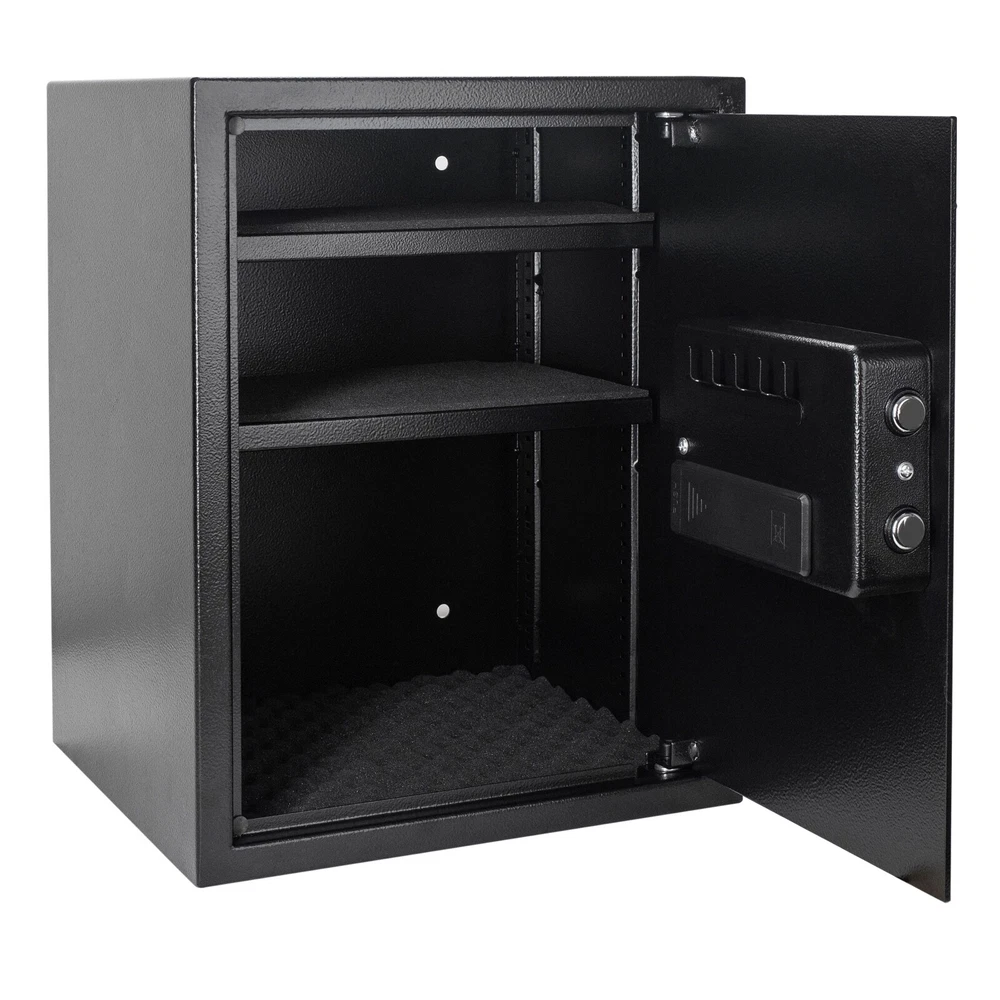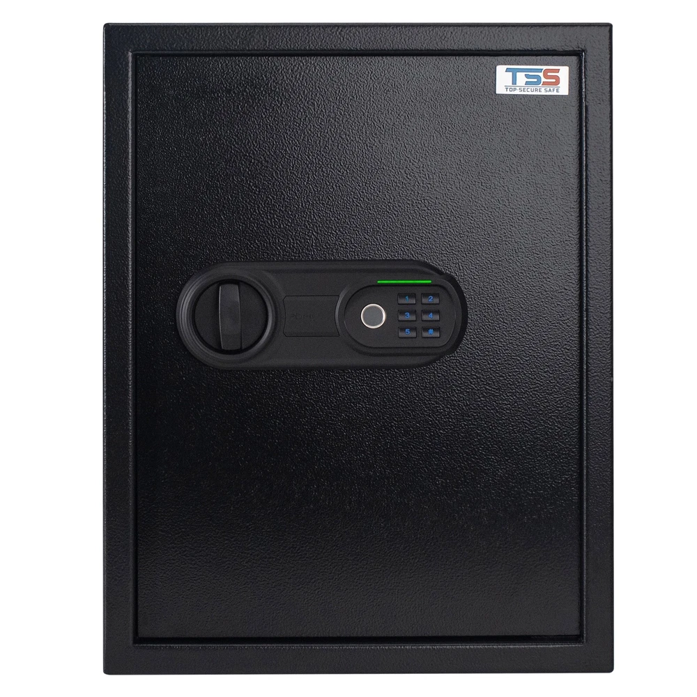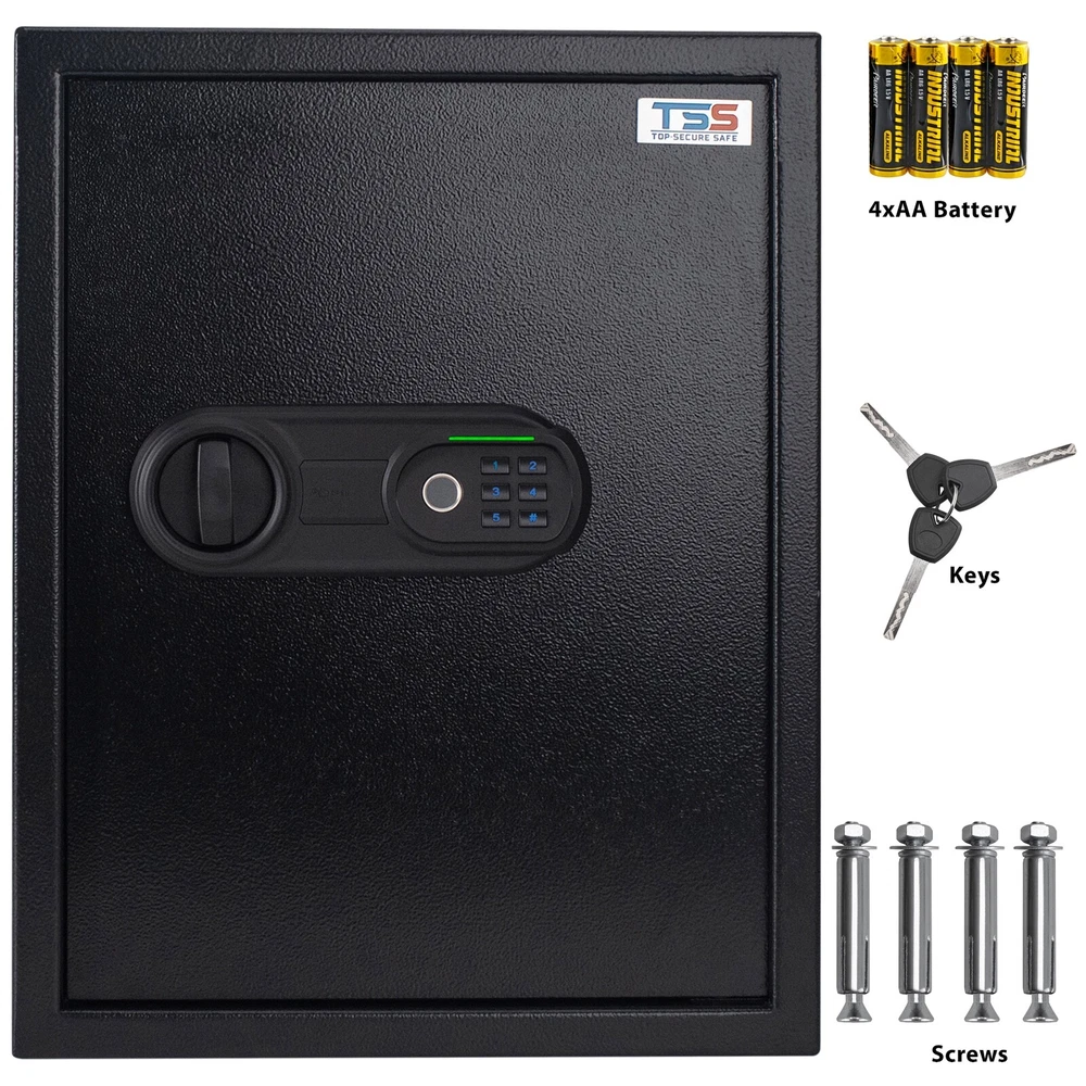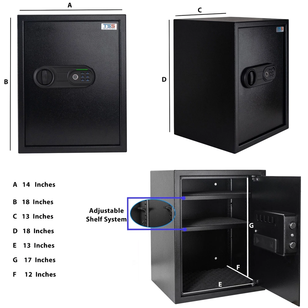 Free eBay listing template designed by dewiso.com FIREPROOF & HIGH-QUALITY MATERIAL TSS biometric safe box is made of high-quality metal materials, fireproof. A fireproof safe is UL Classified to endure 1 hour at 1700°F and keep interior temperatures safe for irreplaceable documents, money, important documents, guns, valuables, DVDs, and USBs; ETL Verified to withstand a 15-foot fall during a fire and remains closed and ETL Verified for 24 hours of protection in water up to 8 inches deep Large Capacity and Convenient Shelving The overall 1.13 CB ft large capacity can hold pistols, cash, jewelry, and important documents. Its convenient shelving lets you store your valuables with maximum efficiency. 3 WAY ENTRY You can lock/unlock it with a fingerprint and can save up to 20 fingerprints in memory. You can also use the password key to unlock it. It also comes with an external power source, in case the battery runs and it locks. You can connect an external battery source to enter the passcode or fingerprint HIGH-QUALITY MATERIAL High Capacity: 1.33 cubic feet. Product exterior size 20x16x16 inches interior size 12x16x12. It gives you enough capacity for your valuables, firearm, important documents, money, jewelry, etc Large Capacity and Convenient Shelving The overall 1.13 CB ft large capacity can hold pistols, cash, jewelry, and important documents. Its convenient shelving lets you store your valuables with maximum efficiency. 4 AA batteries to control the battery-operated digital panel for code and fingerprint entry. It has pre-drilled mounting holes and includes mounting hardware to mount it in a closet, shelf, or closet under the floor. 3 WAY ENTRY You can lock/unlock it with a fingerprint and can save up to 20 fingerprints in memory. You can also use the password key to unlock it. It also comes with an external power source, in case the battery runs and it locks. You can connect an external battery source to enter the passcode or fingerprint