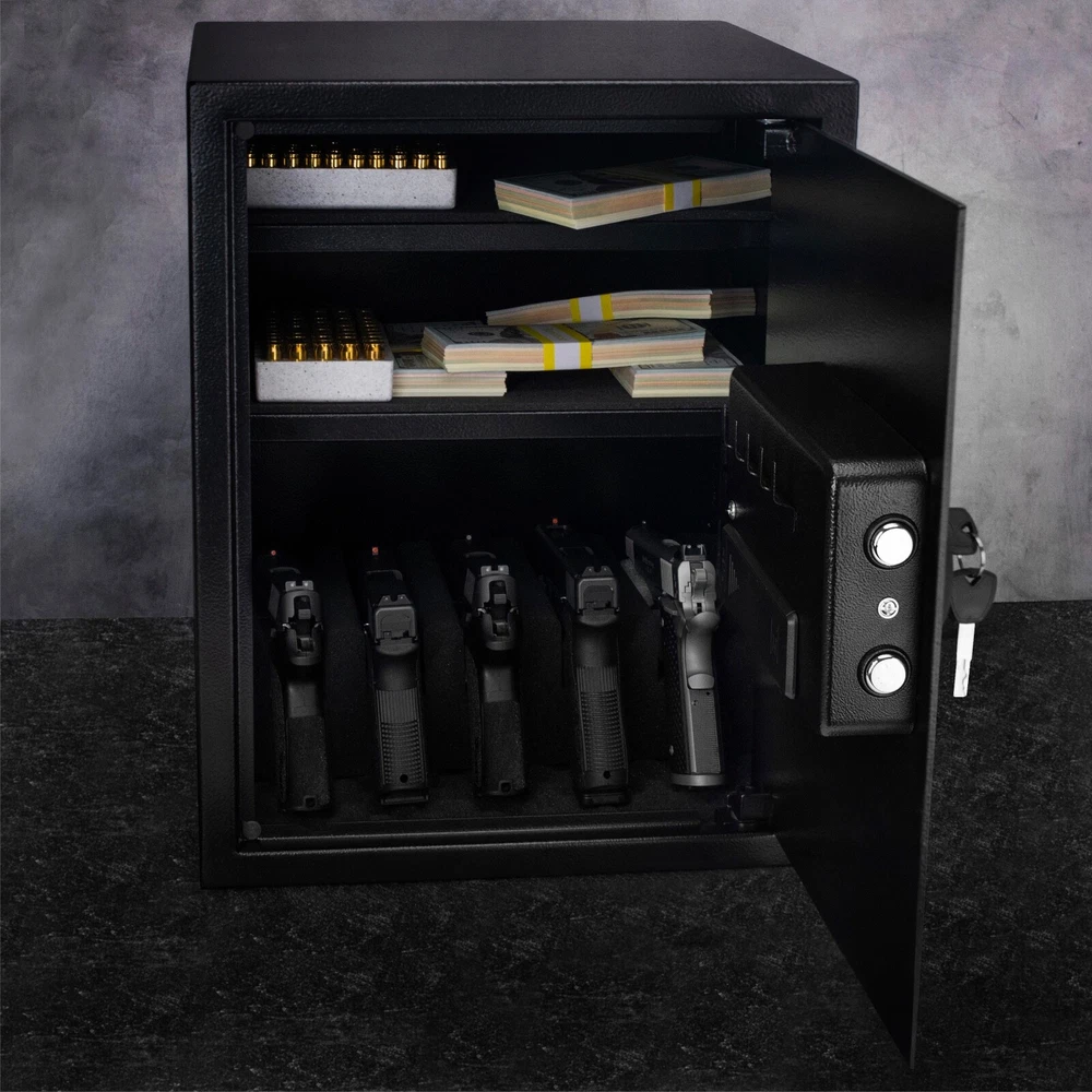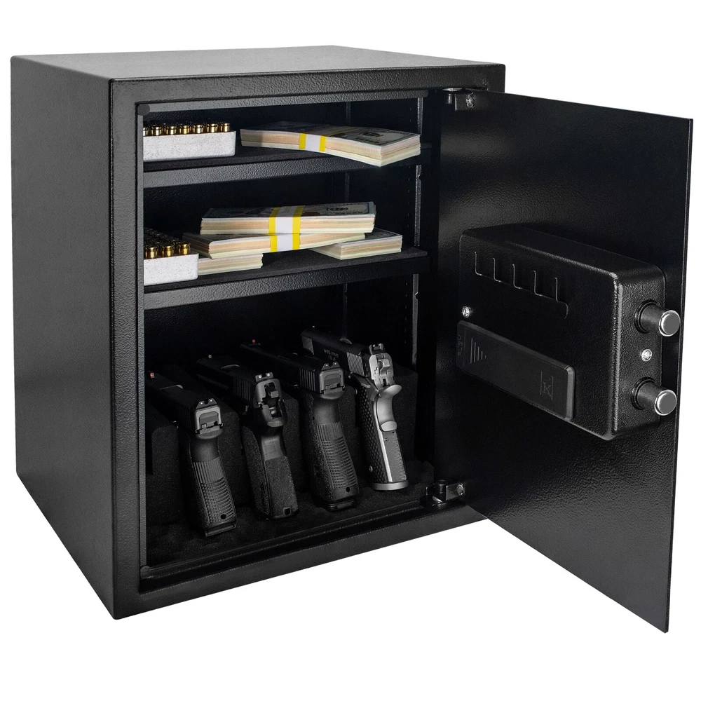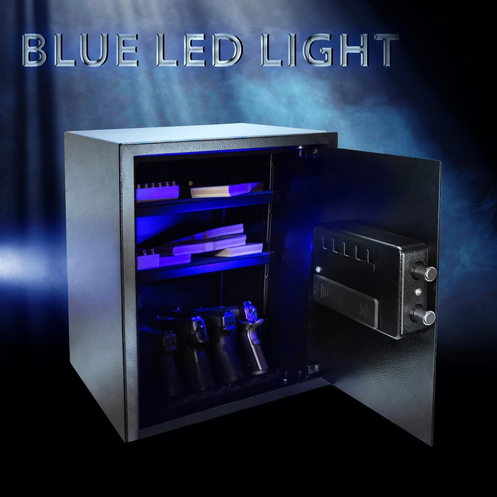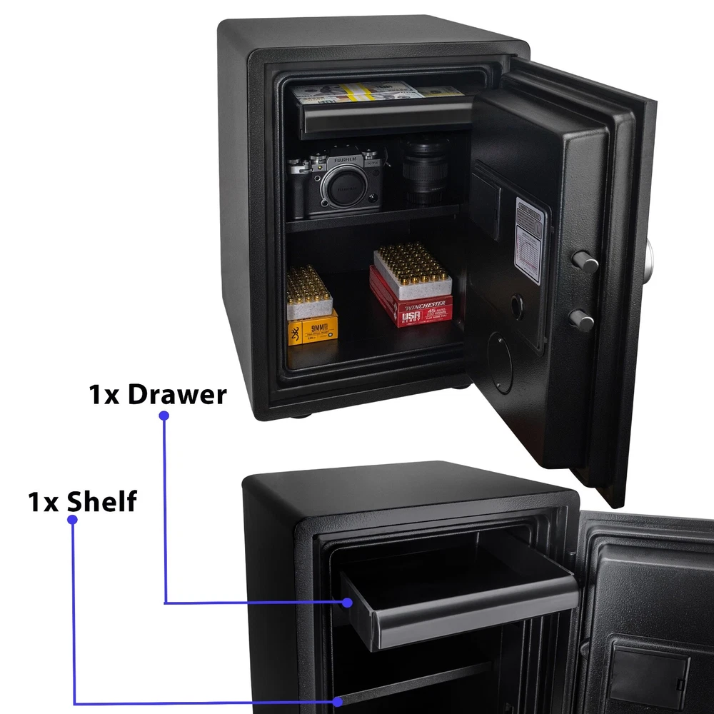 Free eBay listing template designed by dewiso.com FIREPROOF & HIGH-QUALITY MATERIAL TSS biometric safe box is made of high-quality metal materials, fireproof. A fireproof safe is UL Classified to endure 1 hour at 1700°F and keep interior temperatures safe for irreplaceable documents, money, important documents, guns, valuables, DVDs, and USBs; ETL Verified to withstand a 15-foot fall during a fire and remains closed and ETL Verified for 24 hours of protection in water up to 8 inches deep Large Capacity and Convenient Shelving The overall 1.13 CB ft large capacity can hold pistols, cash, jewelry, and important documents. Its convenient shelving lets you store your valuables with maximum efficiency. 3 WAY ENTRY You can lock/unlock it with a fingerprint and can save up to 20 fingerprints in memory. You can also use the password key to unlock it. It also comes with an external power source, in case the battery runs and it locks. You can connect an external battery source to enter the passcode or fingerprint HIGH-QUALITY MATERIAL High Capacity: 1.33 cubic feet. Product exterior size 20x16x16 inches interior size 12x16x12. It gives you enough capacity for your valuables, firearm, important documents, money, jewelry, etc Large Capacity and Convenient Shelving The overall 1.13 CB ft large capacity can hold pistols, cash, jewelry, and important documents. Its convenient shelving lets you store your valuables with maximum efficiency. 4 AA batteries to control the battery-operated digital panel for code and fingerprint entry. It has pre-drilled mounting holes and includes mounting hardware to mount it in a closet, shelf, or closet under the floor. 3 WAY ENTRY You can lock/unlock it with a fingerprint and can save up to 20 fingerprints in memory. You can also use the password key to unlock it. It also comes with an external power source, in case the battery runs and it locks. You can connect an external battery source to enter the passcode or fingerprint
