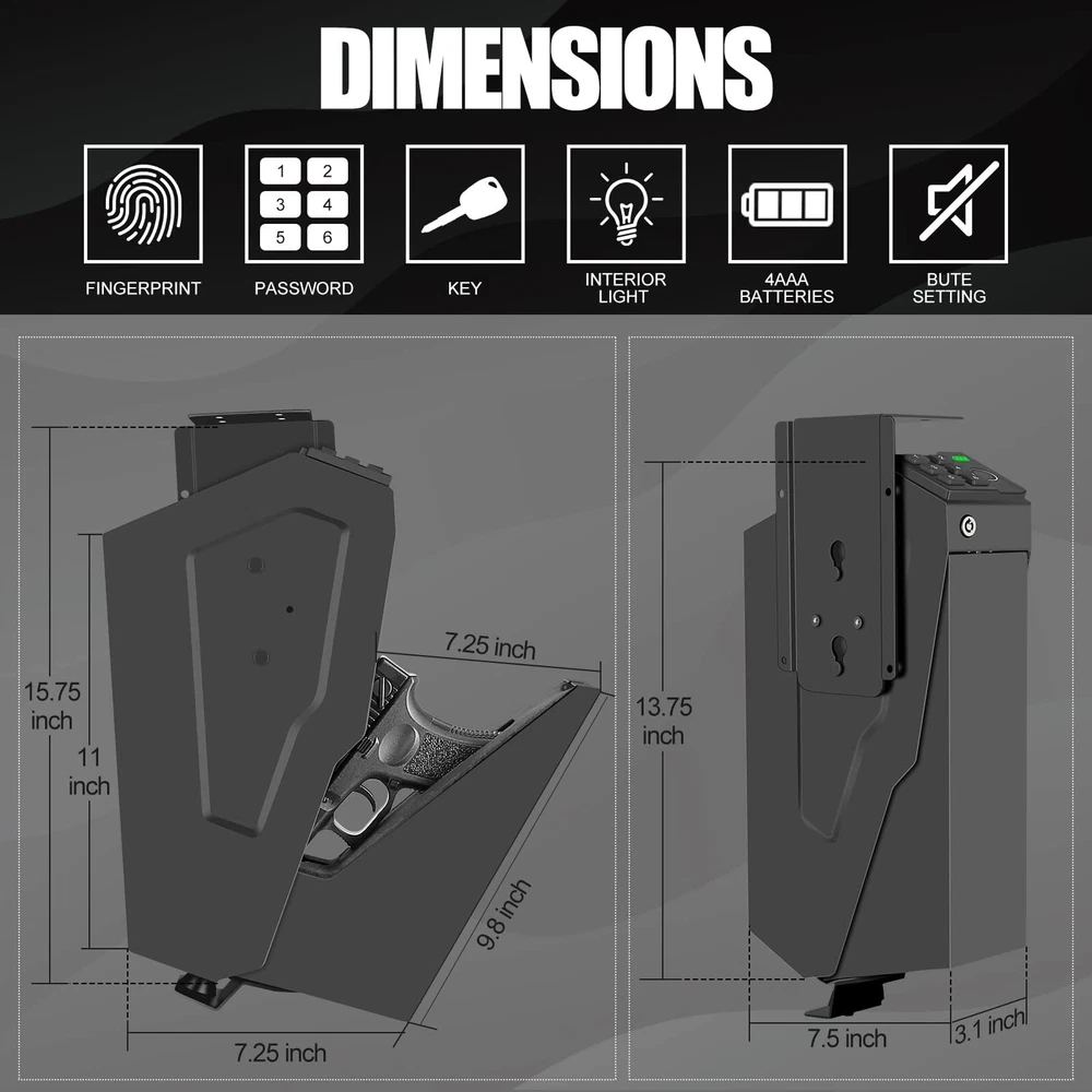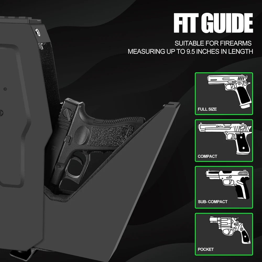 Biometric Mounted Handgun Gun Safe for Nightstand, Desk, Bed Side, Wall,Truck - Auto Open Hidden Hand Gun Safe for Pistol -with Fingerprint, 6-button Backlit Keypad, KEY Access Biometric Handgun Safe for Nightstand The safe is solidly built with 100% steel walls and tamper-resistant inner edges, the precision rails system to rapidly deploy the safe open and presents a stored firearm in the ready position in a second. Easily secure your pistol and spare magazine inside foam holster that provides a high level of protection. Specifications: Exterior Dimensions: 2.9"W x 7.5"D x 13.75"H. Net Weight:8.25 lbs. Steel: 16 Gauge wear-resistant carbon steel Biometric Chips: Lastest 508DPI Semiconductor Action Speed: <0.2s Keypad: Backlit Keypad Requirements for Battery: 4 AAA Alkaline Batteries (not included in the box). Capacity: Store a Pistol + Spare Magazine Fit handguns of up to 9.5" length( almost all on the market). Examples: Compatible with 1911, Glock 19, Glock 17, Glock 22, Glock 34, Glock 43, Glock 45, Beretta M9, Heckler & Koch VP9, Walther Arms PPS, Sig p365, Springfield XDs XD9, Aig m18, HK vp9, Ruger P-85, Ruger 57 and lots more. 3 access ways Three Access Ways Biometric Slider Handgun Safe features 3 methods of securing and accessing your pistol.It's equipped with one-touch biometric system and 6-digit keypad can be programmed,our safe also includes 2 emergency keys for quick access. Make sure keep the emergency keys out of your safe in case the batteries die. MORE BENEFITS 【Upgraded Hidden Mounted Gun Safe installed in multiple locations】It hold a max handguns length of 9.5”. Slim Vertical Design stores great under a desk or nightstand, discreetly on a bookshelf, on the wall, at bedside or inconspicuously in a vehicle. The Included Mounting Plate allows for multiple mounting from right, left, or top side depending on desired preference. 【Higher Level of Security TOUGH AND RUGGED & PRY-RESISTANT】This safe weighs 8.3 pounds, the HEAVIEST of the same kind. The 16-gauge carbon steel construction with a durable finish prevents corrosion and ensures long lasting protection for years to come. ANTI-THEFT PROTECTION includes a strong anti-impact latch that keeps the safe securely locked under impact. 【Instant Home Defense, Quick firearm access in the ready position】HIGH RESOLUTION BIOMETRIC SENSOR capable of storing 30 unique fingerprints captures high-resolution fingerprint images with excellent match speed of <0.2 second for extra-fast entry. You can also use manual keys, or 6-button keys(more difficult to open than 4-button models). 【Interior LED Light, Power Display, Super Ddense foam】The LED Light is particularly beneficial if you have your handgun safe in a dark part like nightstand or use it at night. The Battery level display prevents no power in case of emergency. The entire inside has a thick super dense foam, no moves no shakes sliding out or pushing inside. 【Wrong Access Beep, Silent Mode】The safe will beeps and can't get access by PIN code if wrong access for 3 times. Also you can also turn off the sound. It is important function when you have introducer at night or you want to use the safe without distubing others. 【Cpmplete Accessories and 24/7 customer service】If you have any question, please feel free to contact us (Through the order or Email), we provide high standard 24/7 customer service. CLICK THE ADD TO CART BUTTON NOW! SHIPPING We work diligently to ensure your package arrives as quickly as possible. Please understand that factors such as weather, high postal traffic, and carrier performance are beyond our control. We offer free shipping to the lower 48 states and most items ship within 3 business days of payment M-F excluding federal holidays, often sooner. Unfortunately, we cannot ship to P.O. Boxes—please provide a physical address for delivery. International Shipping Items shipped internationally may be subject to customs processing, depending on the item’s customs value. As the buyer, please be aware of potential: Delays due to customs inspections Import duties and taxes required by your country which are paid by you the buyer, not the seller Brokerage fees due at the point of delivery For more information, please contact your country’s customs office, or visit eBay’s page on international trade. PAYMENT All payments are handled through eBay managed payments. if you have a question related to payments accepted, you must reach out directly to eBay for further assistance. If you are not 100% satisfied with your purchase, you can return the product and get a full refund. Returns are accepted up to 30 days from the date of delivery. Any product you return must be in the same condition you received it and in the original packaging. Perishable Foods Please note all perishable foods are always packaged in a new sturdy corrugated box and are delivered to our customers before the expiration date.