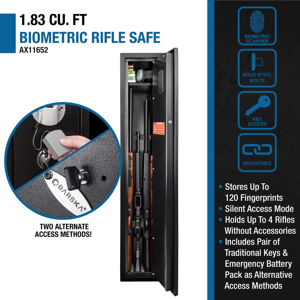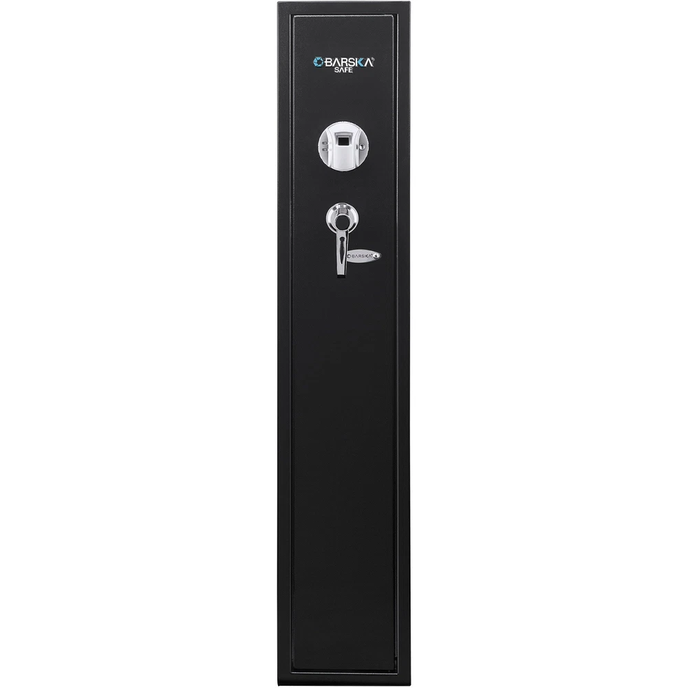 Secure Your Firearms with this Biometric Rifle Safe This California DOJ approved rifle safe provides secure and discreet storage for your firearms and accessories. It features a biometric lock with silent mode for quick and quiet access, and can store up to 120 unique fingerprints. 1 Made from durable steel, this safe is perfect for home or business use. Specifications: Main Color: Black Main Material: Steel Assembled Length (in.): 8.60 Assembled Width (in.): 9.80 Assembled Height (in.): 52.17 Weight (lbs): 63.00 Features: Secure Firearm Storage Secure and Silent Access Ample Storage Space Versatile Placement Rapid Access & Extensive Memory
