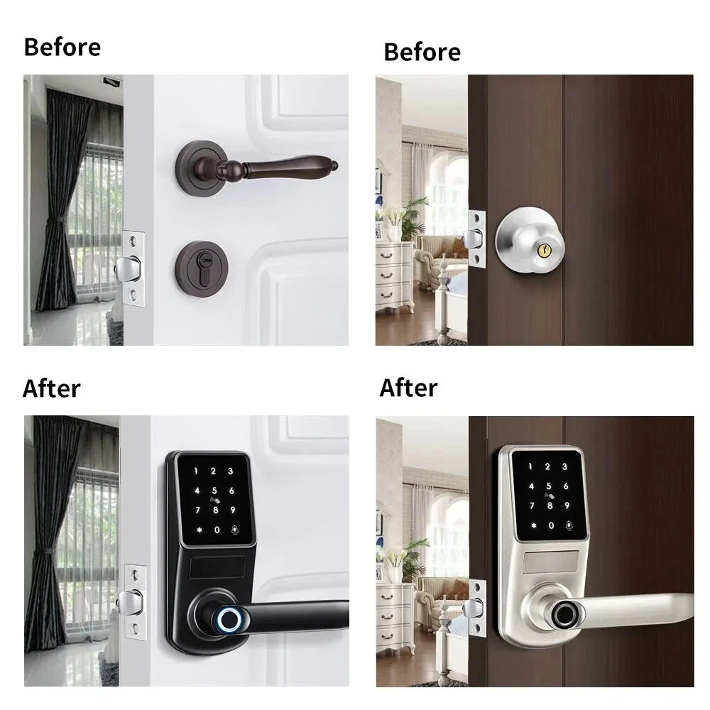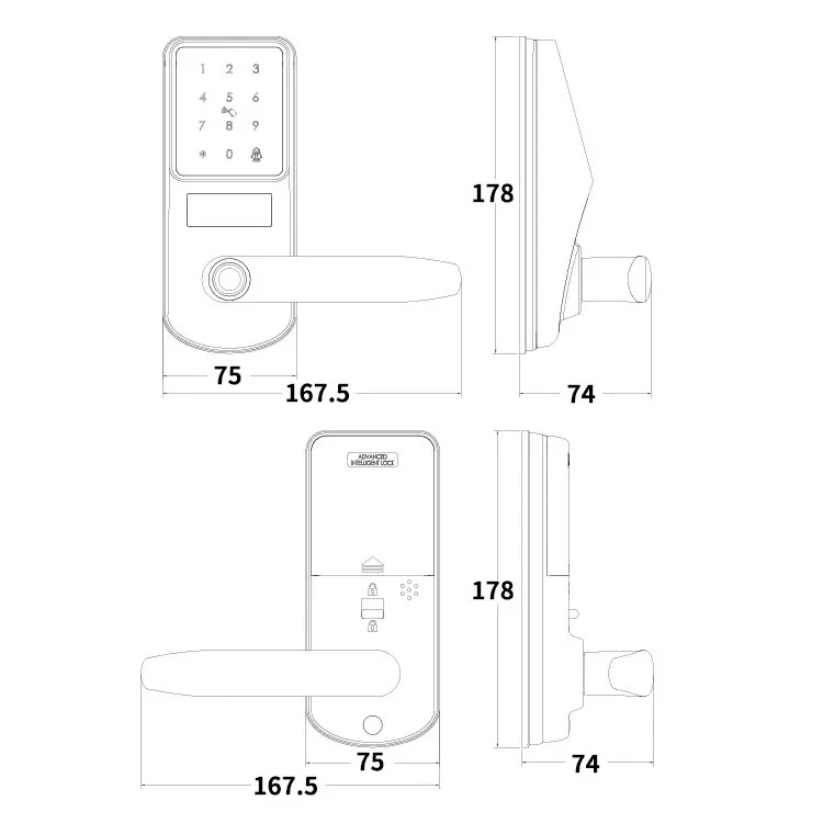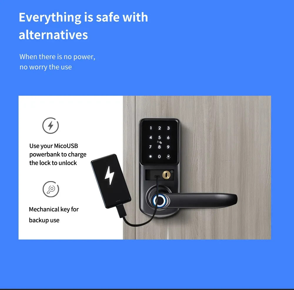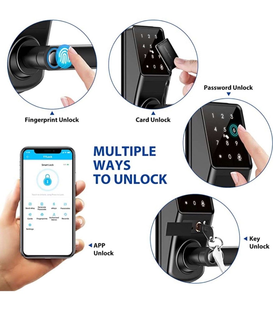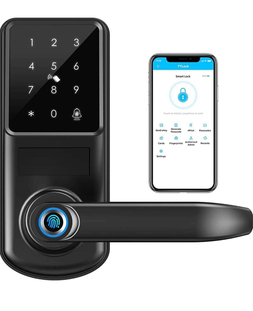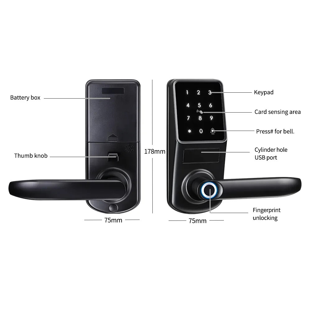 - A290 Smart Door Lock with Fingerprint Reader and Levers The A290 5-in-1 Keyless Entry Smart Door Lock offers 5 non-traditional methods to unlock. It has quick recognition and is usable by 100 users as well as capable of producing temporary time-limited or one time pass codes for guests and housekeepers. You may also remotely unlock the door through the app in approximately 1-1.5 seconds. The door can also be unlocked with a standard key. Never worry about forgetting to bring your keys again. Through its hijack alarm and app alerts this door lock can provide you reassurance your home is safe. Ways to Unlock: App-control Unlock: Use your mobile phone to unlock door. You can remotely or when you're physically close to the door grant someone immediate access and to manage your door unlock history by using an app on your phone to open your door. Utilize a single mobile app to control numerous door locks. Fingerprint Unlock: Immediately unlock using fingerprint. With just 0.5 seconds, you can use your fingerprint to unlock your door and avoid wasting time searching for your keys all over the place. Set up a large amount of fingerprints for unlocking access. Password Unlock: With a passcode you can enter directly on the door handle digital type-pad, you can unlock your door in a matter of seconds. Easily manage a large quantity of passcodes from your mobile app to grant access momentarily or permanently. RFID Chip Unlock: Unlock via RFID Chip. Key Fobs and cards are compatible with this smart lock making it easily accessible with a simple tap. Physical Key: If you have not added access or forgot a pin no worries as this smart door lock is also accessible by traditional key. Specifications: Material: Aluminum alloy, ABS, Glass Color: Black Battery Life: By 10 Times Normal Unlock (10-12 months) Available Mortise: Standard Adjustable Single Latch, 5050/5572/5070/4585/6085 Support OS: iOS 7.0 or above, Android 4.4 or above Unlock Direction: Universal for left/right Suitable door thickness: <35-55 mm Suitable door types: Steel door, wooden door, brass door, stainless steel door