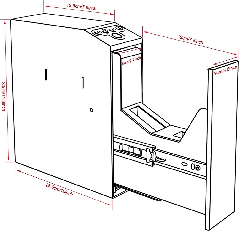 Fits a handgun up to 9.5" length ( almost all on the market). and 1 spare magazine. Allows for multiple mounting configuration from TOP, RIGHT, LEFT side or sit directly on the floor. Stores great under a desk or nightstand, discreetly on a bookshelf, on the wall, or inconspicuously in a vehicle. 【TOUGH AND RUGGED Slider Design, HEAVIEST Safe】The HEAVY DUTY pistol safe weights12.5lbs, the HEAVIEST of the same kind. The 16-gauge carbon steel construction with a durable finish prevents corrosion and ensures long lasting protection of your device for years to come. ANTI-THEFT PROTECTION includes a single anti-impact latch that keeps the safe securely locked under impact.