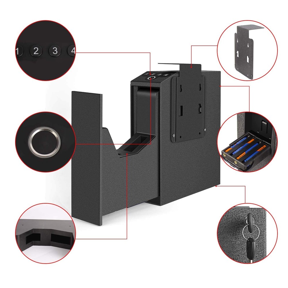 Biometric Fingerprint Slider Handgun Gun Safe for Nightstand, Desk, Bed, Truckl - Auto Sliding Door Hand Gun Safe for Pistol -with Fingerprint, PIN Code, KEY Access Fits a handgun up to 9.5" length ( almost all on the market). and 1 spare magazine. Allows for multiple mounting configuration from TOP, RIGHT, LEFT side or sit directly on the floor. Stores great under a desk or nightstand, discreetly on a bookshelf, on the wall, or inconspicuously in a vehicle. 【TOUGH AND RUGGED Slider Design, HEAVIEST Safe】The HEAVY DUTY pistol safe weights12.5lbs, the HEAVIEST of the same kind. The 16-gauge carbon steel construction with a durable finish prevents corrosion and ensures long lasting protection of your device for years to come. ANTI-THEFT PROTECTION includes a single anti-impact latch that keeps the safe securely locked under impact. 【Instant Home Defense, Quick firearm access in the ready position】 The digital PIN Code allows you to get quick access to your firearm. If your fingerprint is rough, it can't be easily read by the fingerprint reader. Then this password version is perfect for you. You can also use manual keys if needed. The sturdy safe prevents children and others from reaching inside. 【Easy installation】Install the safe from the top, left, right side of a flat surface using included screws or sit directly on the floor upright. The entire inside has a thick super dense foam, no moves no shakes sliding out or pushing inside. 【Wrong Access Beep, Silent Mode】The safe will beeps and can't get access by PIN code if wrong access for 3 times. Also you can also turn off the sound. It is important function when you have introducer at night or you want to use the safe without distubing others. 【Cpmplete Accessories and 24/7 customer service】If you have any question, please feel free to contact us (Through the order or Email), we provide high standard 24/7 customer service. CLICK THE ADD TO CART BUTTON NOW!