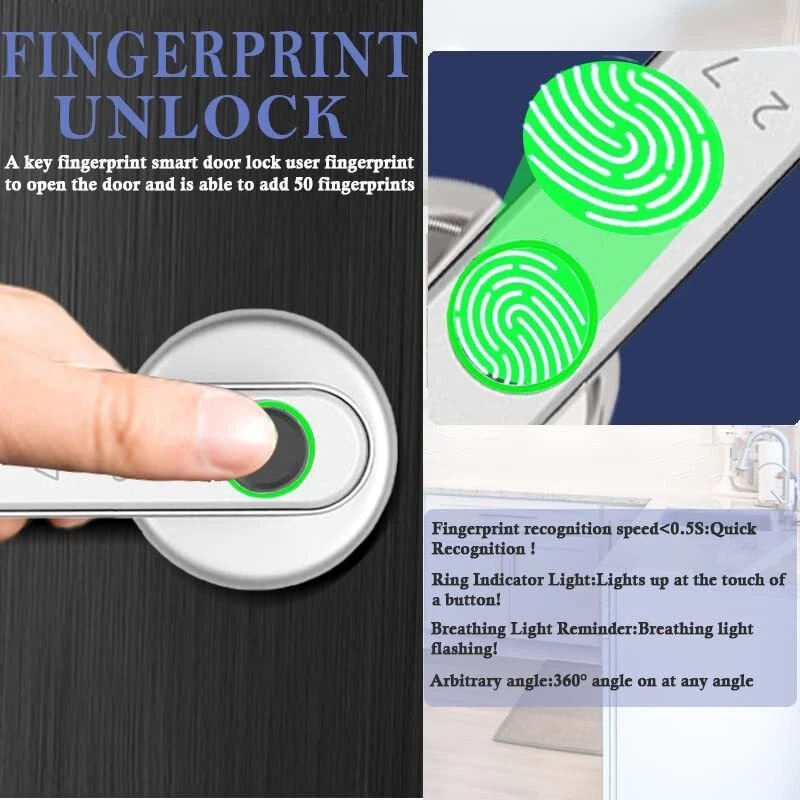 Biometric Door Lock with Handle APP Control Fingerprint Smart Door Lock Description 【4 in 1 SMART DOOR LOCK】Smart door lock has a fingerprint unlocking, APP unlocking, key unlocking, password unlocking four unlocking methods, is a perfect fingerprint smart door lock with handle! 【INTELLIGENT LIFE】A key Fingerprint smart door lock uses fingerprints to open the door and is able to add 50 fingerprints, and supports APP control, check the unlocking record through APP, you can set 100 passwords or set a temporary password and share it with friends, family or visitors, intelligent security technology will guard you and your family's safety! 【EASY INSTALLATION】The smart door handle door lock can be easily installed in minutes with a screwdriver, we have detailed installation instructions, very easy to install, no wiring and no drilling, fits most US doors, meets your every need! 【PREMIUM DESIGN & HIGH QUALITY MATERIAL】Biometric door lock with handle is made of high quality aluminum alloy material, it is clear, smooth and easy to clean, and with classic door handle design, it also adds fingerprint lock, password lock and APP unlock function, it is the ideal choice of smart door lock for bedroom door, office, hotel, apartment! 【NOTE】The smart door lock is suitable for wooden doors between 30-55mm, fire doors, security doors, etc. 4 AAA batteries are required for installation, when you low battery mode after the USB interface can also be used for emergency power supply, but please note that do not charge, replace the batteries again, if there are other problems feel free to consult us!