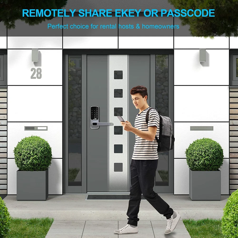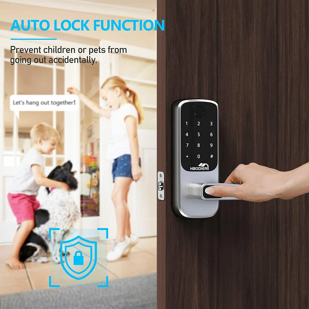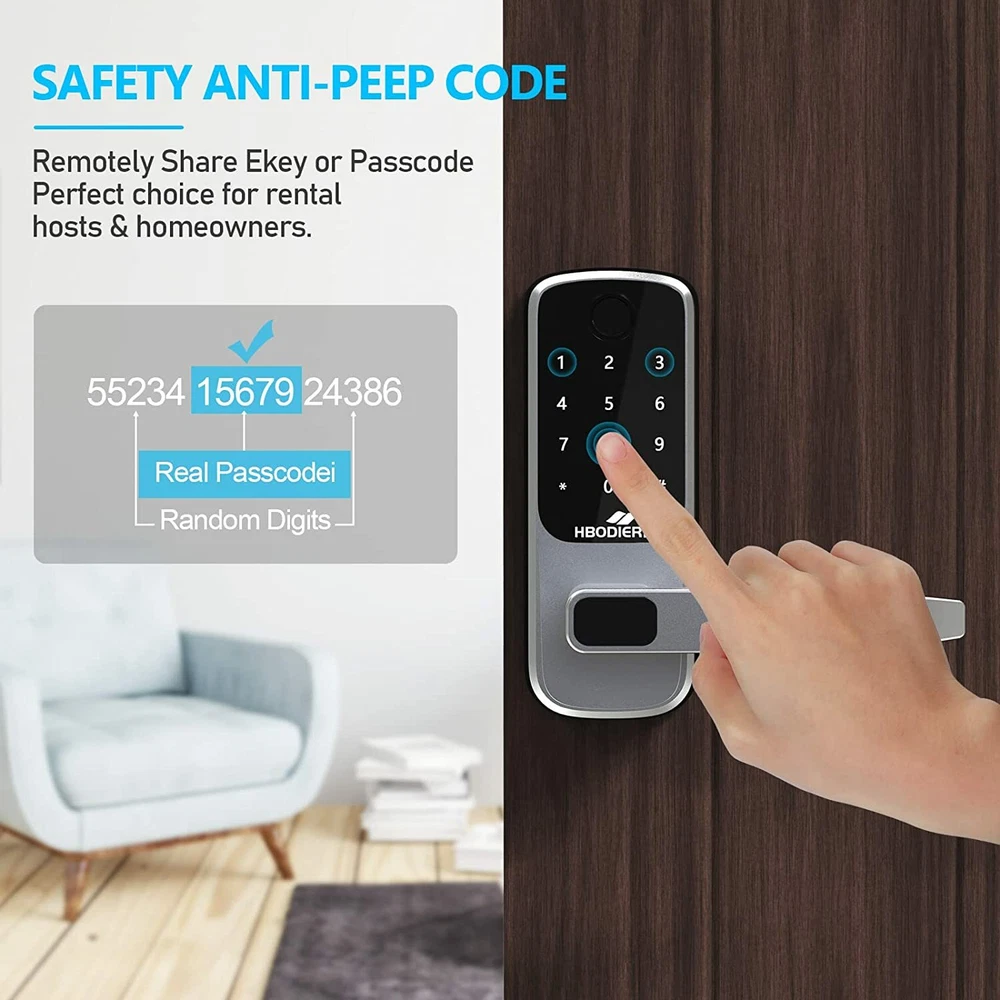About this item 【Smart & Secure Door Lock】The keyless smart lock with handle fit for 1-5/16'' ~ 2'' (33mm-50mm)thick door. Reversible handle lock is suitable for both left-handed & right-handed. Totally you can manage 200 of user code, built-in auto-backlit Touchpad. Ideal new home gifts for the home! 【5-in-1 Smart Lock】Unlock Hbodier smart door lock with your fingerprint, card, passcode, backup key, security APP. Multiple fingerprints can be set through the APP, bringing you a fast & best secure recognition system. You don't need to worry about forgetting to bring the key or smartphone. Accurate and extremely responsive unlocking response works perfectly for kids and the elder. 【Guard Your Family Safe】Security with the electronic door lock is much higher than other locks, the automatic door locks could be locked automatically within 5-120s. No worries about forgetting to lock your door ever since. Set the one-time or Customized passcode for guests, visitors, or other people. When entering the password incorrectly more than 5 times, the deadbolt lock will lock for 5 minutes and the admin could track all unlock records by phone in real-time. 【Easy Installation】Detailed installation instructions are included with the package. Even if you don't know anything about the installation principle, just follow each step in the manual to install, and you can get a perfect smart door lock. All installation steps require no additional drills or holes, just a normal screwdriver and the tools included in the package to complete the installation 【Worthy Customer Service Warranty】Our Smart lock App is free to use. No hidden charges or long-term costs. 30-day money-back guarantee, 1-year product warranty, and lifetime customer support following the date of purchase. Our security smart lock special design----Safety Anti-peeing Code will increase your security level- only the user can read and unlock the lock. 5 Ways to Key-Free Access To Your Home 99.9% Read Fingerprint Identification HBODIER groundbreaking smart lock correctly recognizes registered fingerprint up to 99% of the time when placed correctly on the scanner. and opens your smart deadbolt in just 0.2 seconds. It’s faster and safer than bring for your keys. Also, your "biometric identity" and other personal data are stored locally on the smart lock device so your personal information is never shared. Your mobile phone is your key HBODIER smart Keyless Lock is User Friendly for All Ages, the App lets you set permission levels for everyone in your life. Whether it's 1 Time Use Code for a express service Permanent Code for your Grandpa, Schedule Time Codes for Babysitters, Employees or your guests, you can share 150 temporary codes. - It is simple and secure. Anti-peep Touch Screen Keypad Code The keyless keypad door lock enter up to 12 digits including real code. Add random digits before or after your real code to protect your passcode from prying eyes. Each finger tap is accompanied by immediate feedback - a quiet "beep" and slight dimming of the pressed number, with backlit lights, convenient usage for day or night. Use IC Card to unlock Don't like codes? The secutriy smart lock come with 2pcs high-performance IC cards, it is compact, convenient to carry and faster to unlock, setting up IC cards in your smartphone App is extremely easy! That are designed to unlock your smart locks deadbolt in just 0.2 Seconds after contact. Smarter Home Security Keyless Entry The fingerprint Smart Lock features a hidden compartment for accessing the door lock with standard keys (the old fashioned way). Every lock comes with 2 keys. The keys are unique.This not only improves security, and you don’t have to worry about being locked outside under any circumstances. Low Battery Alert, Unlock in an emergency Power backup What do you do if the batteries inside the lock die—and you’re stuck outside? Smart Lock feature external posts to which you can use a micro USB cable connected to a power bank, giving you enough juice to get the door open. Protect Your Home with 5-in-1 Smart Lock Set New fingerprint door lock with keypad, suitable for both left handle and right handle. Just use the L wrench (include) to remove the hex socket screw and change the direction. It comes with abundant accessories and batteries, and also with AUTO LOCK function, great smart home devices for home, apartment, hotel. Important Installation Tips 1. Please Note the L/R side has different install method. 2.Please note you are setting the corret direction for toggle button(L/R). Otherwise it will be backwards. 3.If you can't use the APP or keypad to control unless insert a key(lock is stuck), please help to check: re-install after rotate the spindle by 90 degree.