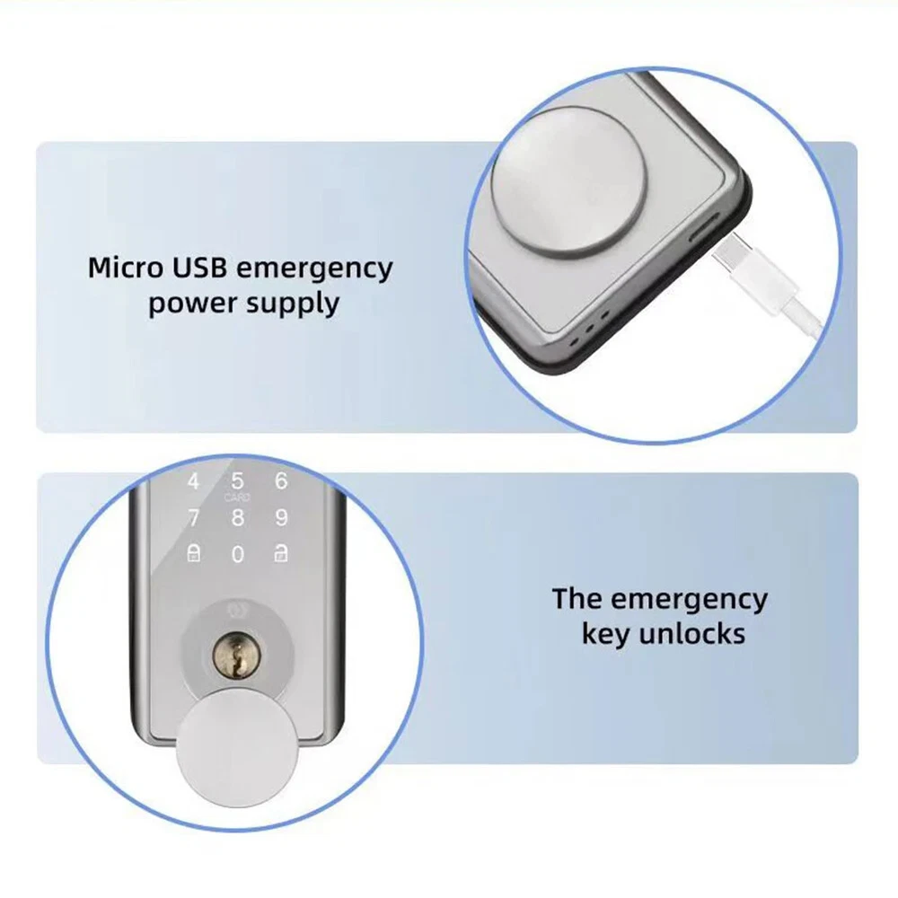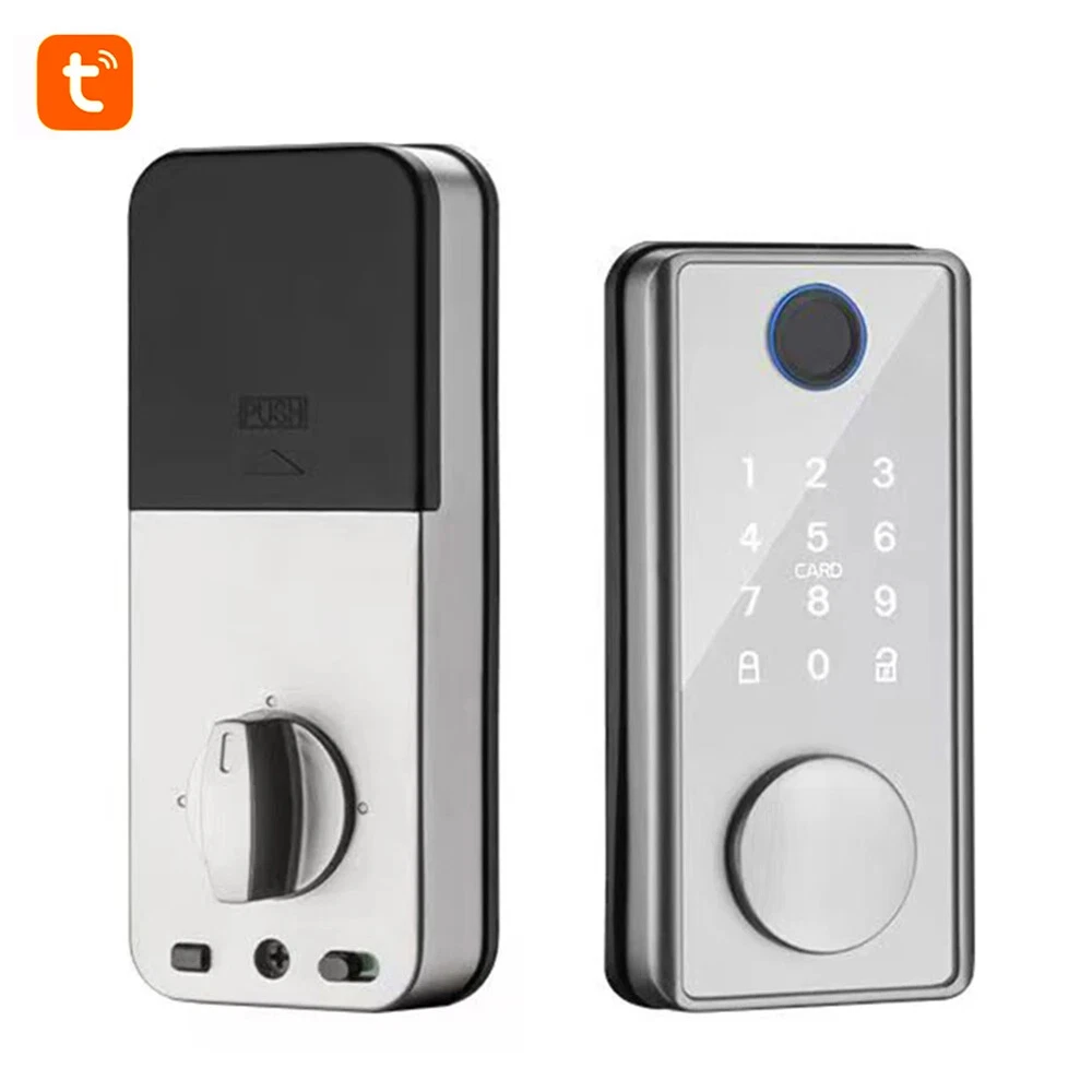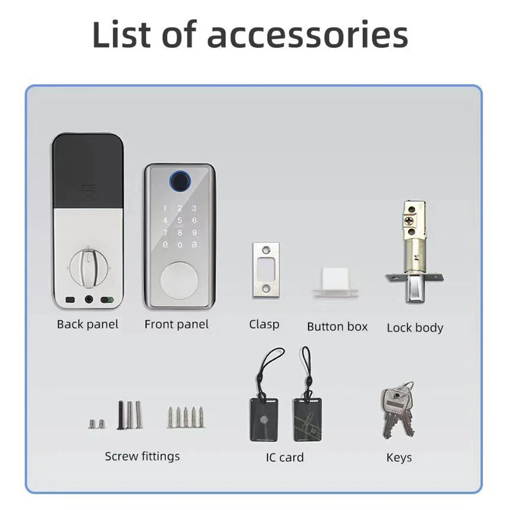 Desc ription Feature: 1. Multiple Unlocking Options: This smart door lock offers multiple unlocking options including Tuya app, 100 sets of passwords, 100 sets of fingerprints, 2x IC cards, and 2x keys, giving you the flexibility to choose the most convenient method for you to unlock your door. 2. Smart Tuya App: The Tuya app allows you to easily manage, monitor and control the lock remotely, and receive real-time alerts, including opening record, abnormal alarm, remote unlocking, etc. 3. Large Capacity: This lock has a large fingerprint capacity that can store up to 100 fingerprints and 100 sets of passwords, making it easy to add or remove user information as needed. 4. Quick and Accurate Unlocking: With its ergonomic design and semiconductor fingerprint sensor, this lock accurately identifies your fingerprint and unlocks in seconds, providing quick and easy access to your home. Also, when the battery is dead, you can use a backup key or connect a power bank via the USB Type-C port to temporarily supply power. 5. Anti-Peep Design: The anti-peep password entry system prevents others from stealing your password by allowing you to enter random numbers before or after the correct password, ensuring the security of you and your family's personal information. Specification: Product color: Silver, Black Model: DS01 Product material: aluminum alloy Product options: (optional) Style A: Fingerprint + password + card swipe + key Style B: Fingerprint + password + card swipe + Tuya Smart + ke y Fingerprint collector: semiconductor fingerprint head Unlock method: fingerprint/password/key/Tuya app User capacity: fingerprint/password/card (100 sets each) Number of administrators: 3 Function selection: wired door magnet/Tuya app Dynamic current: ≤ 60UA Quiescent current:>250mA Emergency power supply: USB Type-C interface Power supply: 6V (please choose alkaline 1.5V battery) (the product does not include batteries) Low voltage alarm: 4.7V ± 0.2V Relative humidity: 20%~90% Working temperature: -25 ° C~70 ° C Applicable door thickness: 35-85cm Applicable scenarios: indoor wooden doors/office doors/entrance doors/apartment hotel doors Size: about 168 * 67mm/6.61 * 2.63inch Note: Due to the different monitor and light effect, the actual color of the item might be slightly different from the color showed on the pictures. Thank you! Please allow 1-2cm measuring deviation due to manual measurement. Packages included: 1 x Smart door lock body 1 x Installation accessory kit 2 x Keys 2 x IC card 1 x Instruction manual