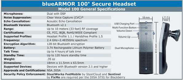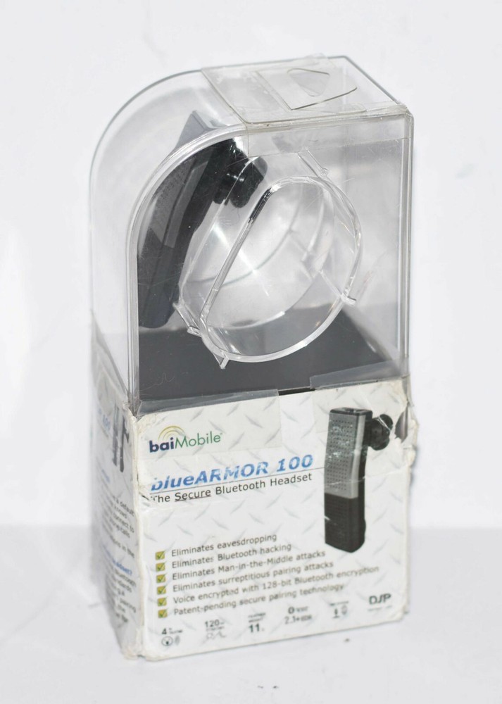 I purchased this from an estate sale - it appears to have not been used, but I can't be certain of that so I will list it as pre-owned. The box shows wear. The blueARMOR 100 Secure Headset is the first headset designed to meet government security requirements concerning the vulnerabilities of Bluetooth. This is a high quality, dual microphone headset that employs the security technology as well as software that elevates recording quality while enhancing noise suppression and echo cancellation. Millions of Bluetooth headsets are sold each year for use with cellular phones, allowing hands-free operation - when driving a car or carrying luggage at the airport terminal, a Bluetooth headset is the practical solution. Unfortunately, today's standard commercial Bluetooth headsets are relatively insecure due to several key factors. Privacy requires encryption that is based on properly authenticated devices during pairing. Headsets do not provide a mechanism to authenticate the remote device during pairing. Most headsets will pair with an attacking remote device without user intervention. Bluetooth attacks involve eavesdropping, identity detection, location tracking, denial of service, unintended device control and access to personal data and voice channels. A hacker who has managed to compromise a mobile phone may be able to comprise network resources as well. Hackers can attack one Bluetooth device in order to gain access to another connected device. Bluetooth headsets also natively support a set of powerful telephony commands that can be used to compromise the content and functions of the phone such as remotely forcing the phone to dial a particular number. Inherent vulnerabilities in existing headsets allow a hacker to remotely connect to an idle Bluetooth headset and eavesdrop on the wearer's conversations. Key Points Eliminates eavesdropping Eliminates Bluetooth hacking Eliminates man-in-the-middle attacks Eliminates surreptitious pairing attacks Voice encrypted with 128-bit Bluetooth encryption Secure pairing technology FREE SHIPPING within the US!