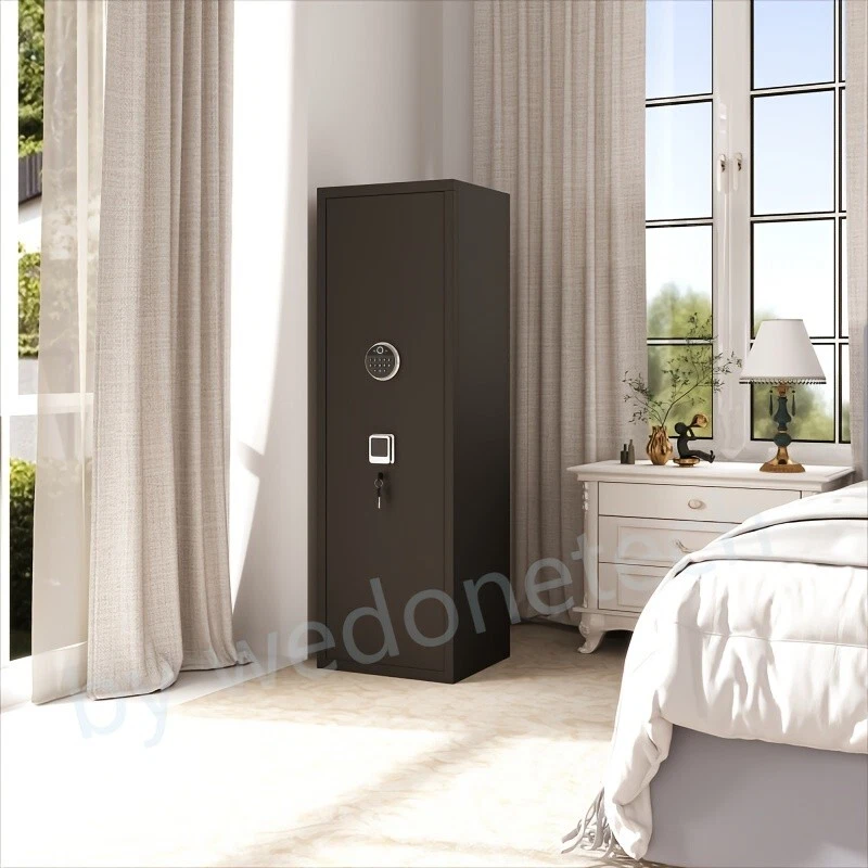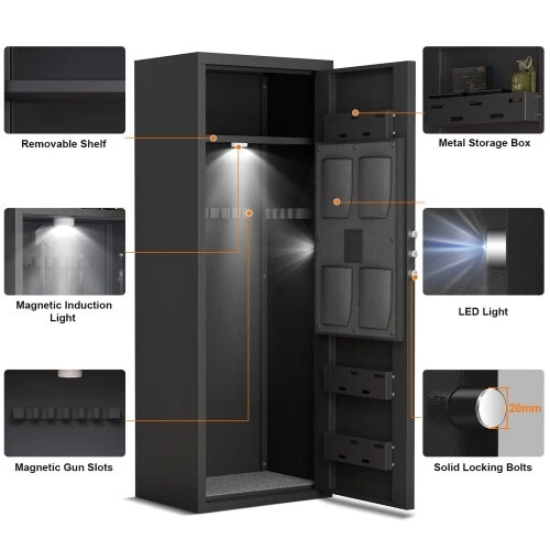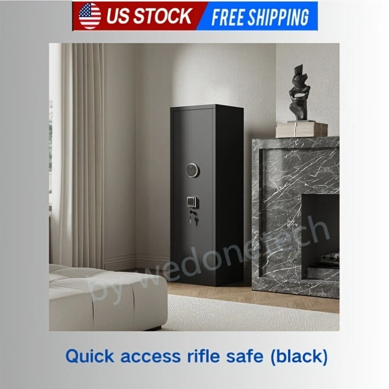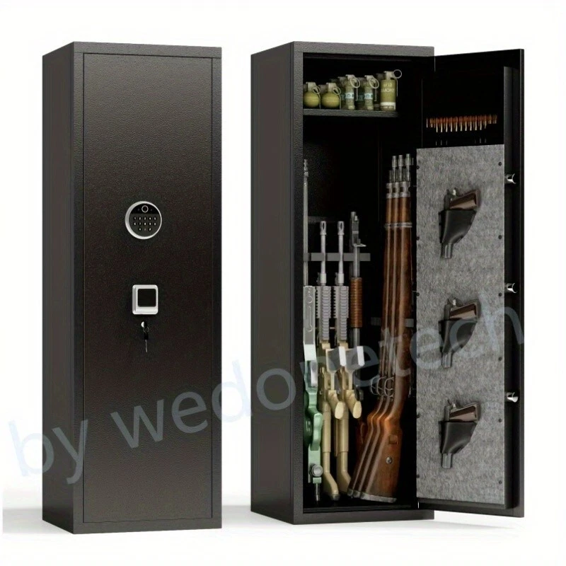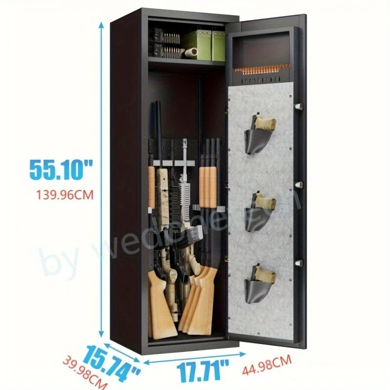 Dear customers, to celebrate the opening of our new store, we are offering the following promotional activities: 1. Customers can enjoy a 5% discount on purchases over $50 for all products in the store; 2. Each person can enjoy the right to use the coupon three times; 3. In addition, our store supports a 30 day return and exchange policy; 4. Some products are free of shipping. Wishing you a pleasant shopping experience~ Product Information Item Code: Product Type: General Item Product Name: Large Gun Safe Cabinet With 3 Pistol Pouches, Heavy Duty Biometric Fingerprint Lock, Rifle Gun Safe With Adjustable Stand, Detachable Structure Gun Safe, Rifle And Shotgun, Gun Money Storage Cabinet Place of Origin: China Main Color: Black Main Material: Metal Filler: Metal Product Style: Classic Use Case: Primary Living Space Product Dimensions Assembled Length (in.): 17.71 Assembled Width (in.): 15.74 Assembled Height (in.): 55.10 Weight (lbs.): 77.38 Package Size Length (in.): 59.44 Width (in.): 22.04 Height (in.): 9.05 Weight (lbs.): 90.16 Product Features Our gun cabinets have three ways of unlocking:1.Fingerprint unlocking 2.Password unlock 3.Key unlocking , preventing unwanted guests from accessing your firearms and valuables. High quality materials, the gun cabinet is made of thickened steel and has a pry alarm function. The gun cabinet is simple and beautiful, with flannelette, which can prevent the wear and tear of firearms or valuables items. The multi-purpose rifle safe is equipped with a detachable gun rack inside, which can be adjusted and arranged according to the length of the rifle. The safe door comes with ammunition storage and three handgun organizer pockets to help you save more storage space. Easy to install, we are equipped with detailed installation instructions for quick and accurate installation completion.