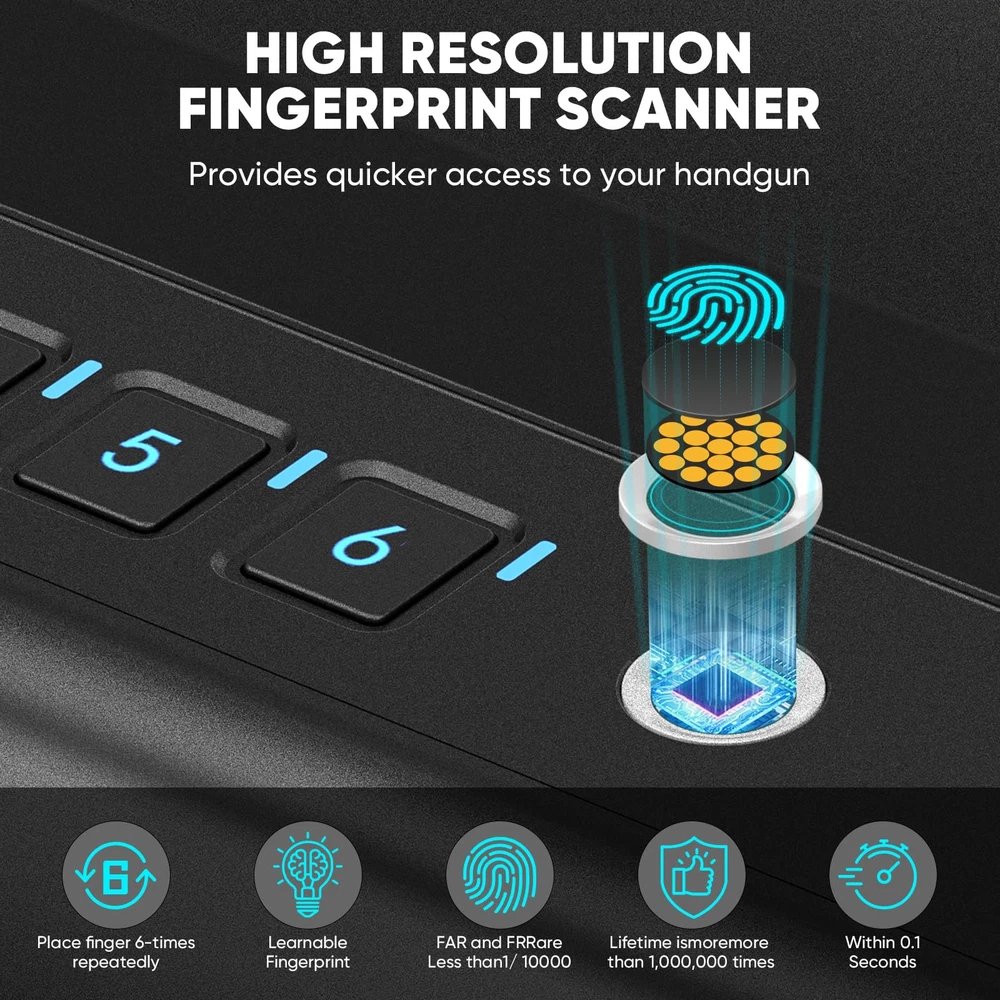 The Portable Pistol Safe with Fingerprint Lock is a great solution for securely and conveniently storing handguns, passports, cash, credit cards, watches, jewelry, and more. It can hold 1 pistol and clips or 2 pistols. It is great for securing your firearm inside your personal vehicle and hotel. Also you can use it as your bedroom safe, living room safe, or closet safe. 3 Access Ways&Silent Mode:Fingerprint/PIN code/Key three ways to unlock the gun safe. Convenient Access: An advanced biometric fingerprint sensor allows you to access the safe quickly and easily with your fingerprint, storing up to 20 trusted fingerprints for authorized users. Allowing access with just a touch within 0.1 seconds for fast retrieval in an emergency. Portable Protection: At only 10.5" x 7" x5", the compact and lightweight design makes this safe portable so you can securely store your valuables wherever needed. Intuitive Design: Setup and use of the fingerprint lock is simple and intuitive,