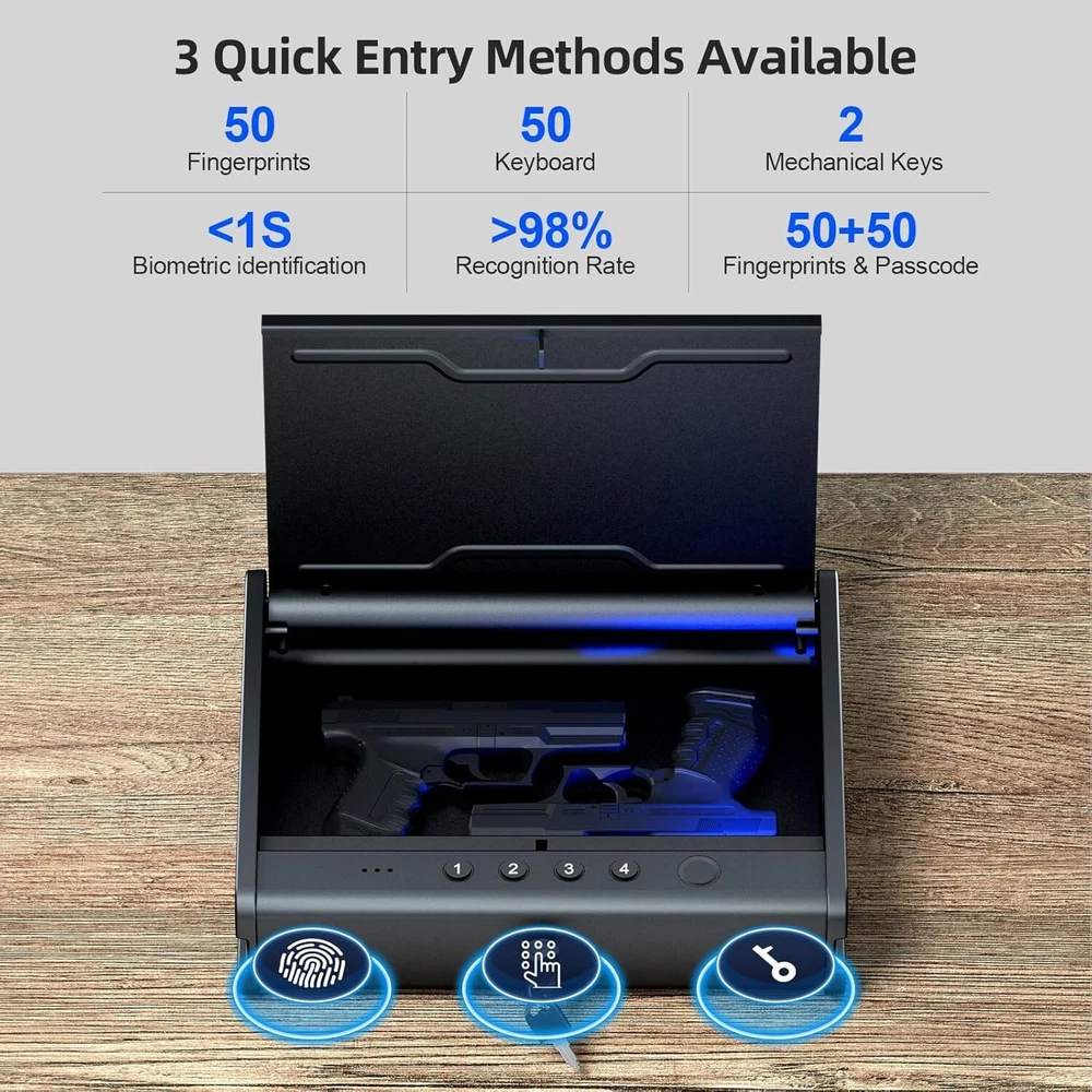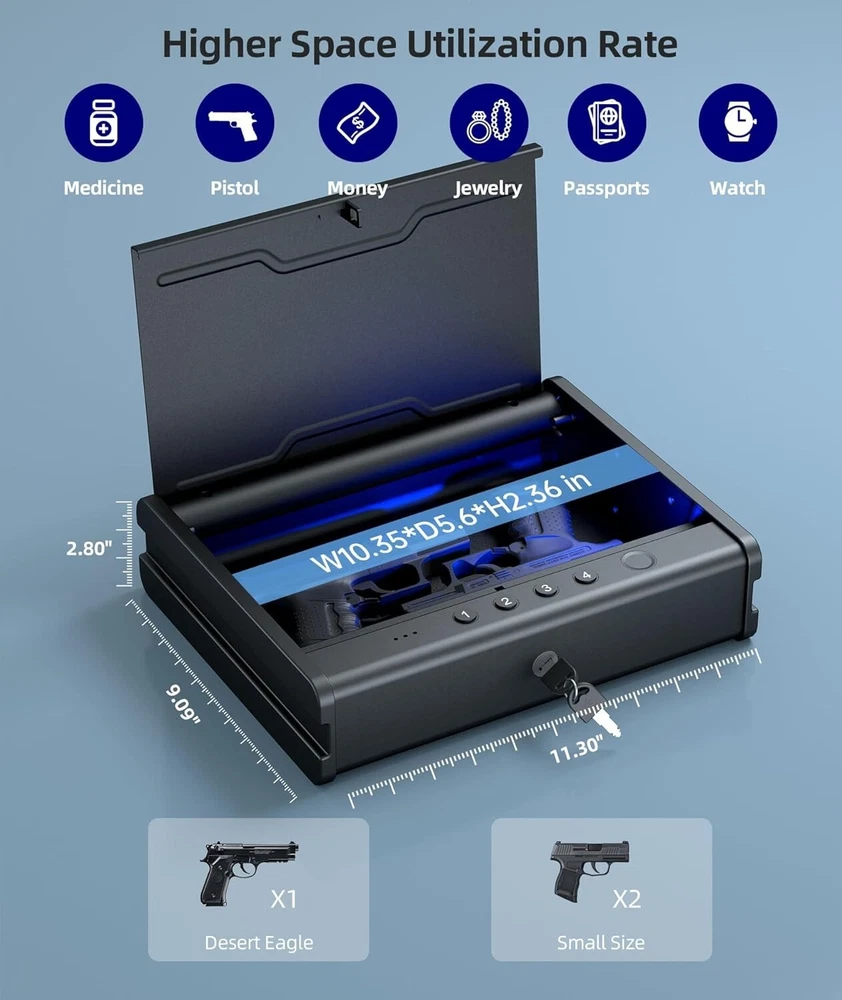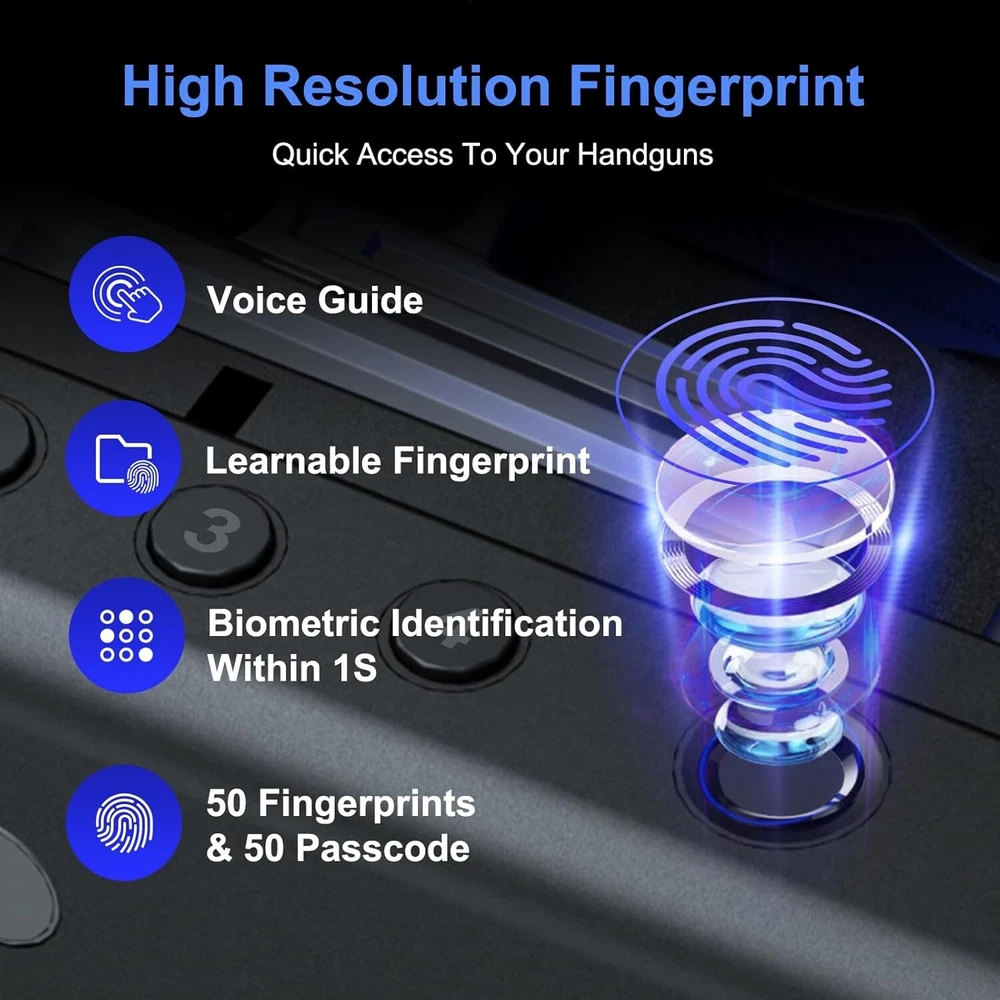 Gun Safe,Biometric Gun Safe For Handgun, Pistol Safe With Fingerprint Backlit Keypad, Quick Access Handgun Safe for Firearm, Gun Lock Box With Interior Light For Nightstand Car Normal Size About this item Higher Space Utilization Rate: The gun safe for pistols can easily store 1 large pistol (2 small size guns) and other precious items such as jewelry. 3 Unlock Ways Biometric Gun Safe with Steel Cable: It can be quickly accessed via Fingerprint/Passcode/Keys. It is ideal for pistols, cash, and other valuables. Additional steel cable (1.5m) as option to fixed guns safe in a place you want. Biometric Fingerprint with Scanner Light: High definition scanner with quick and easy access which is secure and user-friendly. The fingerprint gun lock can store up to 50 fingerprints which unlock within 1 second, the failure rate less than 0.9%. Raised and Backlit Keypad with Interior Light: Full digital raised and backlit keypad from 1-4 which supports 4-6 digits passcode. It can hold UP TO 50 groups of passcodes. Designed with a LED light for dark night. Mechnical Keys and Mute Mode: 2 Mechnical key ensure the safe can be unlocked. Please keep the keys safely. You can take your handguns sliently in mute mode. Low battery & Trial and Error Alarm: The safe will prompt LOW BATTERIES remind when the battery power of the gun case is low, please replace 4 new LR6 batteries in time. The system will lock for 3 minutes after 5-times error passcode/fingerprint. Easy Operation with Full Vioce Prompt: All voice prompts. You can use the pistol safe more easily. It can keep the children safe as they can't open it without permisson. Wherever you want Place Safe on the nightstand Quickly access in case of emergency to keep you safe. Put PINEWORLD in the office Feel safe at work, get your guns promptly. Take PINEWORLD to the car Protect you and your family during the journey. Store the Safe in the suitcase Provide prompt and timely protection when you need it. High Biometric Definition Biometric identification provides quick-access to the pistols safe within 0.5 seconds. Records 50 fingerprints and the failure rate less than 0.9%. Mute Mode/Prompt Mode You can take your handgun sliently in mute mode which can keep you away from danger. The prompt mode can be easily to adjust when in need. Low Battery Alarm When the battery power of the safe is lower than 4.8V, it will prompt " Low battery, please replace it ", please replace with 4 new batteries in time. Trial and Error Alarm Trial and error alarm (Lock-Down System), 3 minutes lockout after 5 incorrect attempts.