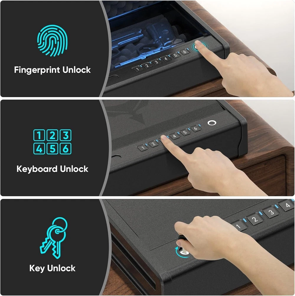 Biometric gun safe for handgun, Quick Access Fingerprint <1s Pistol Safe, Gun Lock Box Gun for Cloakroom Bedroom Nightstand and Car, Black Safe Box, Carbon Steel About this item The Dveron Portable Pistol Safe with Fingerprint Lock is a great solution for securely and conveniently storing handguns, passports, cash, credit cards, watches, jewelry, and more. It can hold 1 pistol and clips or 2 pistols. It is great for securing your firearm inside your personal vehicle and hotel. Also you can use it as your bedroom safe, living room safe, or closet safe. 3 Access Ways&Silent Mode:Fingerprint/PIN code/Key three ways to unlock the gun safe. Convenient Access: An advanced biometric fingerprint sensor allows you to access the safe quickly and easily with your fingerprint, storing up to 20 trusted fingerprints for authorized users. Allowing access with just a touch within 0.1 seconds for fast retrieval in an emergency. Portable Protection: At only 10.5" x 7" x5", the compact and lightweight design makes this safe portable so you can securely store your valuables wherever needed. Intuitive Design: Setup and use of the fingerprint lock is simple and intuitive DVERON SE0101 Biometric Handgun Safe The DVERON SE0101 Biometric Handgun Safe with Interior LED Light is an excellent solution for quick access to your handgun, plus keeping it and your valuables secure. With three methods for quick entry - Key Lock, Biometric Fingerprint, and Digital Keypad - you'll have easy access to your items in any situation. The interior lighting provides increased visibility, making locating your items quickly and efficiently easy. Biometric fingerprint scanner can store up to 20 fingerprint scans, ensuring only authorized users have access. Application Guide Set Button Simply press the "Set" button, which located inside the safe next to the Interior Lighting, to set new password or add new fingerprint Set Biometric Fingerprint 1. Short press the 'SET' Button 1s. 2. Place your finger in the fingerprint recognition area 3 times,and you will hear a long beep indicating that the fingerprint setting is successful Set New Password 1. Short press the 'SET' Button 1s. 2. Enter a new password of 4-6 digits. 3. Short press the 'SET' Button. Then you will hear a long beep indicating that the password setting is successful. Emergency USB-C for low power on The lock comes with a emergency USB-C adaptor (cable included) so that if the batteries run out, you can still use it. Home Quickly unlock, secure home defense. Car Protect you and your family during the journey. Offic Protect you and your family during the journey. Wall Save storage space, instant firearm access.
