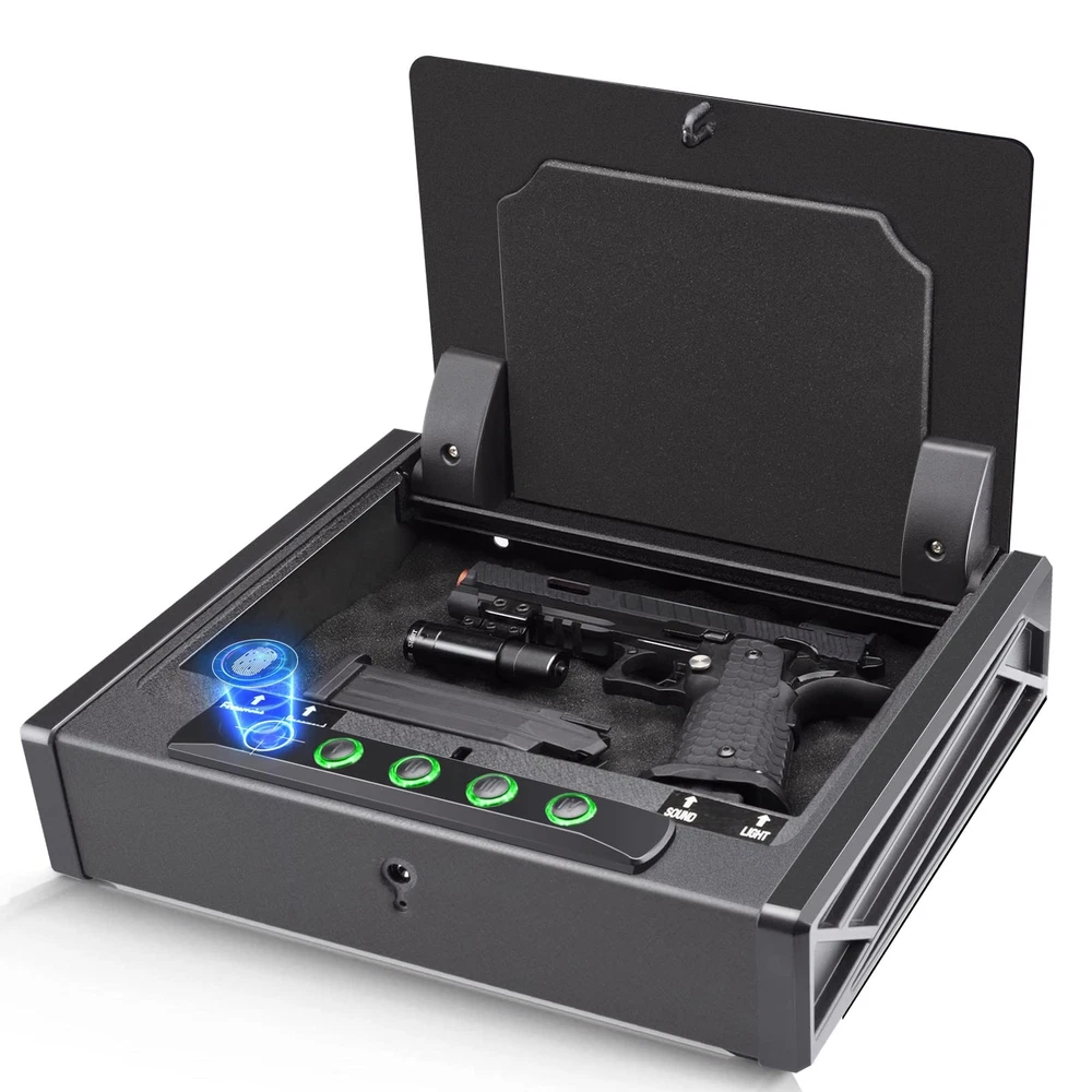 DOJ Certified, Not All Safe Can Pass: Safety of users is our eternal pursuit; The gun safe meets the most rigid safety standards; All tests, picking or manipulating, forced removal inspection, tensile, shock, plug pulling, plug torque, sawing and drop, are approved by California Department of Justice; The DOJ certification tells you that it truly will protect you and your family all the time Whole Body Pry-Resistant: The lid edge slightly larger than the interior box edge, for overlapping perfectly without gap; Interior V-shaped plate of the box body bottom overlapping with lid completely prevents tool penetrating; It's impossible to pry open with hand tools and pistols; It provides secure storage for three standard handguns or one larger pistol and extra ammunition; It Keeps your guns in a reliable rapid pistol safe to prevent gun theft Unbreakable Construction: Besides the thickest solid steel material ( box 1.5 mm alloy steel, door sheet 3 mm ), the rugged stamping surface enhanced toughness to fight most of violent attack or crowbar impact; The reinforcing steeling of the two sides of the handgun safe also makes the lockbox stronger; Loop the high strength steel security cable around a solid object to fix it; It is great safety assistant during your car travel Three Quick Quiet Accesses: Unlock the Swiss upgraded biometric gun safe by registered fingerprint within 0.1 seconds, maximum one hundred fingerprints capacity; You can set a 3~8 digits password with an electronic keyboard; Separate switches for light OFF and sound OFF help to conceal in the dark to ensure your safety in danger and emergency, and to save power; two spare keys allow you to unlock the vehicle pistol safe traditionally Hide Guns Anywhere: The compact size makes the gun safe for pistol easy to place in a regular office, bedroom, basement, closet or under car seats, bedside, drawers, in spare tire wells, and other locations; It keeps your guns away from kids, easy to carry to protect your family and yourself anytime anywhere Customer Service: If you have any problem, please feel free to contact us as soon as possible; We definitely will do our best to deal with it