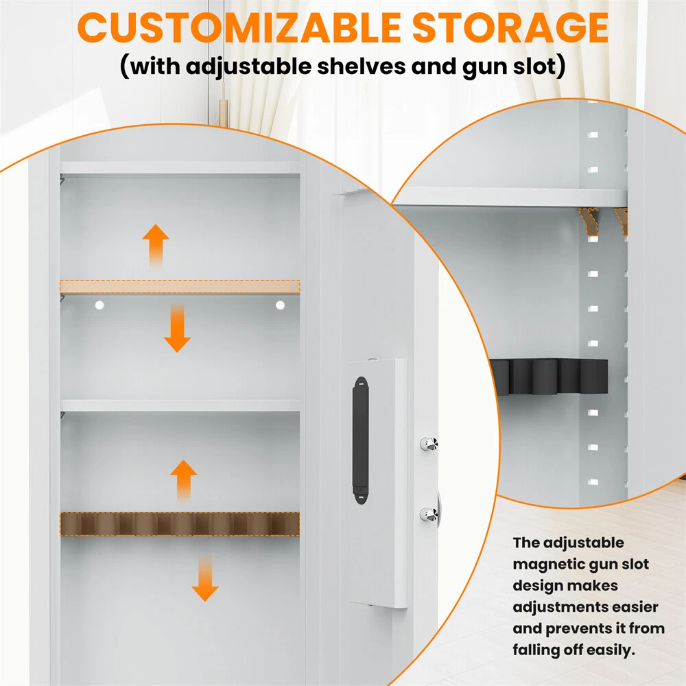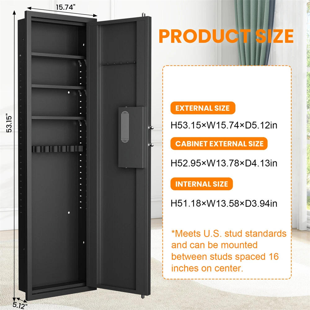 Wall Gun Safe,Hidden Wall Safes Between the Studs for Home Rifle and Pistols 🔥 【Wall Safe】 Our wall safes fit perfectly between studs that are on 16”centers. The large wall safe has enough space inside to secretly store and protect important documents, passports, jewelry, money, pistols, rifles, shotguns, medicines and family heirlooms. It is just the right size of safe and easy to hide. 🔥 【Heavy Duty Steel Construction】 Our wall safes between the studs is made of durable heavy duty steel, 4 solid locking bolts on three sides, all-metal integrated door panel, with a powder coat and scratch resistant finish, provides long-lasting and reliable protection, can effectively resist the attack of hand or power tools, against forced entry and to deter burglars. Digital🔥 【Wall Safe Box with Programmable Keypad】 ①Emergency keys+turning knob. (used for the first time, forgotten password or battery dead); ②Password+turning knob(quick access). NOTE: Please do not put emergency keys into your wall safe. Fingerprint 🔥 【4 Unlocking Methods】 This biometric wall safe features 4 different methods of accessing firearms, providing convenience for you: 1. fingerprint+turn knob (fast access); 2. password+turn knob (fast access); 3. emergency key+turn knob(used for the first time, forgotten password, or when the battery is dead); 4. USB type-c cable + password + turn knob (when the battery is dead). 🔥 【Dual Alarm System and Silent Mode】 The in wall safe are equipped with a dual alarm system. The vibration alarm is triggered by shaking or moving the gun cabinets, the input error alarm will be activated after 3 wrong password attempts. The buzzer will sound for 30 seconds when the alarm is activated, which can be heard throughout the house. To avoid being discovered by thieves or disturbing your children's sleep, it's a great to turn on the gunsafe's silent mode. 🔥 【Lifetime After-Sales Service】 The wall safe comes with a lifetime after-sales service, so that you can use it without worry. Our professional customer service team is online 7/24. If you have any questions, please contact us.