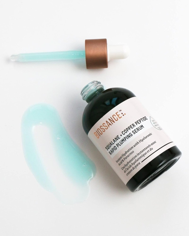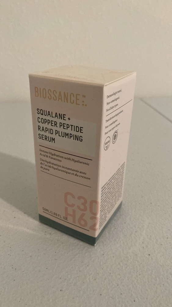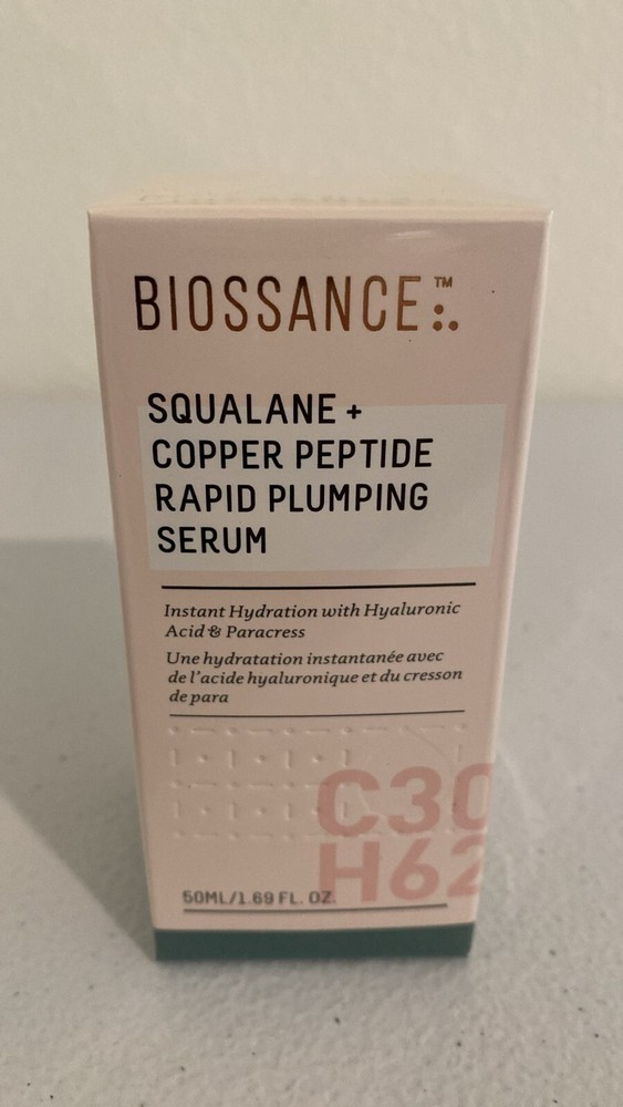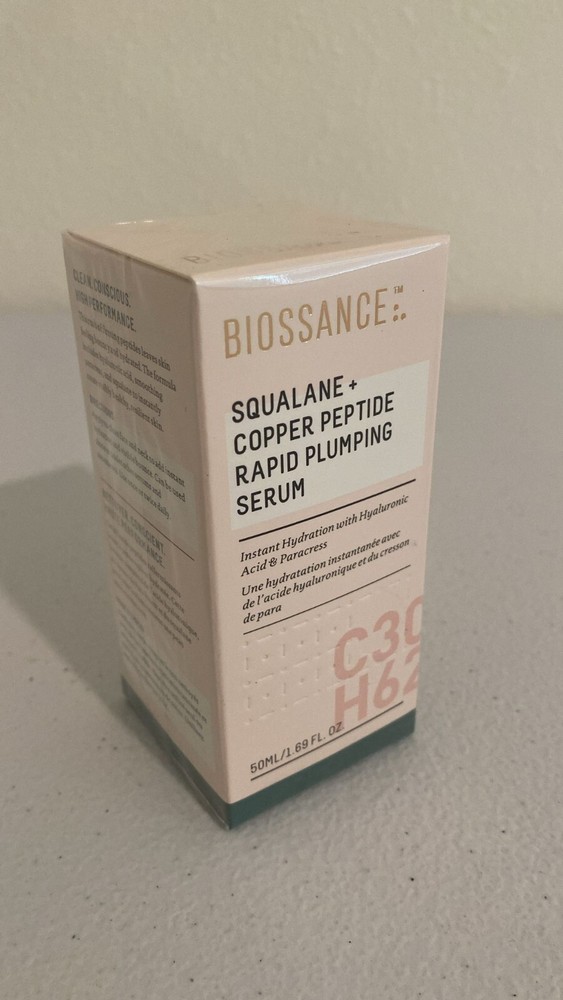 Biossance Squalane + Copper Peptide Rapid Plumping Serum. 1.69 oz - New in box And Sealed. Biossance Squalane + Copper Peptide Rapid Plumping Serum. Powerfully Hydrating Face Serum that Instantly Plumps and Firms with Collagen Boosting Copper Peptides, 1.69 fl oz About this item Biossance Squalane + Copper Peptide Rapid Plumping Serum. Get immediate and lasting hydration powered by our proprietary Rapid Plumping Complex that floods skin with 3 super-hydrators for supreme moisture. Bounce in a Bottle. The non-sticky, silky blue elixir glides onto skin and is absorbed. The serum supplies more hydration than traditional hyaluronic acid serums that can’t maintain moisture. Made with Natural and Effective Ingredients. Copper Peptides support collagen and elastin production for firmer, smoother-looking skin while a blend of hyaluronic acid, polyglutamic acid, and sugarcane squalane plump skin. Part of Your Daily Skincare Routine. Massage one dropper full of the serum onto cleansed face, neck and chest for unstoppable, unparalleled hydration. It can be used morning and night. Committed to Clean Beauty. As part of Biossance’s commitment to high standards for your skin and the environment, all products are vegan, cruelty free and made without paraben or synthetic fragrances or PEG.
