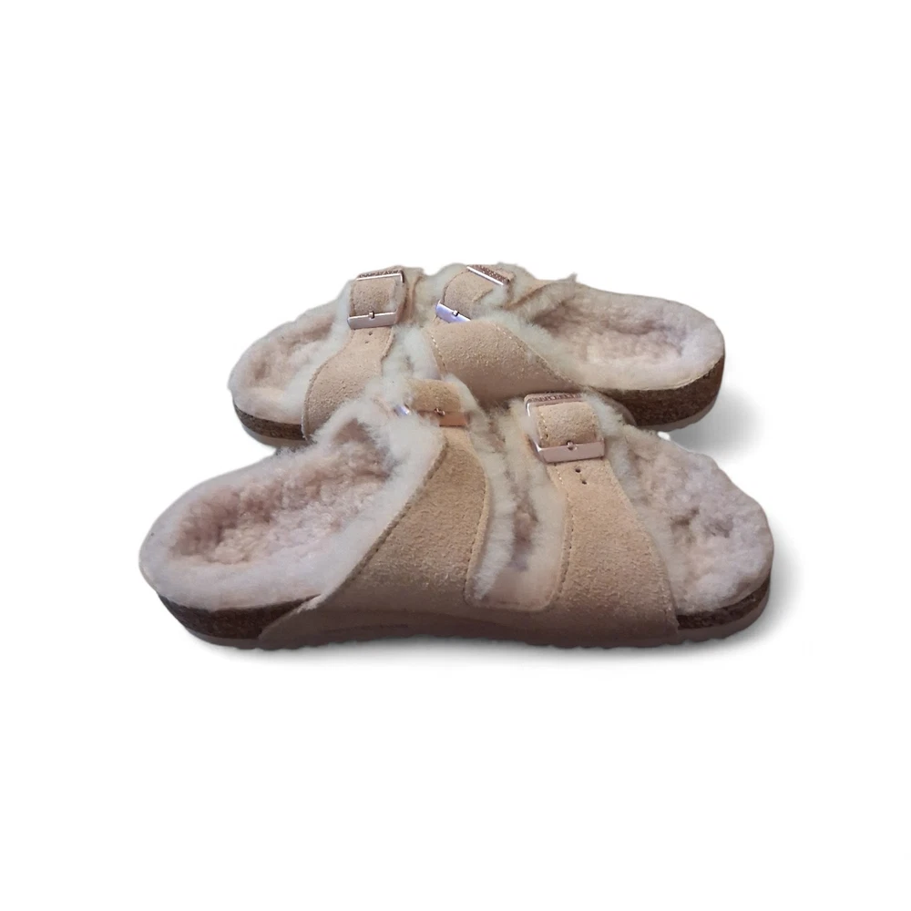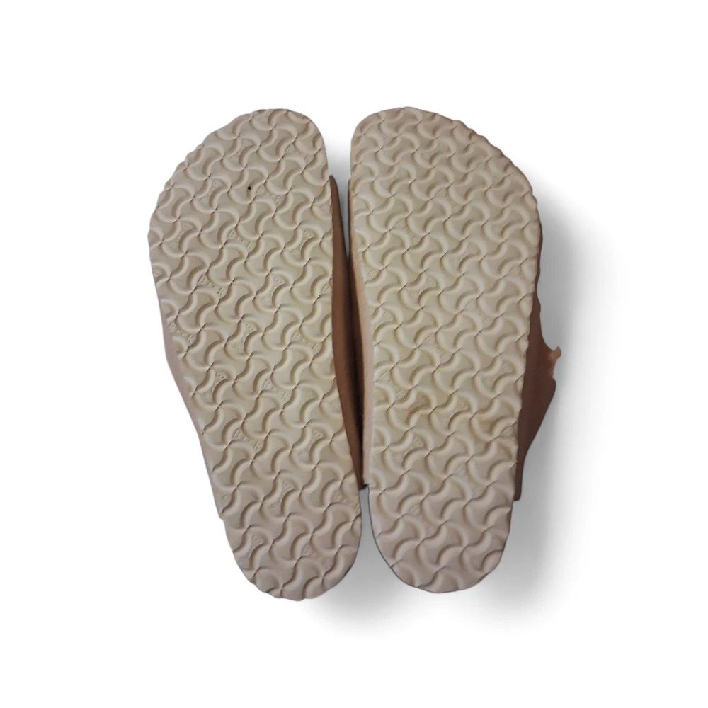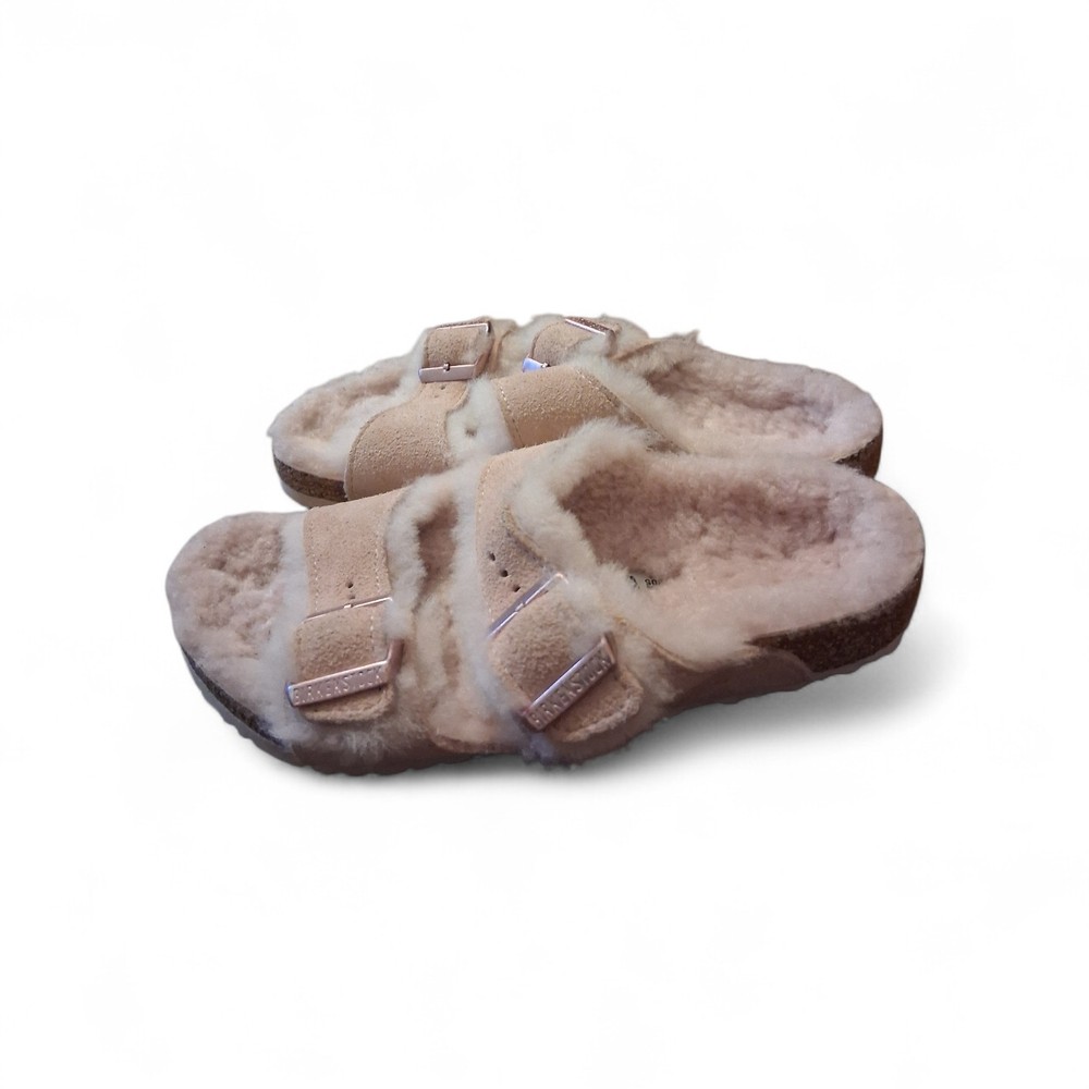 The product is a pair of Birkenstock Girls Youth Size 32 Arizona Shearling Suede Sandals in a lovely rose color. These sandals are designed for young girls, with a slip-on style and featuring a soft shearling fabric lining. The suede upper material provides durability and comfort, making them perfect for everyday wear. The sandals have a charming rose theme that adds a touch of sweetness to any outfit. Perfect for adding style and functionality to a little girl's wardrobe.