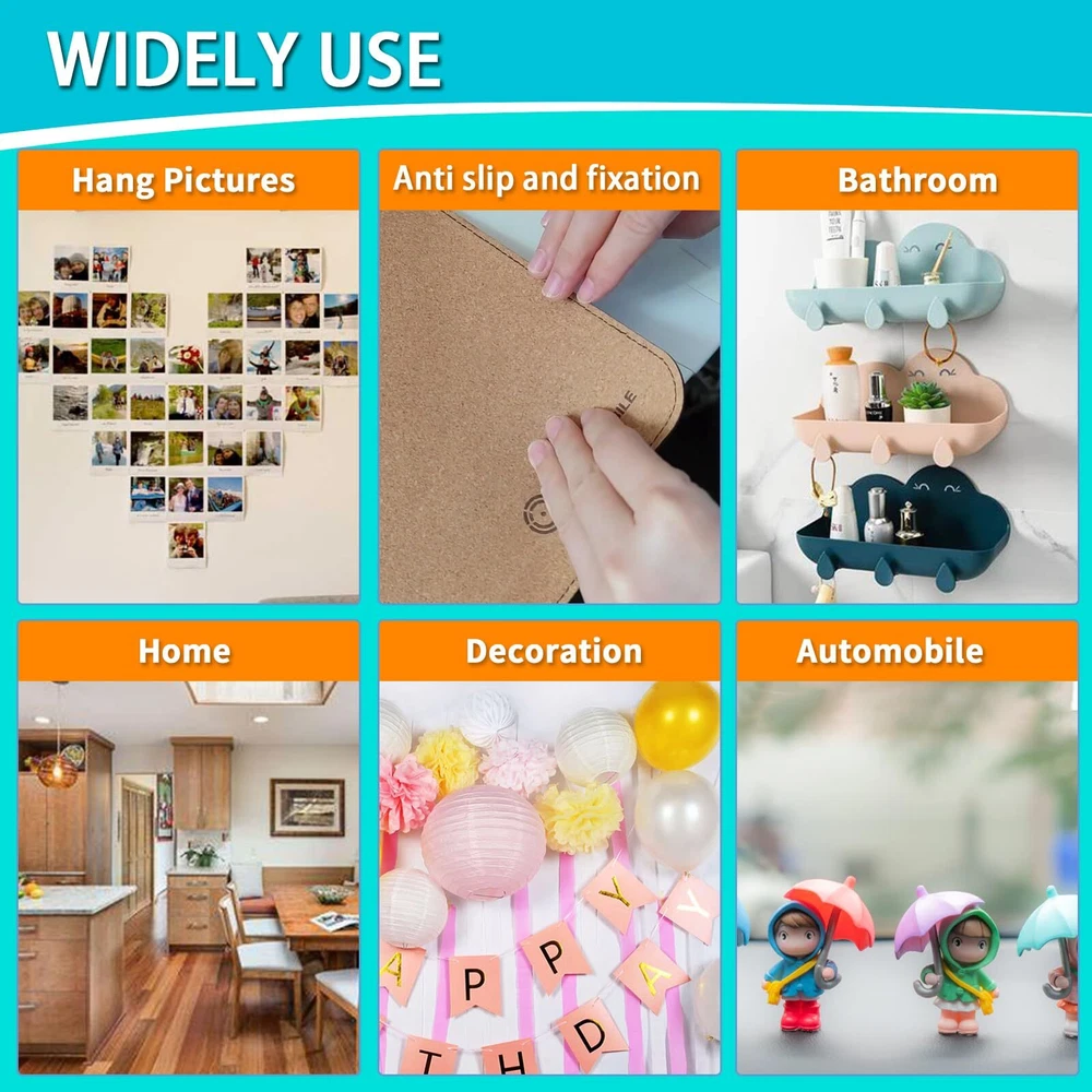 Strong adhesive acrylic double sided tape: This thin double-sided adhesive tape is very suitable for hanging and stick small and medium-sized objects because of its excess adhesive force. You can use multiple tape strips combinations to ensure that things do not fall off No residue: This adhesive mounting squares are suitable for smooth and flat surfaces such as plastic, glass, metal, fabric, wood, ceramic tiles. It should be noted that removing it may damage your painted wall, so careful consideration should be given when using it on painted walls For hanging stuffs, making crafts, party decoration: Multipurpose adhesive tape, you can use it to hang pictures, posters, balloons, socket; You can also stick art crafts, mirrors, and carpets. Tape for home, office, school, party, wedding, decoration and organization Removable, washable, reusablz: This transparent adhesive tape strip can be reused. You only need to rinse it with water, and then wait for it to dry to regain its stickiness There are 48 circles, 16 strips, and 32 squares, a total of 96 pieces. You can use multiple tape strips combinations to ensure that things do not fall off