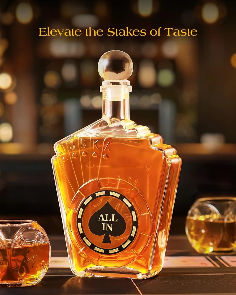 Birthday Gifts for Men Dad, Kollea Poker Whiskey Decanter Set for Men, Casino Style Liquor Decanter, Funny Christmas Gift Ideas for Him Boyfriend Brother, Liquor Dispenser for Bar, Anniversary, 27 oz Product Details Brand: Kollea Material: Glass Color: Clear Capacity: 800 Milliliters Special Feature: High Transparency, Poker-Themed Design, Airtight Brand: Kollea Material: Glass Color: Clear Capacity: 800 Milliliters Special Feature: High Transparency, Poker-Themed Design, Airtight Product Dimensions: 7.28"W x 11.2"H Included Components: 1 x 27.05 Oz Decanter, 1 x Airtight Glass Stopper, 1 x Exquisite Gift Box Model Name: WGS0311 With Lid: No Item Weight: 2.59 pounds Manufacturer: Kollea Country of Origin: China Item model number: WGS0311 Date First Available: September 3, 2024 Exquisite Design: This Texas Hold'em whiskey decanter set, inspired by a Royal Flush, is adorned with gold chip decals on the bottle. It's not just for savoring the rich and robust whiskey, but also offers a high degree of artistic appreciation Elegant and Luxurious Gift: With its poker motif and distinctive design, this decanter set is beautifully packaged, making it an ideal gift for men, him, father, brother, boyfriend, husband, and all whiskey or poker enthusiasts. It adds a touch of creativity and surprise for birthday, Wedding,Housewarmig, Anniversary, Christmas, and other special occasions Conversation Starter for Social Gatherings: At parties or dinners, this decanter set is sure to be a focal point for conversation and attention. It reflects the host's sophisticated taste and adds an element of fun and ceremony to the gathering, making game nights truly memorable Enhanced Drinking Experience: With a generous 27 Oz/800 ml capacity, this liquor decanter set is perfect for gatherings with friends, enhancing the pleasure of sharing fine whiskey and engaging in deep conversations. It also serves as an exquisite decoration for your home bar Superior Quality: Crafted from thick, transparent, lead-free glass, this decanter set ensures safety and excellent durability. Equipped with a silicone-sealed spherical stopper for optimal sealing, and padded with pearl cotton inside for secure and safe transportation
