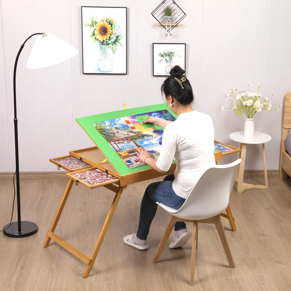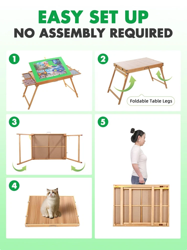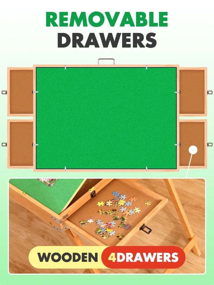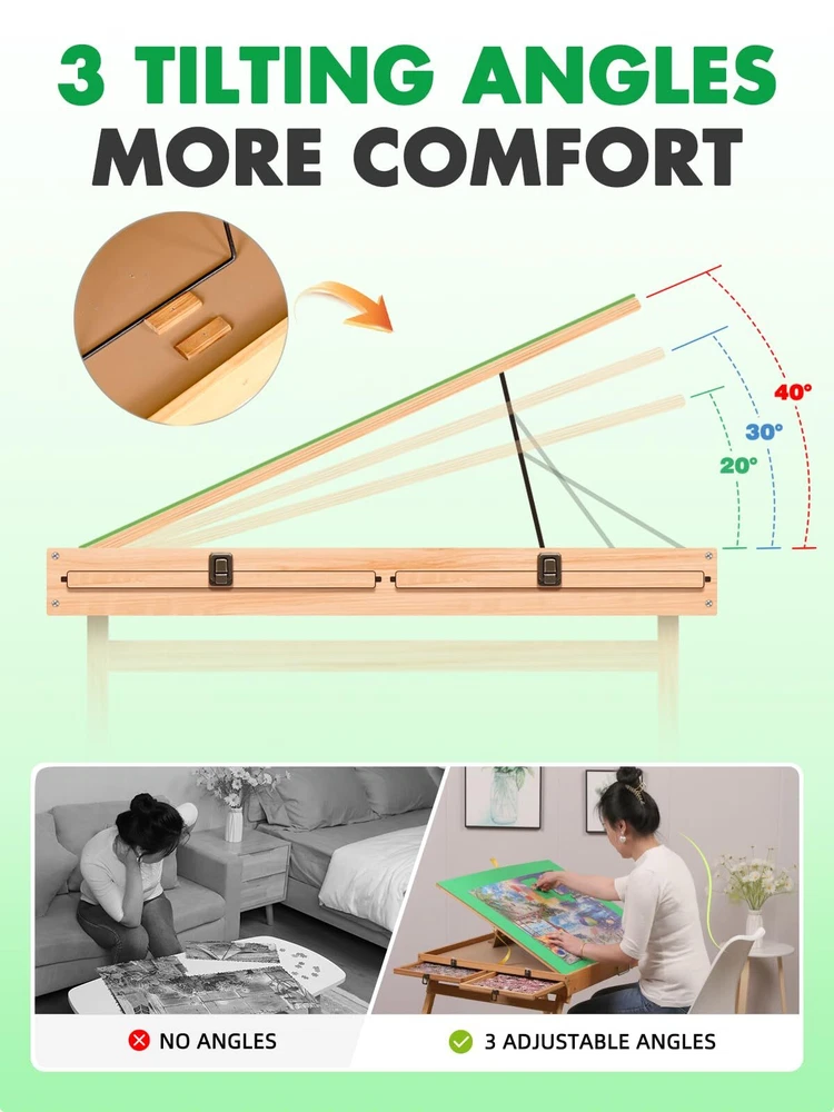 BittPicc Puzzle Table 1500 Pieces Puzzle Tables for Adults with Drawers 25"x34" Portable Jigsaw Puzzle Table Foldable Wooden Table with Legs & Cover for Mom Wife 【Large worktop that can hold 1500 pieces】-- The size of the working area of this wooden puzzle table is 34 inches × 25 inches, suitable for most 1500 pieces of puzzles. If you like to do large puzzles, this board will significantly improve the experience. The table top is covered with non-slip felt, which can ensure friction and effectively prevent the puzzle pieces from sliding or falling. 【3 Adjustable tilt table】-- In order to reduce back and neck pain during the puzzle process, our puzzle tables for adults are specially constructed according to ergonomics, so it can better provide a comfortable position for puzzle enthusiasts. Our puzzle board can be adjusted to 4 different angles from 0 ° to 40 ° (0, 15 °, 30 °, 40 °), which can be tilted or placed according to your usage. 【2 Foldable Legs without Assembly 】-- This puzzle table comes with 2 foldable legs which does not require assembly and can be opened and folded in a few seconds.The height when the leg is fully extended is 24.6",which makes the table has a certain height, you do not need to bend over for a long time to do the puzzle.When you're not using the table, the legs can be folded and placed under a bed or sofa. 【4 Removable Storage & Sorting Drawers】-- 4 Removable felt drawers allow you to sort your pieces by color, theme or border. Different colors offer you much convenience to classify your pieces.Every drawer is specially designed with a metal cilp in order to ensure all the drawers are stay closed when transportation, safely keep the pieces from missing. 【Multifunctional Smooth Wooden Cover】--We provide a removable wooden cover to keep your puzzle in place when you need to take a break ,which can protect the puzzle pieces against dust and naughty pets .The table covered the plate also can be used for many purposes such as a a coffee table,dining table or game table,So it's worth the money to have this table! Shipping We offer FREE shipping on all orders! We use a selection of shipping services such as UPS, FedEx, USPS etc. We only ship to the lower 48 states, no APO/FPO addresses or PO Boxes allowed. Local pickups and combined shipping options are not provided at this time. Return You can return a product for up to 30 days from the date you purchased it. Any product you return must be in the same condition you received it and in the original packaging. Please keep the receipt. Payment We accept payment by any of the following methods: PayPal Please pay as soon as possible after winning an auction, as that will allow us to post your item to you sooner! Feedback Customer satisfaction is very important to us. If you have any problem with your order, please contact us and we will do our best to make you satisfied. Contact Us If you have any queries, please contact us via ebay. We usually respond within 24 hours on weekdays. Please visit our eBay store to check out other items for sale! Thank you for shopping at our store.
