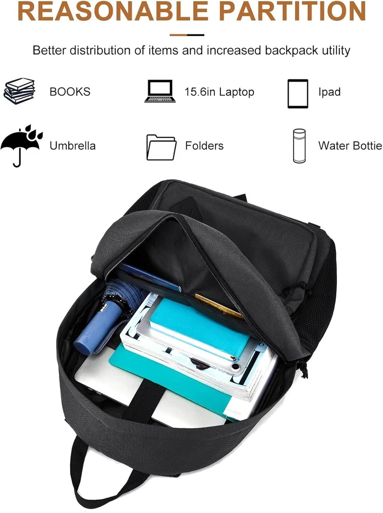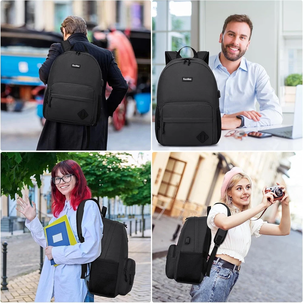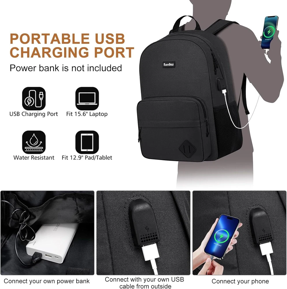 Black Backpack for School Teens Boys Girls, Lightweight 15.6 Inch, Product Details Material & Size: KUOSDAZ backpack is made of high quality water-resistant, tear resistance fabric provides a sturdy and chic exterior. The school bag SIZE is 17.3*12.2*5.5 inches, 30L. The outdoor daily knapsacks for teenage men women with double knot zippers ensures daily long-lasting use. Large Capacity Backpack with Laptop Compartment: The laptop backpack has 3 compartments and 2 side pockets -1 15.6-inch padded laptop compartment that can store A4 folders, books, clothes, and other school supplies or daily necessities. The front 2 pockets can hold pens, sunglasses, and other small items. 2 elastic side pockets can accommodate bottles of different sizes. School backpacks keeps everything organized. USB Port Design: Charging computer backpack with an external charging port & built-in charging cable, this laptop backpack with a USB charger port provides you a more convenient way to charge your electronic device via connecting your own power bank while walking or cycling. Practical present for students, friends, mothers, and fathers, etc. (POWER BANK is not included) Multi Functional Backpack: This backpack can be used as a casual bag or travel bag. The luggage strap on the back of the backpack can securely fasten the backpack to the luggage, simplifying travel. Meet all basic daily needs for university, work, travel, hiking, and business trips. Various Occasions: This school backpack can also give the backpack as a gift to teacher, students, exquisite and practical. A great choice for office work backpack, travel backpack for men women, daily use basic backpack, teachers backpack, school supplies, students backpack for boys and girls all indoor and outdoor activities. Age:over 3 years old