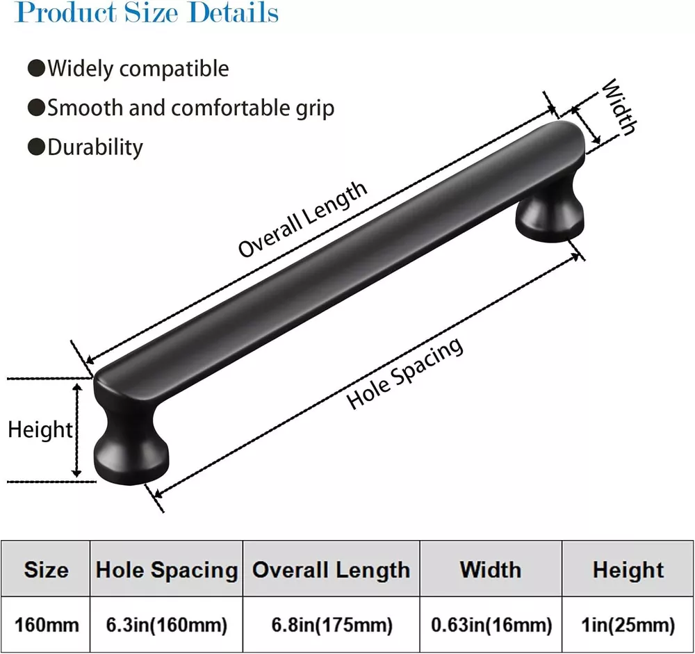 Product Description Black Cabinet Handles 10 Pack 6.3 Inch (160Mm) Hole Spacing Black Kitchen Cabinet Handles,Black Drawer Pulls And Matte Black Cabinet Pulls Material : The Black Cabinet Hardware Are Made By Solid Zinc Alloy ,They Are Durable And To Be Long Lasting. Heavy-Duty : The Handles For Cabinets And Drawers Are Built To Last With Heavy-Duty Construction, Designed For Durability And Strength. Comfortable Grip : The Black Drawer Handles Provide A Supremely Comfortable Grip, Ergonomically Designed To Fit Naturally In Your Hand For Easy And Effortless Use. Versatile Application : Widely Compatible With The Kitchen Cabinets Handles, Bathroom Cabinet Handles And Drawer Pulls. Easy Installation : Only Need One Screw Driver With Attached Screws For Matte Black Cabinet Handles . About Us We are a reputable seller with many years of experience selling on eBay. Our goal is to provide high-quality products and excellent customer service. Shipping Items will be shipped within 1-3 business days when we received payment. (Orders are not processed on weekends & holidays) Tracking information will be sent once item is shipped. Delivery time depends on destination and other factors Item is shipped to ebay address. Leaving correct address can minimize delay. For international shipping and shipping to Guam, Hawaii and Alaska, Please contact us before placing the order. International buyers please note: Import duties, taxes and charges are not included in the item price or shipping charges. These charges are buyer’s responsibility. We will try our best to reduce the risk of the custom duties. Local pick-up is unavailable at the moment. Contact Us We reply any email messages within 1 business / working days(off-duty at weekend). If you do not get a response from us, then please check your junk or spam mailbox. Our Business hours: Mon-Fri 9:00-18:00, UTC/GMT +8 hours. Please contact us either by clicking "contact seller" in the "purchase history" section or simply click "ask a question" at the bottom of this page. If you are unsatisfied with our item or service, please contact us before leaving any feedback. We are committed to resolve all issues in a friendly and satisfactory manner.