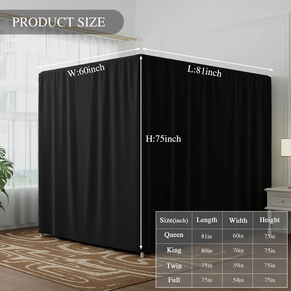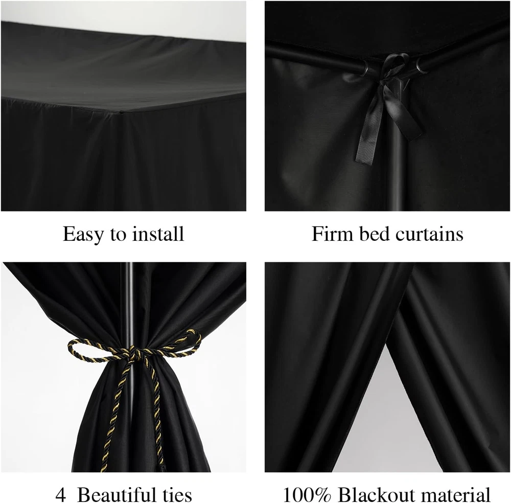 【Lightproof Bed Curtains】Our canopy bed curtains block out strong sunlight and helps protect your from bright lights,provide you with a completely dark and quality sleeping space.For those who are sensitive to light and like to take naps,you can enjoy a dark and cosy sleep even on sunny days. 【General Size】Queen canopy bed curtains measure at:60"W x 81"L x 75"H/(152x203x190cm).These canopy bed curtains can suitable for most queen-sized beds.(Does not Include frame/post/poles). 【Breathable】Black canopy bed burtains are made of 100% Premium Polyester,which is breathable and soft to the touch.Even in hot summer ,you won't feel stuffy when the bed curtains are closed.This bed curtains are suitable for all seasons,allow you to fully rest and enjoy private bedroom time. 【Unique Design】One-piece bed curtains design makes your room more elegant,classical 4 openings design makes your bed full of romantic atmosphere.Once hanging set up,this canopy bed curtain would creat a warm,soft and cozy bedroom feeling.Besides,canopy bed curtains can provide all-round protection atmosphere that gives you a sense of security. 【Easy Installation】The package Include: 1 canopy bed curtains + 4 tying ropes accessories.Our bed canopy bed curtains are easy to install,just hang the bed curtain on the four-poster frame.They could be installed easily even for fixed 4 post bed frames,no need to disassemble your bed frame. Product Description The video showcases the product in use. The video guides you through product setup. The video compares multiple products. The video shows the product being unpacked.
