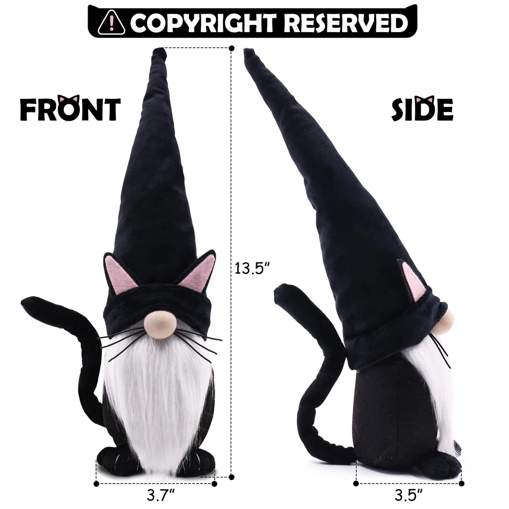 Product Features: This Halloween cat gnome is so soft, kind, cute, that will definitely enchant your holiday. Farmhouse Gnome Ornament - These gnomes measure 13.5 inches high from bottom to top and 3.7 inches wide, not too big or too small, each of these gnomes will be a wonderful decoration of the farmhouse space. Exquisite Craftsmanship and Premium Material - The hat of gnome is made of soft flannel and non-toxic polyester fiber. The white beards are made of light faux fur, which touches the ground. The knitted paw and wooden nose are so cute. A small bit of sand is sewn into the base to keep him weighed down and upright. Buy without worries, you can Purchase Risk-Free! Our highest priority is YOUR satisfaction. If for any reason you aren't thrilled with your new cat gnomes, we’ll give you a full refund!! COPYRIGHT RESERVED - This black cat gnomes is a special addition to any home, decor, or season. It can also be presented to a cat lover. This gnomes will gladly settle on your table, desk, fireplace, bookshelf, tiered tray and bring a Halloween winter festive mood. SUITABLE SIZE - This cute gnomes stands 13.5 inches tall by 3.7 inches wide. The perfect size for a nice Halloween table decor or a gift for the kiddo, and they are very nice to hold in your hands. You will receive 1 cat gnomes, which will make a wonderful gift to give. PREMIUM QUALITY - These gnomes are soft and pleasant to the touch. This handmade cat gnomes is made of a wooden nose, plush and felt, soft, non-toxic, and sewn neatly. The long beard is made of light faux fur. This adorable tomte gnomes cap includes a wire, and you can bend it in any way you like. ADORABLE DESIGN – The gnomes features long plush white beards and has a long black tail and paws, as befits a cat. The black cap is adorned with cute cat ears! This cat gnomes is perfect for gifting or to add to your Halloween winter decor! QUALITY-SERVICE - Refund service. If you have any questions about products, please feel free to contact us.
