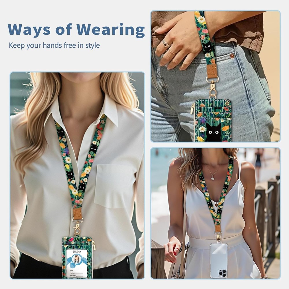 Lanyard Wallet with Id Badge Holder, Black Cat RFID Small Keychain Wallet Women Wristlet, Cute Zipper Credit Card Holder Phone Wrist Neck Strap for Key Name Tag, Teacher Student Office Gifts Lanyard Wallet with Id Badge Holder, Black Cat RFID Small Keychain Wallet Women Wristlet, Cute Zipper Credit Card Holder Phone Wrist Neck Strap for Key Name Tag, Teacher Student Office Gifts FREE AND FAST SHIPPING! About this item Unique Original Design: The 2-in-1 wallet lanyards for id badges feature a unique floral black cat design, letting you showcase your style while keeping your essentials secure, great for adding a playful yet practical touch to your everyday look. Package Included: neck lanyard x1, wrist lanyard x1, zipper id holder wallet x1, key-ring x2, phone tether tab x1 Slim Organizer Wallet: This compact card holder wallet measures just 4.72"×3.15"×0.3", fitting easily in pockets or purses for on-the-go convenience. The small credit card holder features 4 card slots, 1 clear ID window and 1 zippered coin pocket - suitable for organizing credit cards, cash, coins, IDs (including driver's licenses), and other daily essentials Multifunctional Lanyard: This versatile lanyard with id holder provides two convenient wearing styles - choose between the 21.5" neck strap or 9" wrist strap to suit different occasions. You can freely switch between these options according to your needs, whether for work, school, travel or daily activities. This id card holder with lanyard also comes with a cell phone tab and key-ring to keep your belongings safe, including cards, wallet, keys, cell phone and other everyday items RFID Blocking: This slim card holder is made with premium PU leather and tight stitching for tear resistance, featuring built-in RFID protection to safeguard your cards from both physical and digital threats. The badge lanyard is crafted from soft, skin-friendly polyester that's both lightweight and hard-wearing, ensuring comfortable all-day wear Amazing Gift: The id lanyard badge holder for women is excellent for teachers, students, drivers, office workers, nurses, doctors for daily use. Our badge wallet also make great gifts for daughters, mothers, wives, friends, on special days such as birthdays, Valentine's Day, Mother's Day, Christmas, Thanksgiving, or Teacher's Day Product We offer a 30-Day Return Policy on items which you are not completely satisfied with. You have the option for a full-refund or an exchange of the item. No returns are available on items shipped outside of the US . Shipping We offer Free Shipping to the US and ship within 2 business days of payment, usually sooner. We use UPS express shipping. That's why your products are usually delivered within 3 days . Contact We try our very best to make sure every customer is completely satisfied. If there's a problem , message us! We're happy to help. 24/7 live chat available.