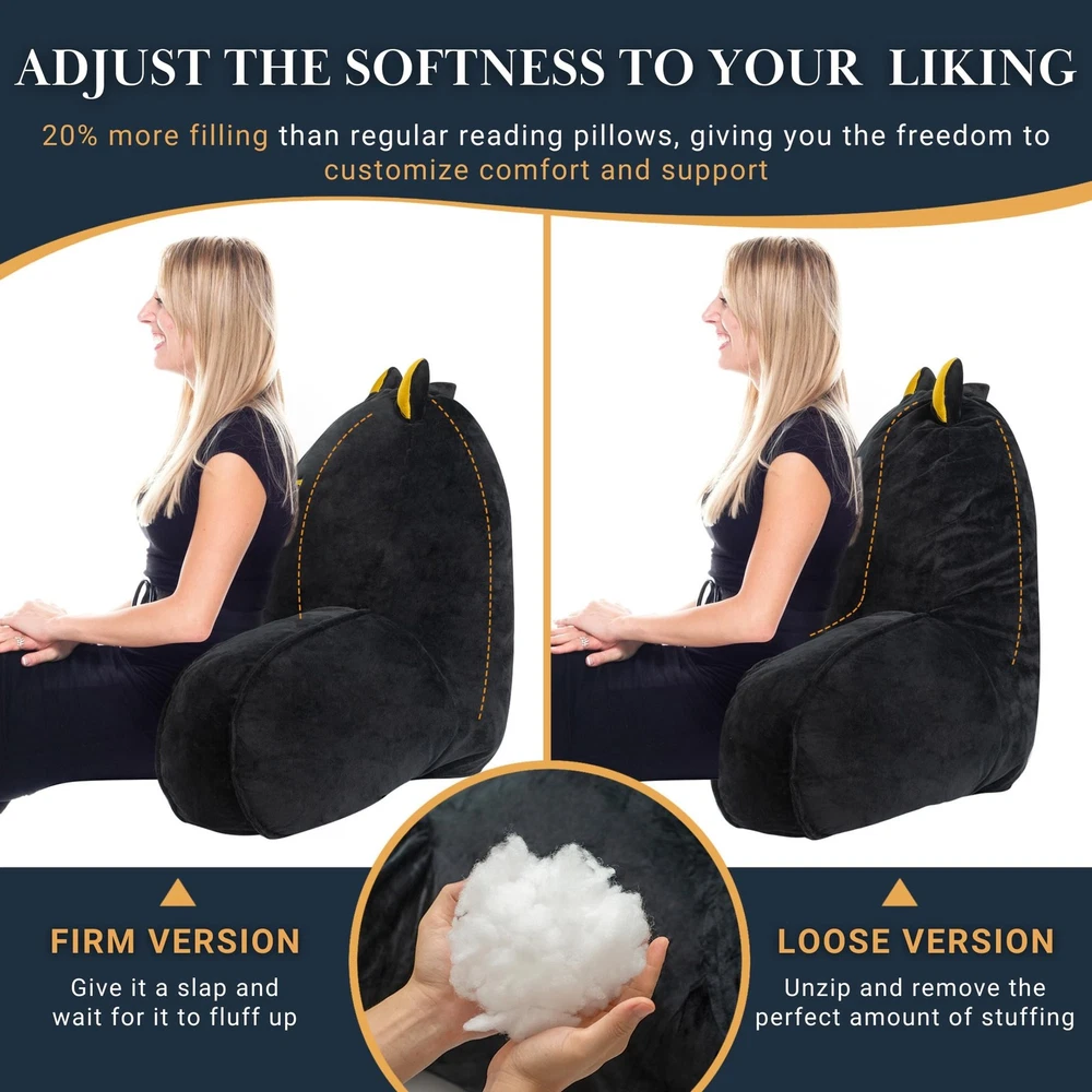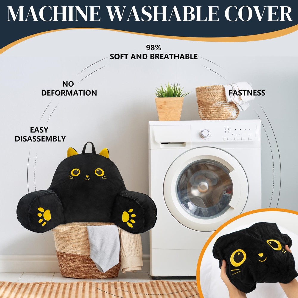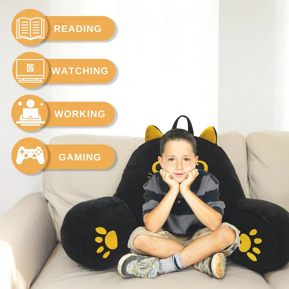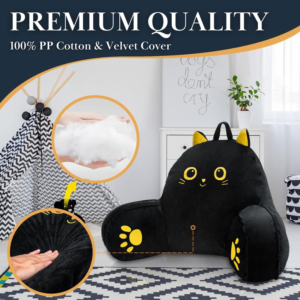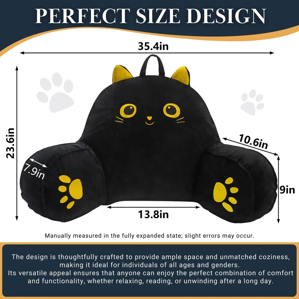 Adorable & Cozy Black Cat Reading Pillow: Crafted with smooth velvet fabric and filled with 100% PP cotton. Dimensions: Length 35 inches * Height 21 inches Weight: 3.55 pounds Suitable For: Perfect for adults, men, women, teenagers. Versatile Usage: Ideal for use on the bed, sofa, floor, or balcony. Great for leisure and home office settings. Features: 1. Equipped with supportive arms, convenient pockets, and easy-carry handles. 2. Removable cover with a zipper for effortless cleaning. 3. Adjustable design to customize support and softness by adding or removing foam. 4. Offers excellent support and ultimate comfort. All-in-One Reading Pillow for Kids, Teens, and Adults: This adorable Black Cat Reading Pillow by QCat is designed to bring both comfort and cuteness to your reading time. Perfect for children, teenagers, and adults alike, it offers full-body back support while sitting up in bed, on the floor, or on the couch. Whether you’re reading your favorite book, watching Netflix, gaming, or studying, this cozy backrest pillow keeps you upright and relaxed for hours. Ergonomic Back Support with Plush Armrests: Unlike ordinary pillows, this reading backrest pillow features generously filled armrests and a supportive, high-rise backrest that hugs your body, offering ergonomic support for your lower back, shoulders, and arms. It helps reduce back and neck strain, making it the perfect back pillow for sitting up in bed or lounging around the house in comfort. Super Cute Cat Design That Brightens Any Room: Shaped like a chubby cat with embroidered yellow eyes, whiskers, ears, and paws, this whimsical back pillow adds a touch of fun to any bedroom, dorm, or kids' reading nook. The black and yellow contrast is eye-catching, stylish, and ideal for cat lovers of all ages looking to express their personality through their decor. Soft, Hypoallergenic Fabric for Sensitive Skin: Made with a hypoallergenic, ultra-soft plush fabric cover, this pillow is ideal for individuals with sensitive skin or allergies. The gentle texture feels soothing against the skin, offering comfort for daily use in every season. It's safe and cozy enough for kids and teens to snuggle up with during homework or bedtime reading. Removable, Machine-Washable Cover for Easy Cleaning: The reading pillow comes with a durable, removable cover that’s machine-washable for convenient maintenance. Simply unzip the cover and throw it in the wash to keep your pillow clean and hygienic—perfect for families, dorm life, or anyone who enjoys snacks in bed. Lightweight & Portable with Carrying Handle: Built-in handle makes it easy to carry this lightweight backrest pillow from room to room. Move it from your bed to the couch, or even pack it in the car for road trips or sleepovers. It's the perfect travel-friendly reading accessory for on-the-go comfort. Makes a Unique Gift for Cat Lovers and Bookworms: Looking for a unique, thoughtful gift for a birthday, holiday, or back-to-school season? This cute and comfy cat pillow makes an unforgettable present for cat lovers, readers, college students, or anyone who loves cozying up in style. Durable PP Cotton Filling for Long-Term Support: Stuffed with premium PP Coto, this reading pillow offers the perfect blend of softness and firm support. The filling conforms to your body for personalized comfort and bounces back into shape after each use, ensuring long-lasting durability.