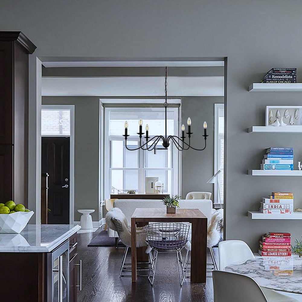 matte Black Finish 6-light can accommodate either Requires 6 E12 LED candle light (not included). This chandelier is compatible with LED bulbs. Safe packaging and easy installation.Durable/Extra Long Life/High Strength Forged Metal This chandelier is a gorgeous ceiling light. With high-quality materials and black paint finishes, the quality of vintage / country style pendant lamps is guaranteed. This country house's old industrial country chandeliers come from the Volkswagen series and are perfectly designed to illuminate your space, whether it's for a kitchen island, restaurant, step room, grower or anywhere else!