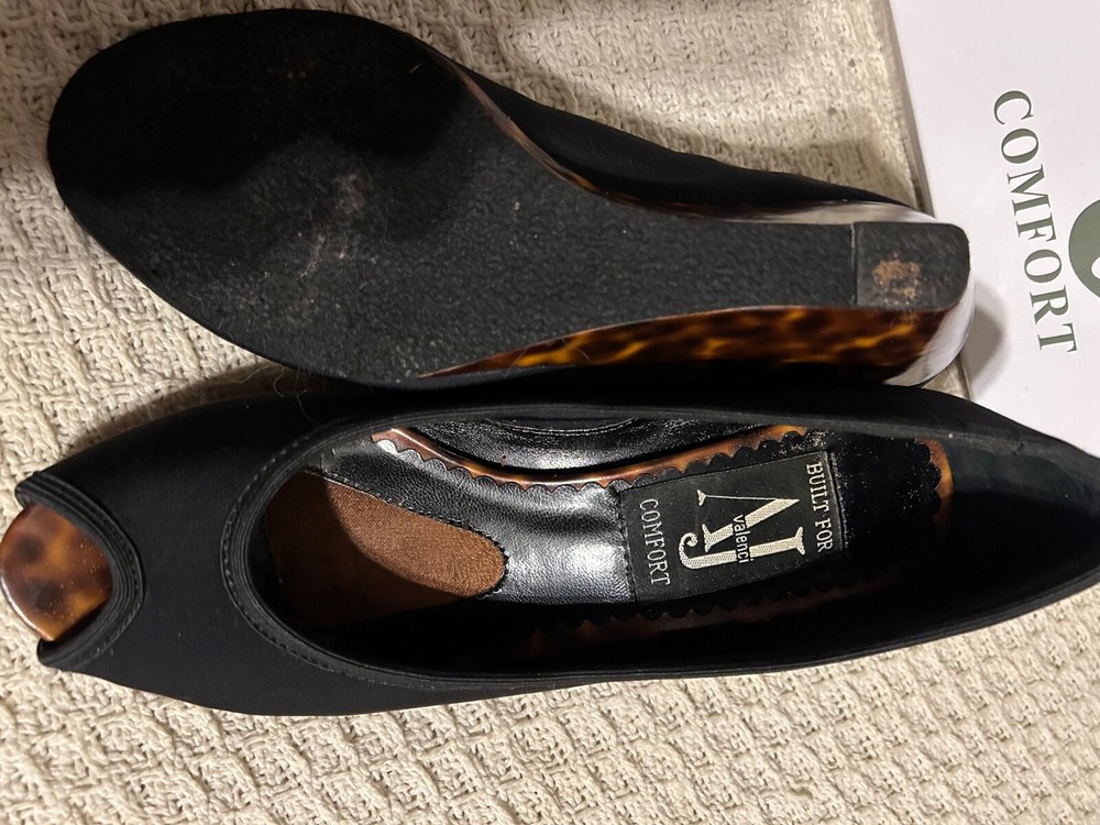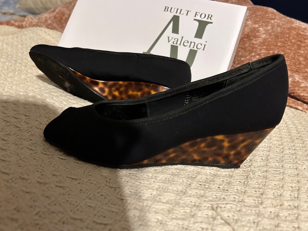 Step out in style with the A J Valincia black wedge heels, featuring an eye-catching cheetah print on the wedges themselves. These chic pumps are a versatile addition to any wardrobe, perfect for both office attire and evening wear.Crafted with a synthetic upper and designed with a comfortable wedge heel style, these size 6 shoes are a blend of fashion and function. The bold pattern and classic black color ensure these heels will become a go-to choice for those looking to make a statement with their footwear.