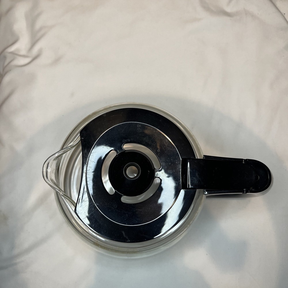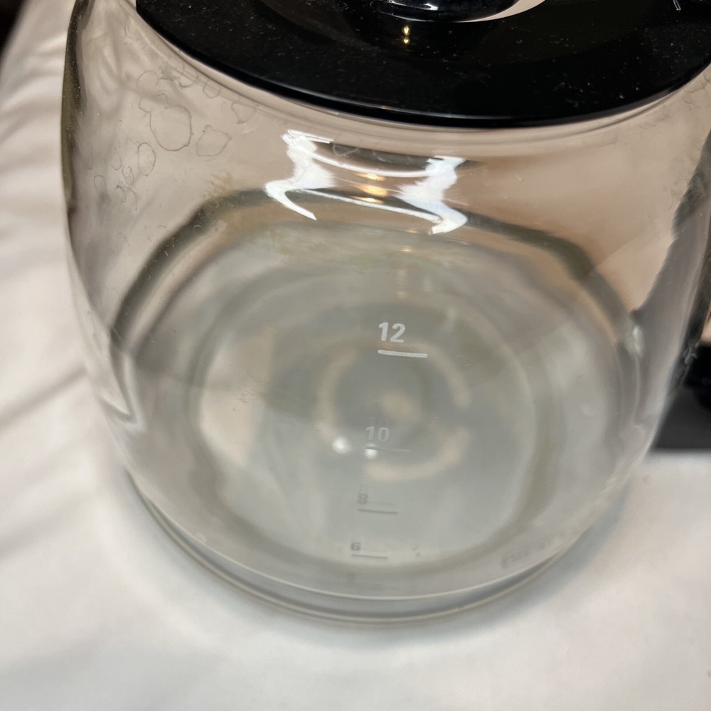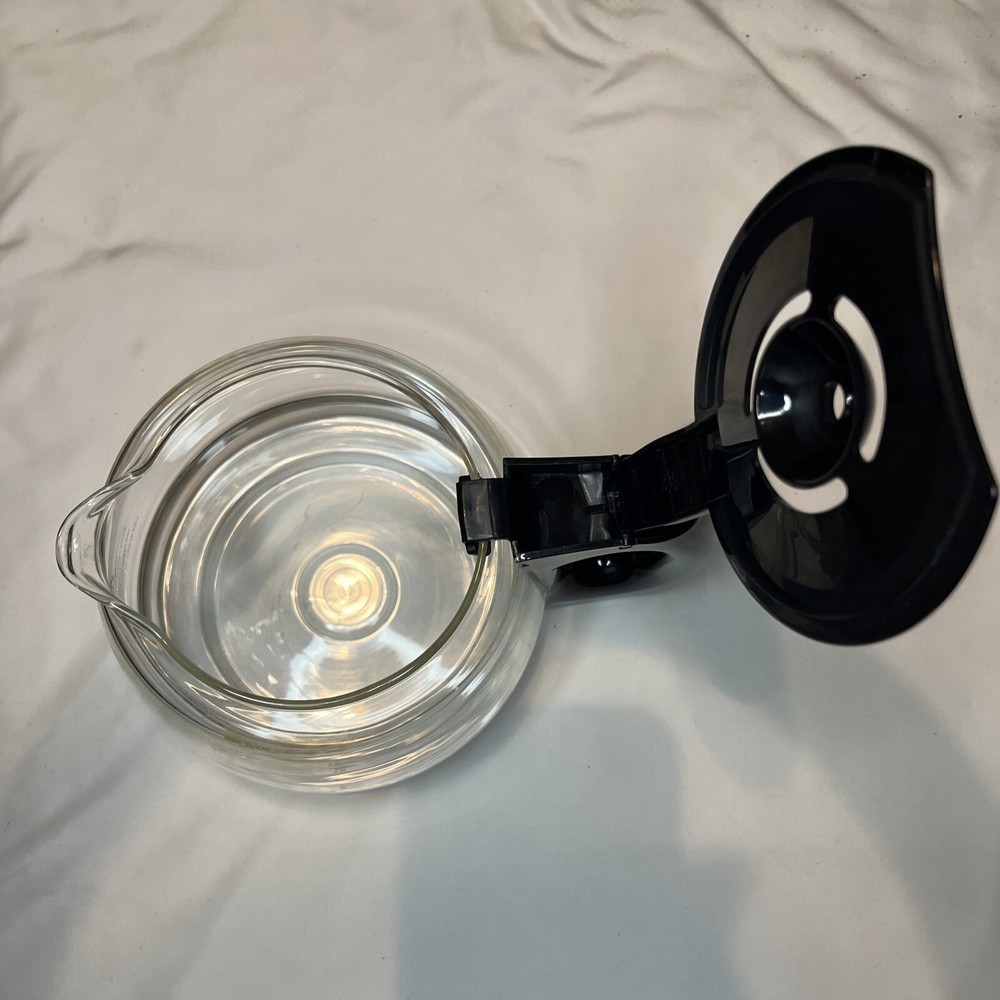 slightly used pre-owned replacement carafe or decanter fits Black and Decker automatic drip brewed coffee maker used only 6 times when the machine failed. Glass container Black plastic handle and flip lid metal retainer ring around bottom handle attachment This is a relatively clean coffee carafe as seen in pictures great replacement item for your machine
