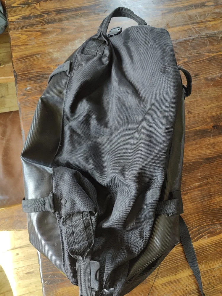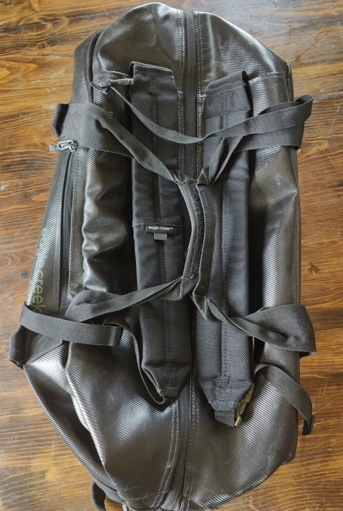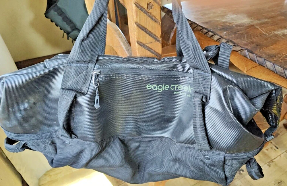 Features of Eagle Creek Migrate 40L Duffel Bag 100% Recycled Materials Full-access, wide-mouth opening Folds flat for compact storage 100% Recycled 900D Poly TPU main body fabric provides extreme abrasion and water-resistance while reducing your carbon footprint Tote and haul handles are connected using yoked webbing system for maximum load bearing Backpack straps tuck away for easy duffel carry or if checked as luggage #10 lockable main zipper with large finger loop zipper pulls for easy access Front zippered pocket for quick access essentials *******This is preowned and does show wear. Please carefully review all photos to ensure condition is acceptable. The bottom has several small wear holes and there is a white residue that does not wash off on several parts of the bag. One of the holes on the bottom of the bag does go all the way through.