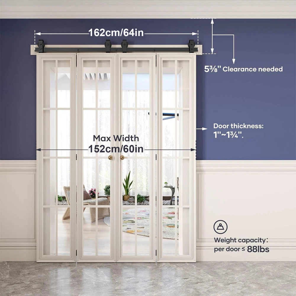 Black Folding Sliding Barn Door Guide Rail Set Carbon Steel Hardware Track Kit Color: Black Material: Carbon steel Track size: 64 inches (162CM) Track splicing method: 4 Scope of application: door thickness 0.5-50MM 4x FT orbit 4x roller 4x roller rotating bracket 2x roller holder 6x hinge 2x ground guide fastener 2x seal strip 1x screw bag 1x Specification 5x tube clamp 35mm 5xm8*90 wood teeth screws We only accept Paypal . Payment is expected within 2 days from the end of the auction. We send all the items are based on your paypal address. Therefore, please make sure your paypal address is valid. * International Buyers Please Note: Import duties, taxes and charges are not included in the item price or shipping charges. These charges are the buyer’s responsibility. Please check your country’s custom office to determine whether these additional costs will be prior to bidding / buying. We only ship this item to United State! We ship to your eBay address. Each package will be shipped to USA by UPS or Fedex with tracking number. Please check your shipping address carefully before checkout, it can't be changed if order completed. Ship within 1-2 business day once payment completed. Orders placed on weekend will be shipped within 3 days. Seriously promise: Refund or resend will be offered if item still not arrive in 7-10 business days. Just send us an email ,we will give you a satisfied solution as soon as possible. We maintain high standards of excellence FIVE STAR and strive for 100% customer satisfaction! Positive Feedback is very important to us. We hope that you contact us immediately BEFORE you give us neutral or negative feedback, so that we can satisfactorily address your concerns. We promise to offer the lowest price and high quality produce. Our working time: From Monday to Friday(9:00 am to 18:00pm), we do not work on holidays in China,hope you can understand and know that , thank you. Please always talk to us via ebay Message. We appreciate your business and look forward to growing our e-Bay sales with satisfied customers. If you dissatisfied for any reason, Please don't leave negative or neutral feedback at once. We work hard to make sure EVERY CUSTOMER 100% SATISFIED and resolve any problem for you and always leave positive feedback for all our customers. If you are satisfied with the product you received ,please leave us positive feedback and 5 scores DSR. Dear buyers,Welcome to our store!Your satisfaction is our top goal,we appreciate your business. If you have any questions, please feel free to contact with us by ebay Message during our business hours ( 9:30a.m. to 5:30 p.m.), or email us through eBay, we will try our best to help you to resolve it. If you are satisfied with our service, please rate the details of the transaction (Detailed Seller Ratings) on eBay and We will do the same for you. If you are not satisfied with the product or service ,please contact us before leave negative or natural feedback, we will try our best to solve the issue to your satisfaction, thanks. For any presale or after-sale questions,please do feel free to email us! Due to the time difference, each email will be replied within 1 working day,and weekend will be delayed a bitThanks for your patronizing!