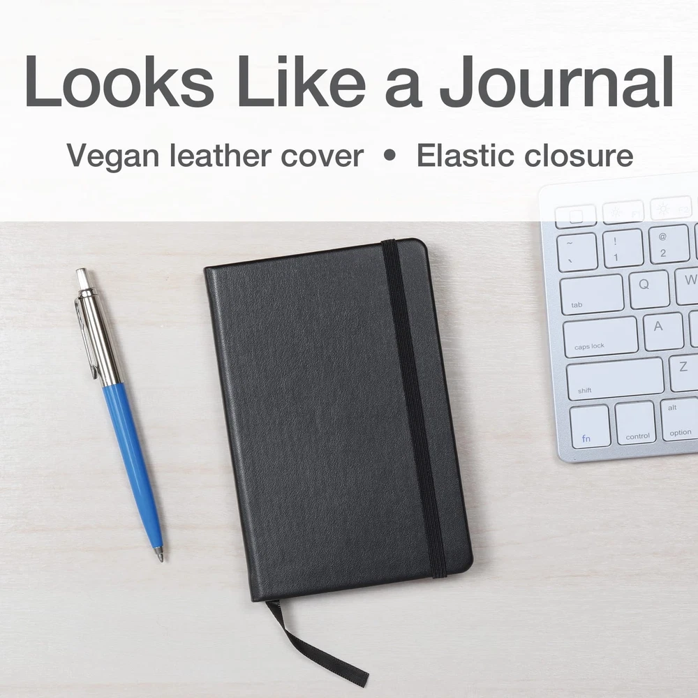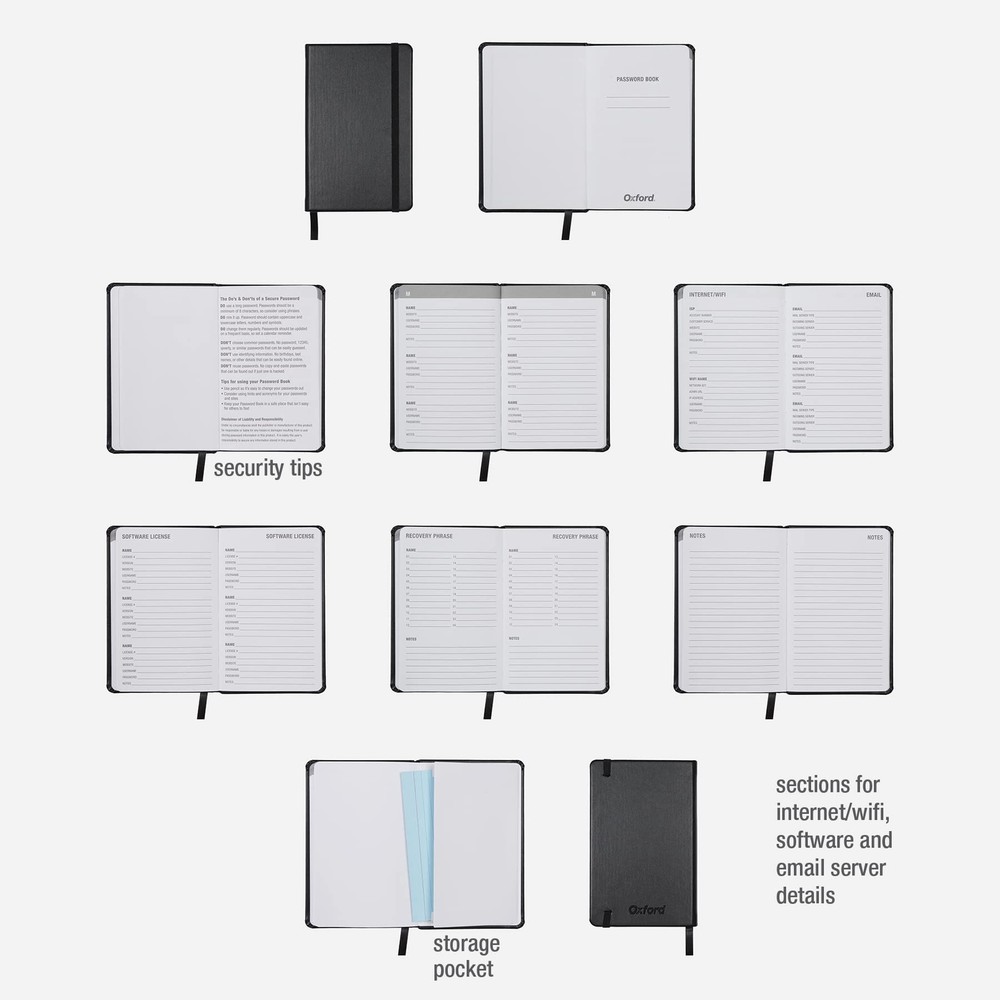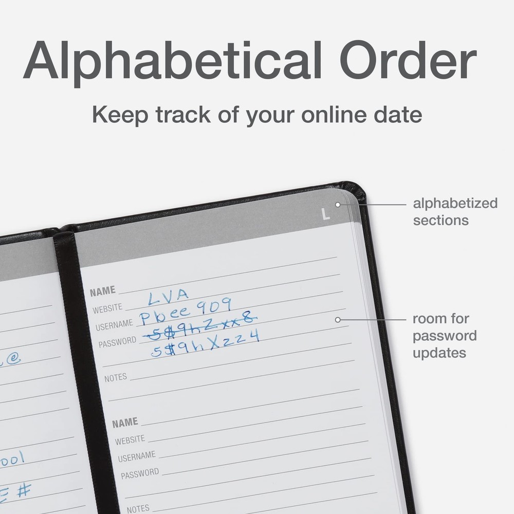The Password Book is a small, discreet size (3-1/2 x 5-1/2 inches), so you can leave in a locked drawer at home or put in your bag, purse or pocket. The small size still allows for lots of entries (128 pages with 342 entries). This handy password tracker will organize your login details for hundreds of websites and is in alphabetical order for easy wayfinding. Each page gives you room to write in a website, username, and multiple passwords, accounting for updated passwords. It also has space for other online data like internet/wifi (2 pages), email details (2 pages), software licenses (4 pages), recovery phrases/seed phrases for access to your crypto currency wallet (5 pages) and general notes (5 pages). This password journal looks just like a typical journal with a black vegan leather cover, elastic band closure, and bookmarking ribbon. It has premium white 120 gsm paper and a storage pocket in the back for odds and ends. Inside you'll find a helpful list of do's and don'ts for choosing strong passwords and other ways to keep your personal information safe, like using acronyms and hints and writing in pencil so you can update your passwords often. The Password Book is compact enough to take on the go if needed (3.5" x 5.5"), but it still has plenty of room for your online information: 128 pages with 342 entry spaces This password keeper has 114 pages for usernames and passwords in alphabetical order; plus organize other important online data like internet/wifi, email details, software licenses, recovery phrases A discreet way to keep track of all your online data: the plain black vegan leather cover makes this password journal look just like a regular journal; an elastic band keeps it closed Features all the details of a quality journal: white 120 gsm paper, a bookmarking ribbon to keep your place, and a storage pocket in the back for any loose papers or cards Includes tips for choosing and refreshing strong passwords and ways to keep your personal information safe, like using acronyms and hints and writing in pencil so you can update your passwords often