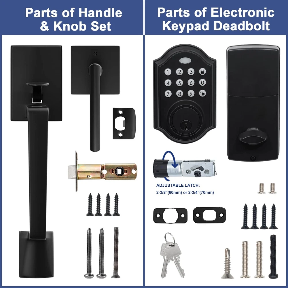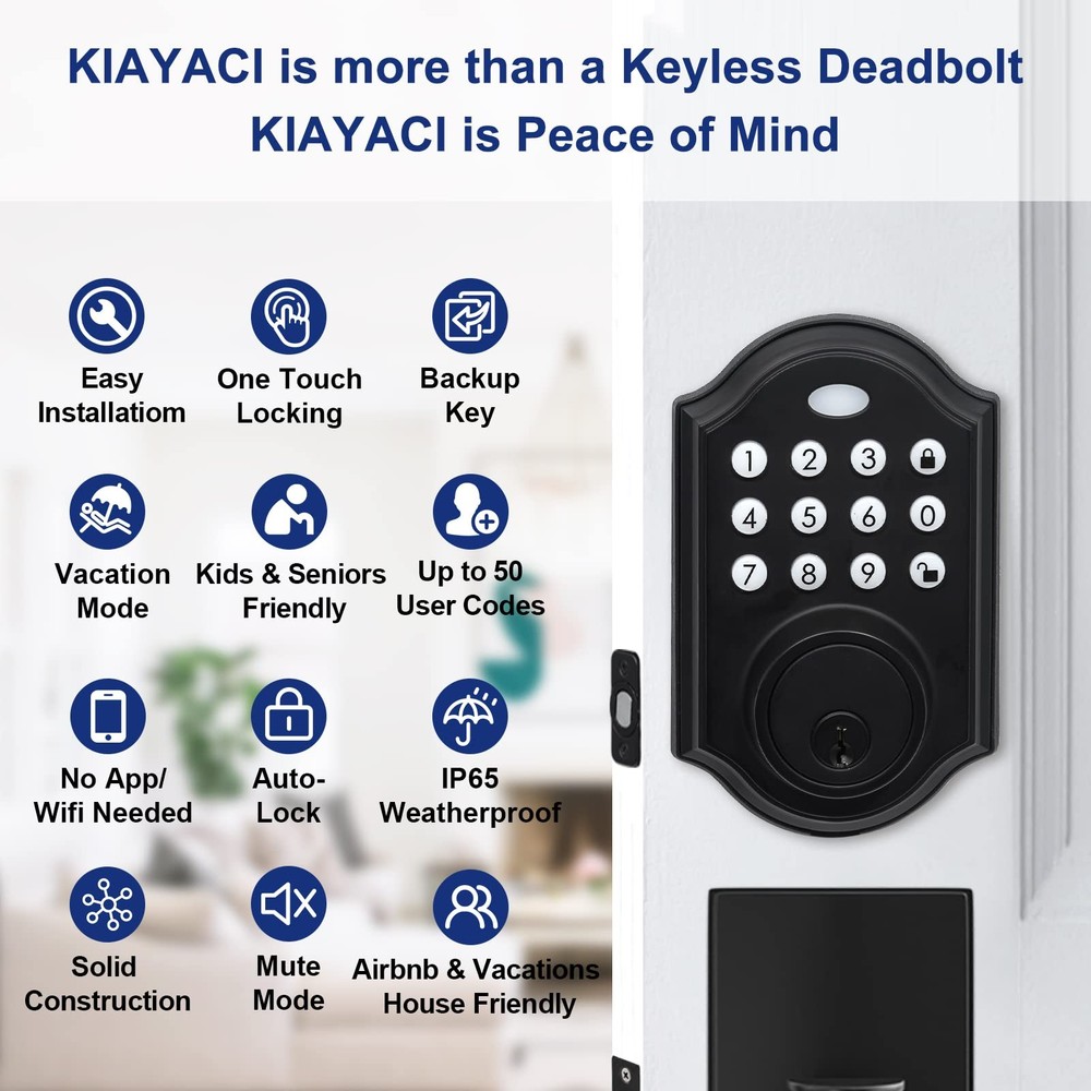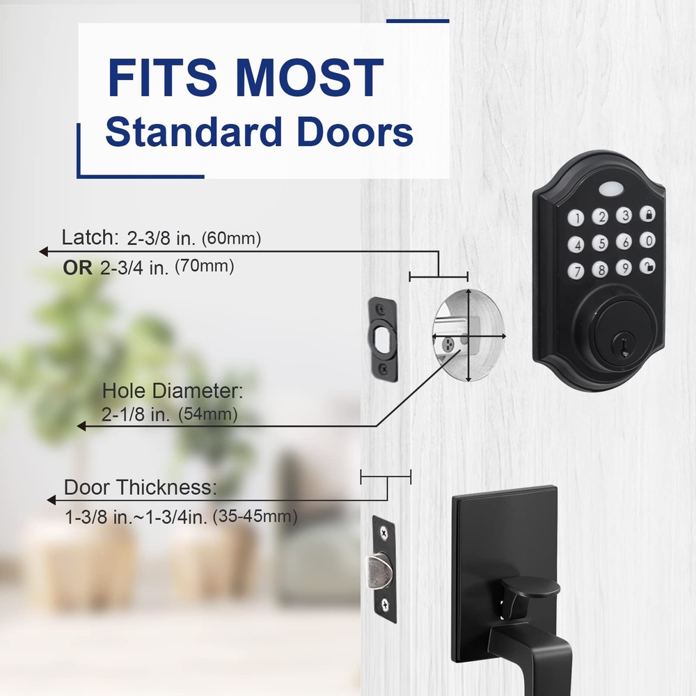 đȘăKeyless Freedom - Free Your HandsăOnly need to enter the set 4-8 password on the keyboard, you can easily unlock the door. There is no need to rummage for keys when you have clutter in your hand, and get rid of the dilemma of being trapped outside the door because you forgot your keys. đȘăOver 50 CodesăYou can set more than 50 codes. When your relatives and friends come to stay for a few days, you can set a special door code for them. You can delete the code after they leave without changing the code all the time. Safe and efficient. đȘăUnique Holiday ModeăThe door latch can be in holiday mode. In this mode, the consumption will be minimized and the battery life will be longer to ensure that you can still open the lock when you come back from vacation. đȘăSound ModesăElectronic Keyless Entry Door Lock has sound modes, you can choose to turn the sound on. If you don't like the beep sound, you can turn off the sound and there will be no sound. And it still works fine in cold weather. đȘăMatch all Kinds of Handles and KnobsăYou could change only the deadbolt on your door, you don't have to change the handle or lever, it will match a lot of handles and knobs. Also has excellent safety, Alloy construction, IP65 weather resistant, durable, safe and reliable to keep you and your family safe.
