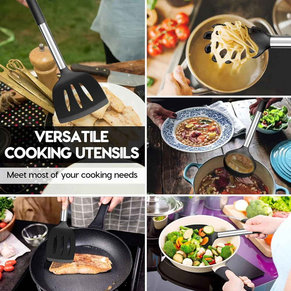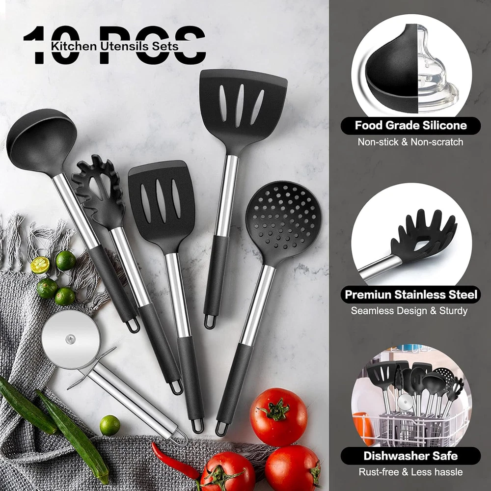 Store New Arrivals Add to Favorite View Feedback Contact Black Kitchen Utensils Set of 10, Heat-Resistant Silicone Cooking Utensil with Stainless Steel Handle, Include Turner,Spatula,Spoon,Tong,Pizza Cutter, Non-Toxic & Non-Stick, Dishwasher Safe Description Item Package Quantity 10 Color Black Material Stainless Steel, Silicone Material Type Stainless Steel, Silicone Is Dishwasher Safe Yes Shape Rectangular Recommended Uses For Product Cooking, Sautéing, Stirring, Scraping Is the item dishwasher safe? Yes Handle Material Stainless Steel Material Type Free Plastic Free 【VERSATILE 10 PCS】 P&P CHEF Kitchen Utensils Set is perfectly fit for various purposes, Include: ●Slotted Spatula, ●Slotted Turner, ●Solid Turner, ●Skimmer, ●Pasta Server, ●Solid Spoon, ●Slotted Spoon, ●Soup Ladle, ●Kitchen Tong, ●Pizza Cutter, This set will bring you excellent using experience 【HEATPROOF MATERIAL】 Our cooking utensils are made of food grade silicone, Will not get musty or produce peculiar smell, Be the greatest for wooden/ plastic cookware, Built to withstand the heat up to 450℉, You can rest assured that it will not melt, warp, discolor or release any toxic substances into your food, Definitely safe and healthy to the human body 【DURABLE &FLEXIBLE】 Featured with heavy gauge stainless steel handle, One-piece seamless design keep it sturdy, Will not break off or fall apart when using, Rust-free and Durable to last for a long service life, Flexible and soft spatula head is great to flip, stir, scrape and fold the most kinds of food without scratching your coated cookware 【EASY USE】 Sturdy handle wrapped in velvety silicone for heat and skid proof grasp, Smooth edge without sharp angles, Prevent cutting you hand, All the utensils are dishwasher safe, Non-stick and stain-resistant attributes make hand-wash in a breeze Big holes at the end of the handles for easily hanging on the kitchen wall 【ECONOMICAL SET】 Save a lot of money than buying them separately, Whether cooking sautéing, stirring or scraping, This utensil set will cater all your needs with their different feature, Best gift idea - Classic color set with a good-looking packaging box, for both aesthetics and practicality, A Ideal present for your friends Product Description P&P CHEF Kitchen Utensils Set of 10 is made of food grade silicone and stainless steel, Will not have any harmful substance into your food, Rust-free and Durable to last for a long service life. Have high-strength flexibility, Corrosion and heat resistance, Bringing you a healthier cooking experience. The 10-Piece cooking utensils will meet all your needs, such as cooking/ serving/ mixing/ preparing, etc. Perfect kitchen tools for your everyday cooking. WARM TIPS: ✔ Please Do Not rub them with a sharp metal. ✔ Please Do Not Directly Flame Fire on the Utensil. ✔ Please don't leave them in the sun for a long time. ✔ Please wash with soft dishcloth in warm, soapy water. ✔ Please dry them after washing, Store in dry place for their durability. SPECIFICATION: Material: Silicone, Stainless Steel Color: Black PACKAGE INCLUDE: ● Slotted Spatula ● Slotted Turner ● Solid Turner ● Skimmer ● Pasta Server ● Solid Spoon ● Slotted Spoon ● Soup Ladle ● Kitchen Tong ● Pizza Cutter ADVANTAGES: Certified Quality - Free from harmful substances, Healthier for daily cooking, Better than typical plastic/ wooden utensils. Dishwasher safe - Dishwasher safe without taking your valuable time, Also easily clean up by hand-wash. Easy Storage - Big hole at the end of the handle, Easy to hang on the kitchen wall, convenient to save storage space and get them when you need. ABOUT US We offer the best prices around on high quality products. Our E-store includes media such as books, movies, music and games while offering electronics, toys, sporting apparel, clothing, tools, general home, garden items and more. SHIPPING We are always working hard to ensure your package arrives as soon as possible. Please understand that some factors like weather, high postal traffic, and the performance of shipping companies are outside of our control. We offer free shipping to the lower 48 states and ship within 2 business days of payment, usually sooner. We do not accept P.O. Boxes. Please provide a physical address. For shipping outside of the continental USA, we only use eBay's Global Shipping Program.The item is shipped to KY and then sent to the rest of the world. International customers are responsible for all duties and taxes. Continue to check out in order to calculate costs for shipping the item to your country. Messages regarding eBay's Global Shipping Program MUST be directed at eBay EXCLUSIVELY. RETURNS We offer a 30-Day Return Policy on items which you are not completely satisfied with. You have the option for a full-refund or an exchange of the item. No returns are available on items shipped outside of the USA. PAYMENT We accept PayPal. CONTACT US This page content is yet to come Please ad us to your favorite seller and visit again later Thank You CUSTOMER SATISFACTION We try our very best to make sure every customer is completely satisfied. If there's a problem, message us! We're happy to help. WE ACCEPT Copyright © 2021 AutoDS. | All Rights Reserved